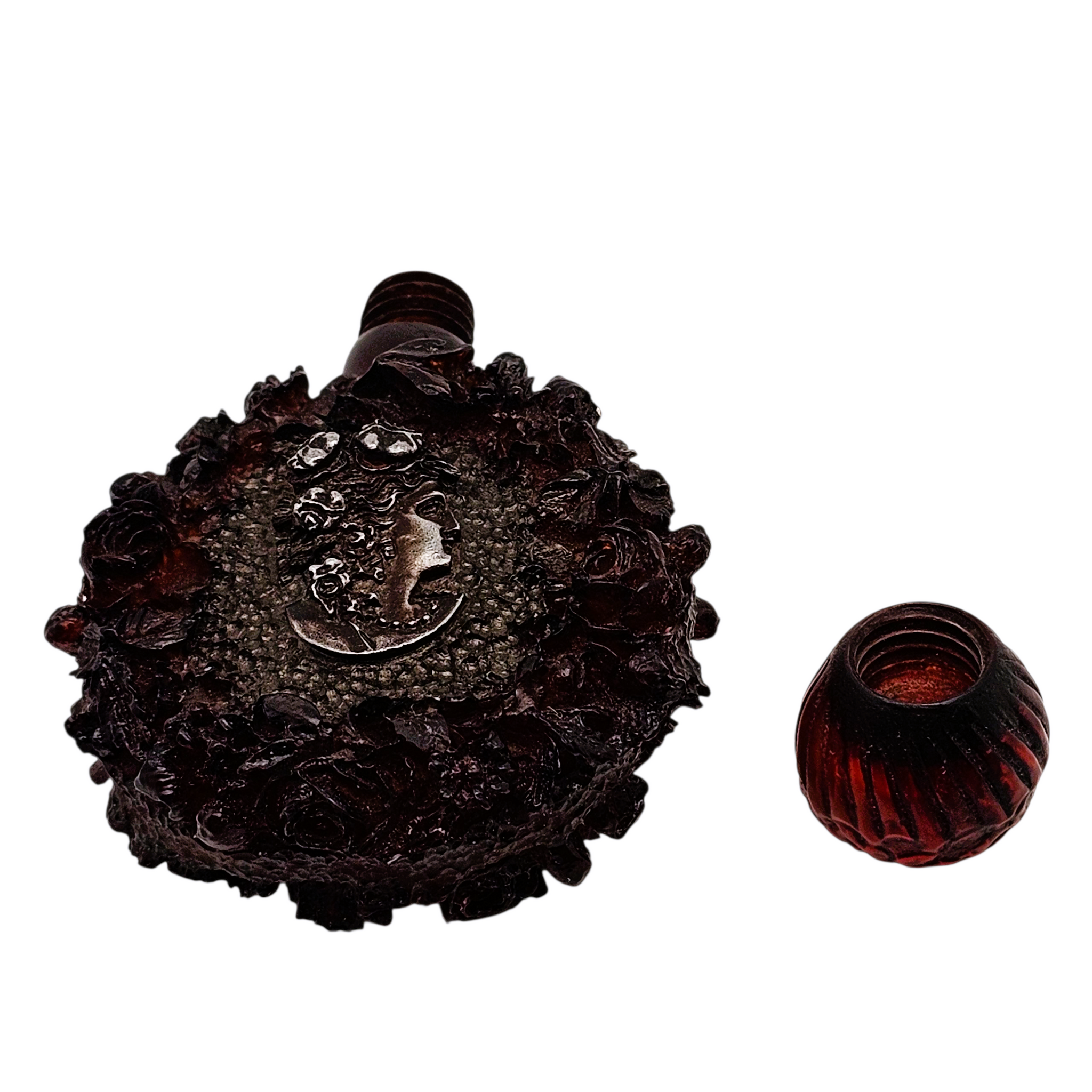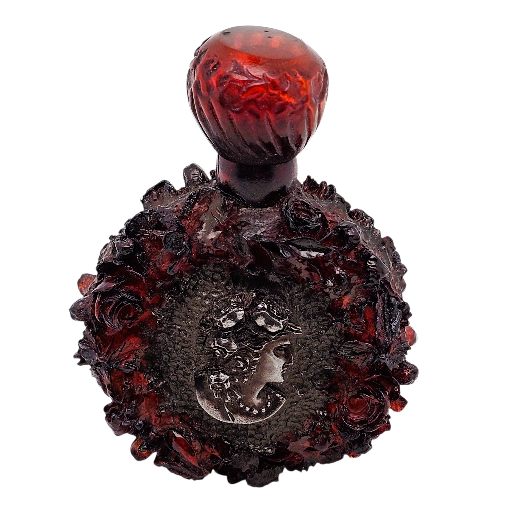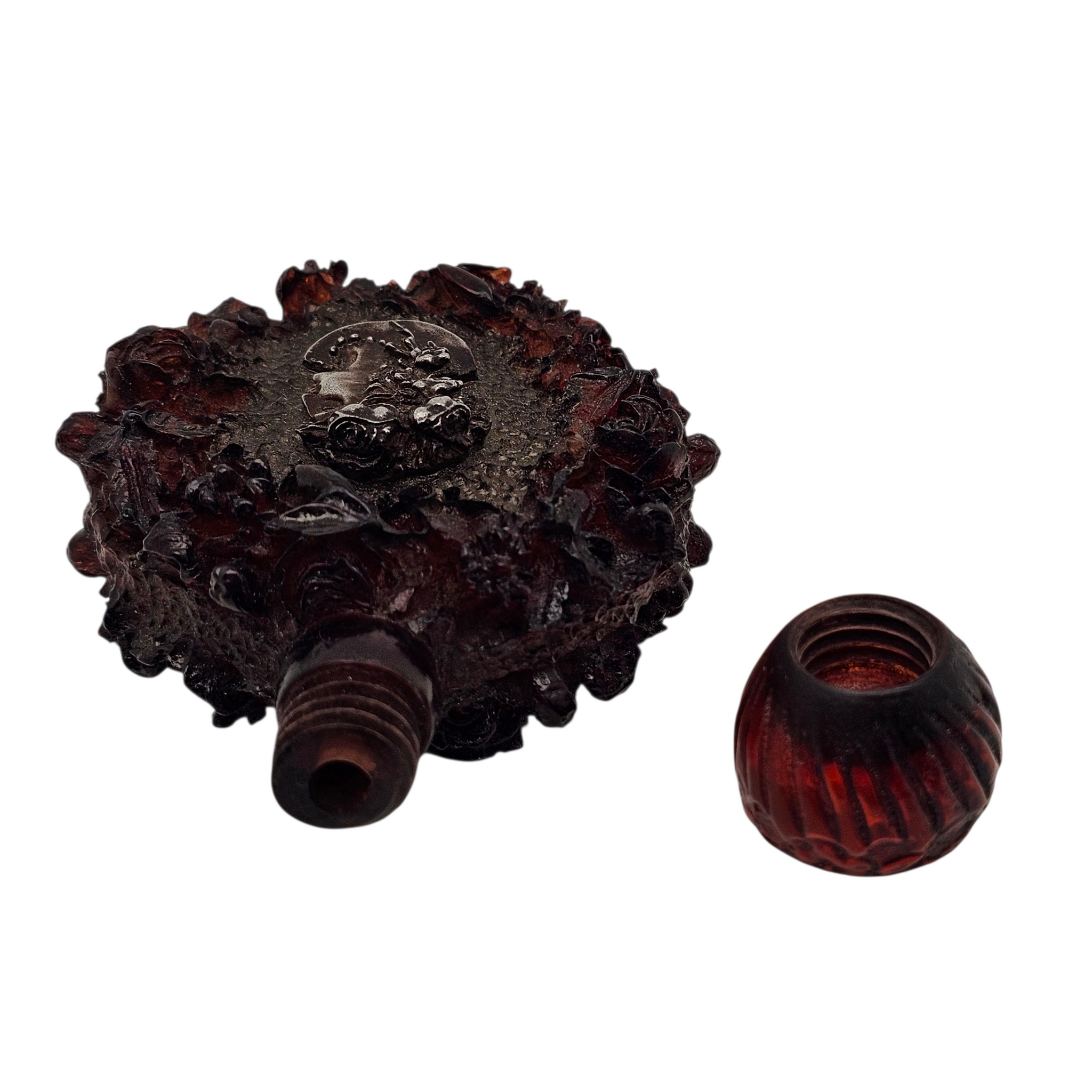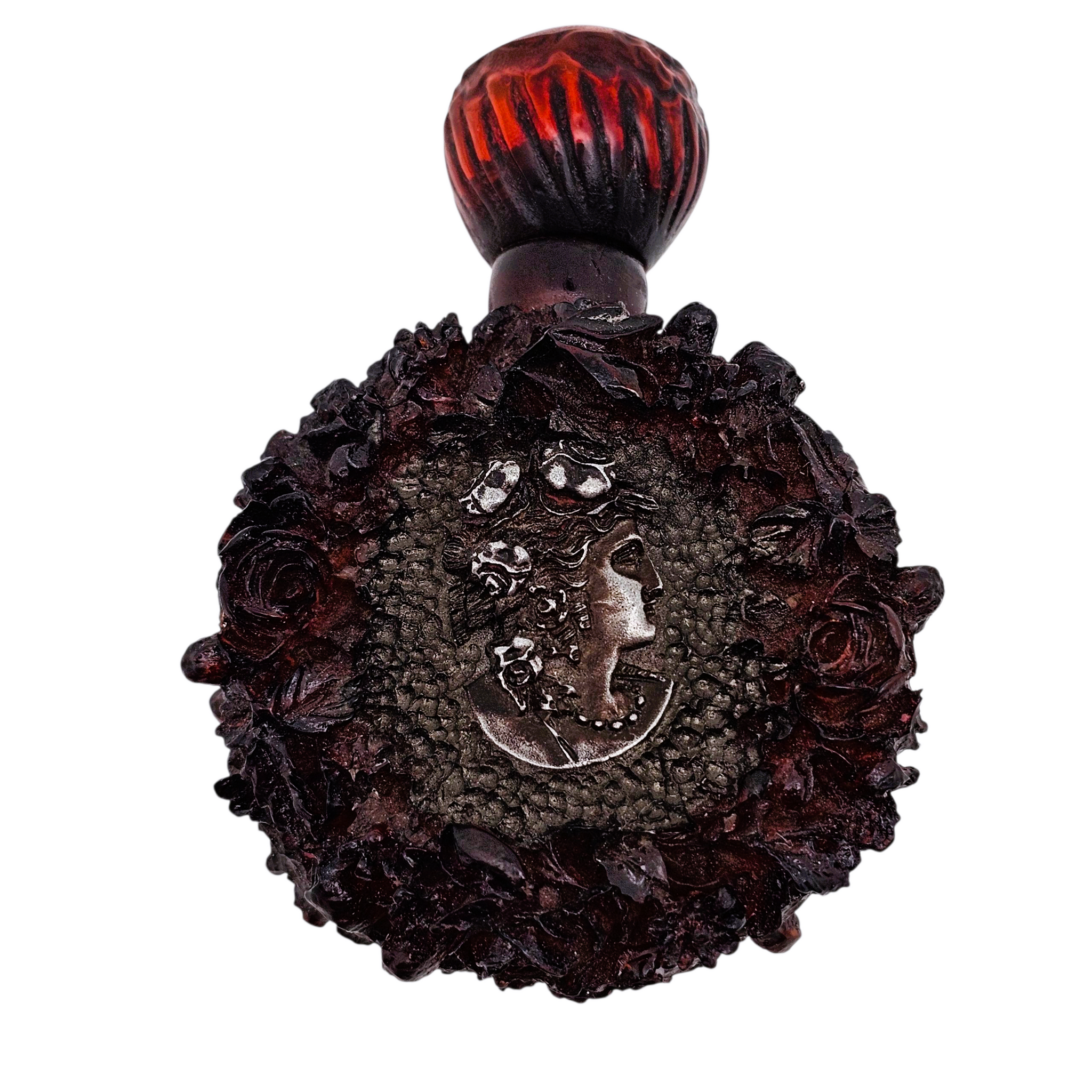 Sous la lumière, la bakélite s’embrase de reflets cuivrés, donnant à ce flacon l’éclat d’un camée vivant.