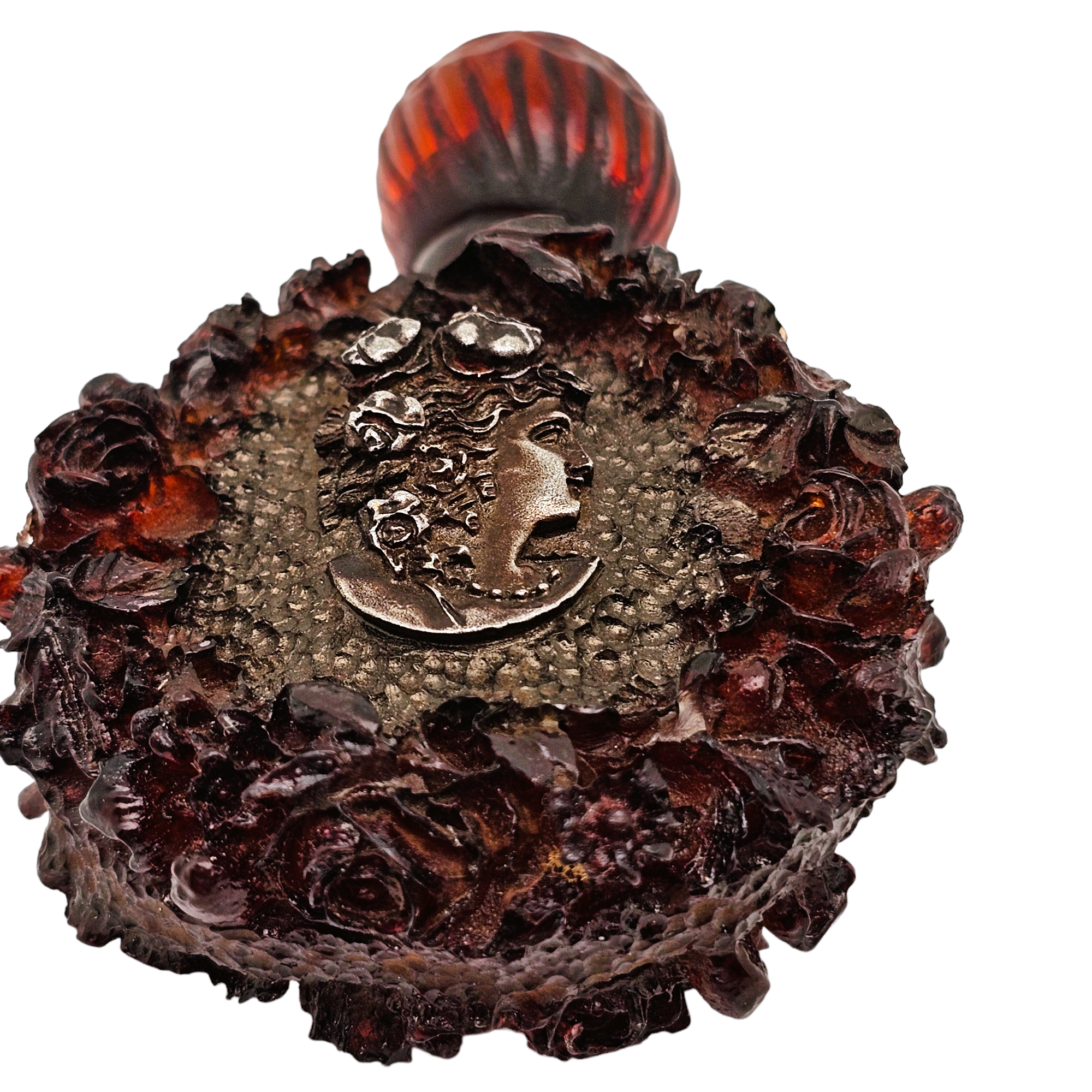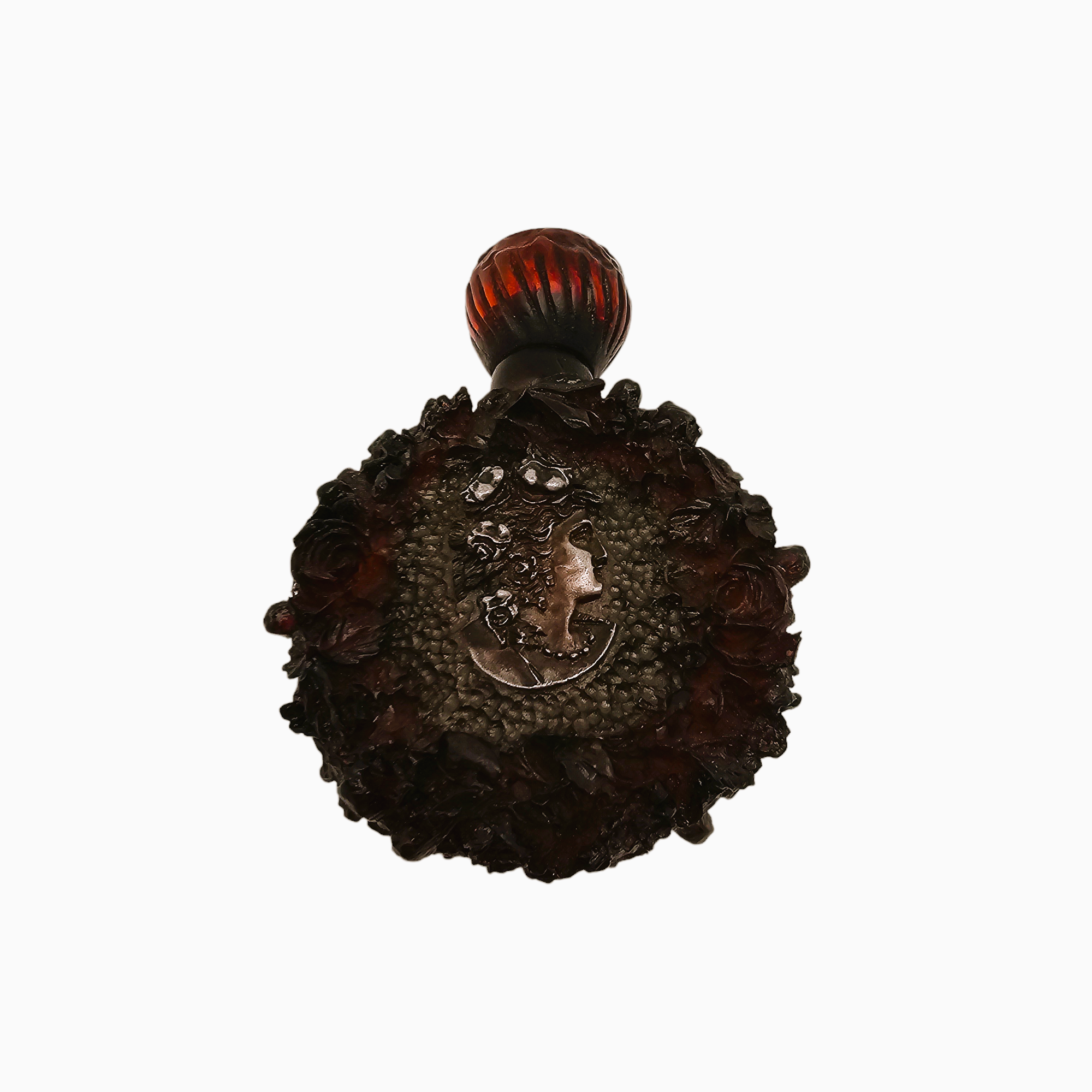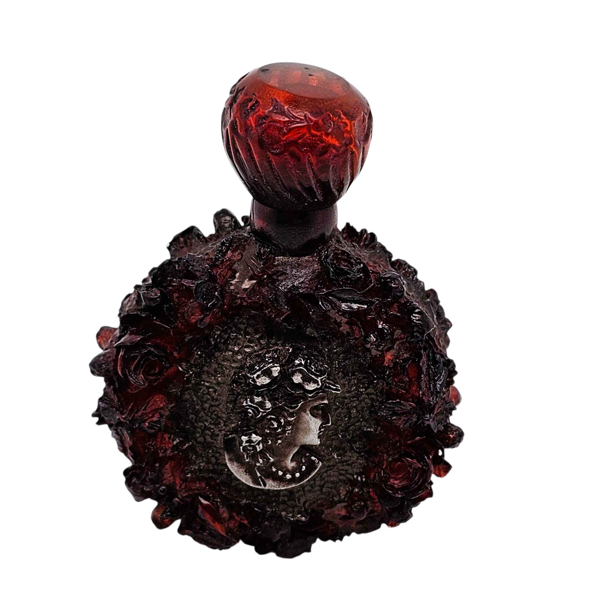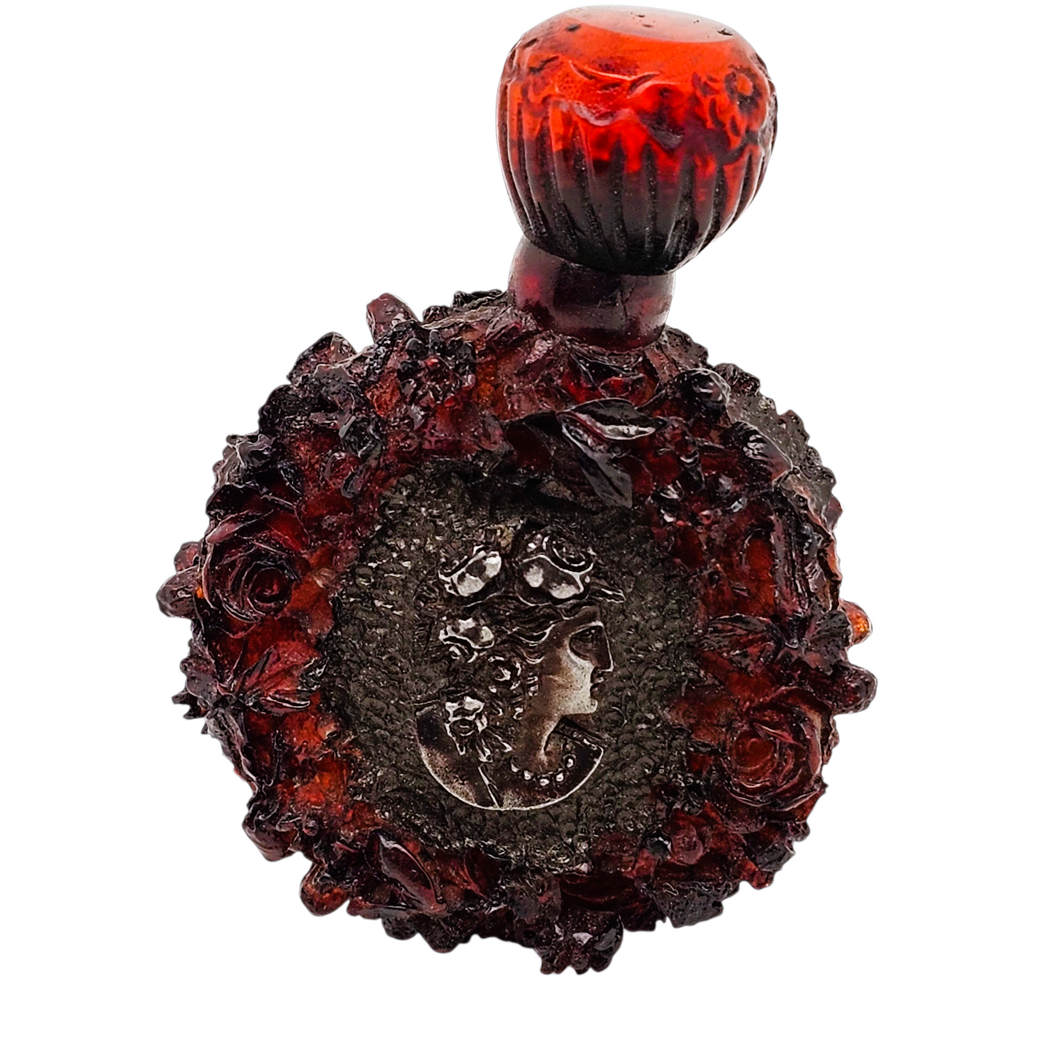 Sous la lumière, la bakélite s’embrase de reflets cuivrés, donnant à ce flacon l’éclat d’un camée vivant.