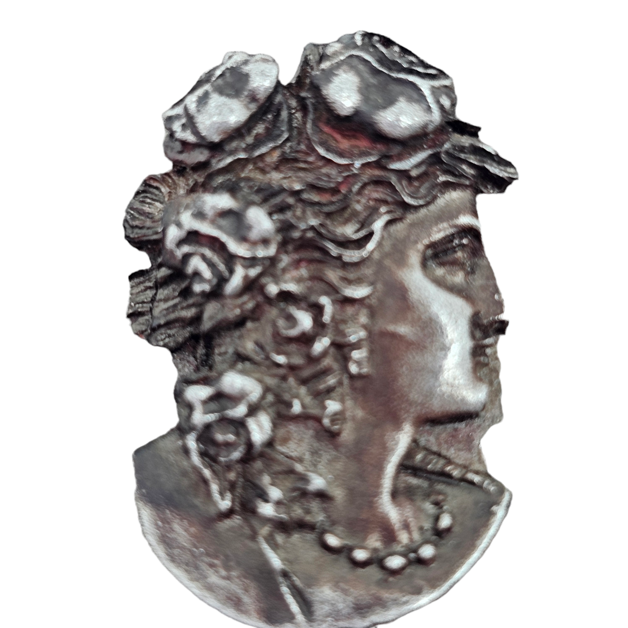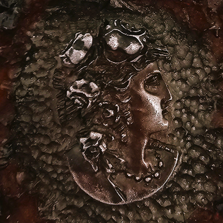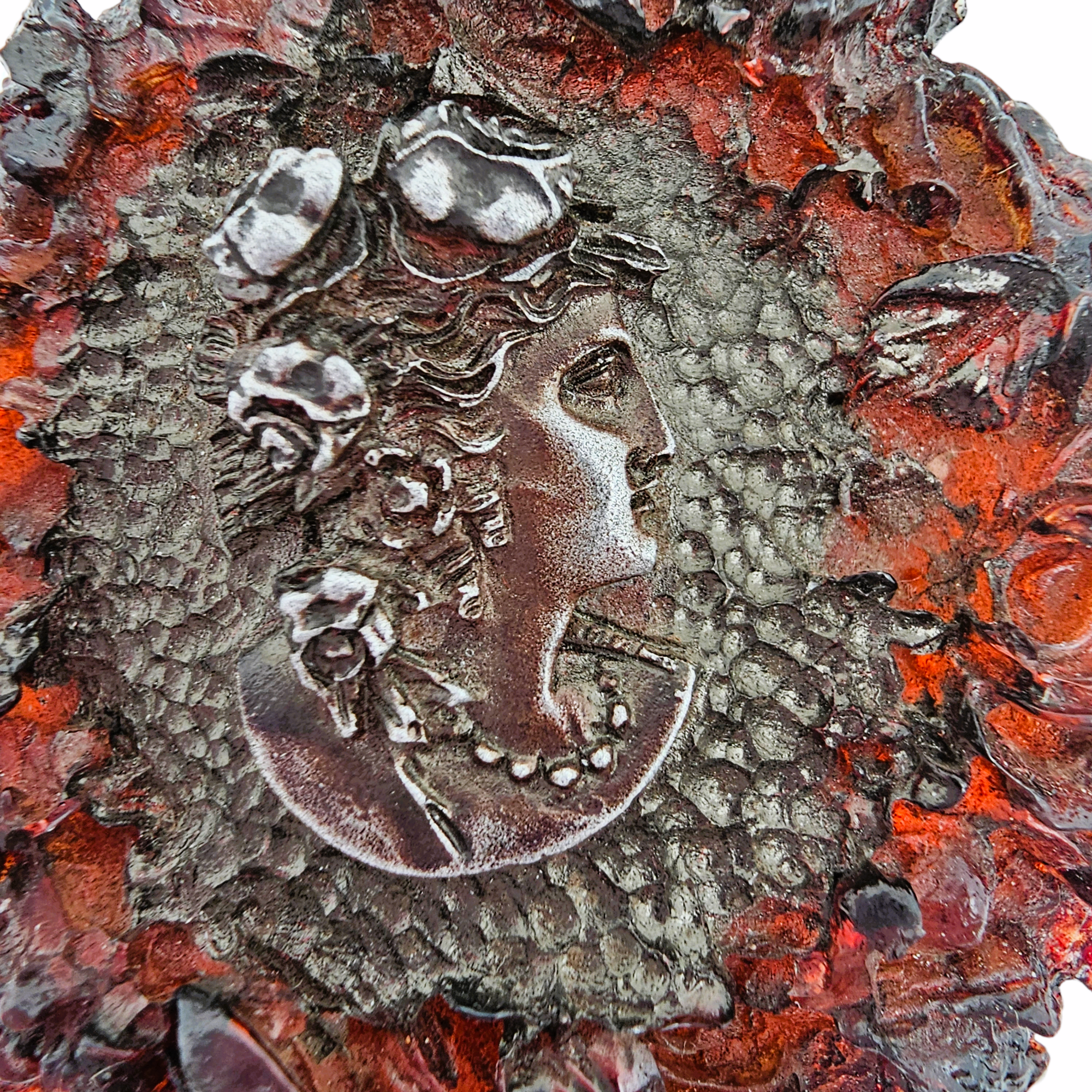 Les deux médaillons en métal finement estampés, représentant une figure féminine fleurie, rappellent les allégories de Flore ou de la Beauté — symboles chers à la Belle Époque.