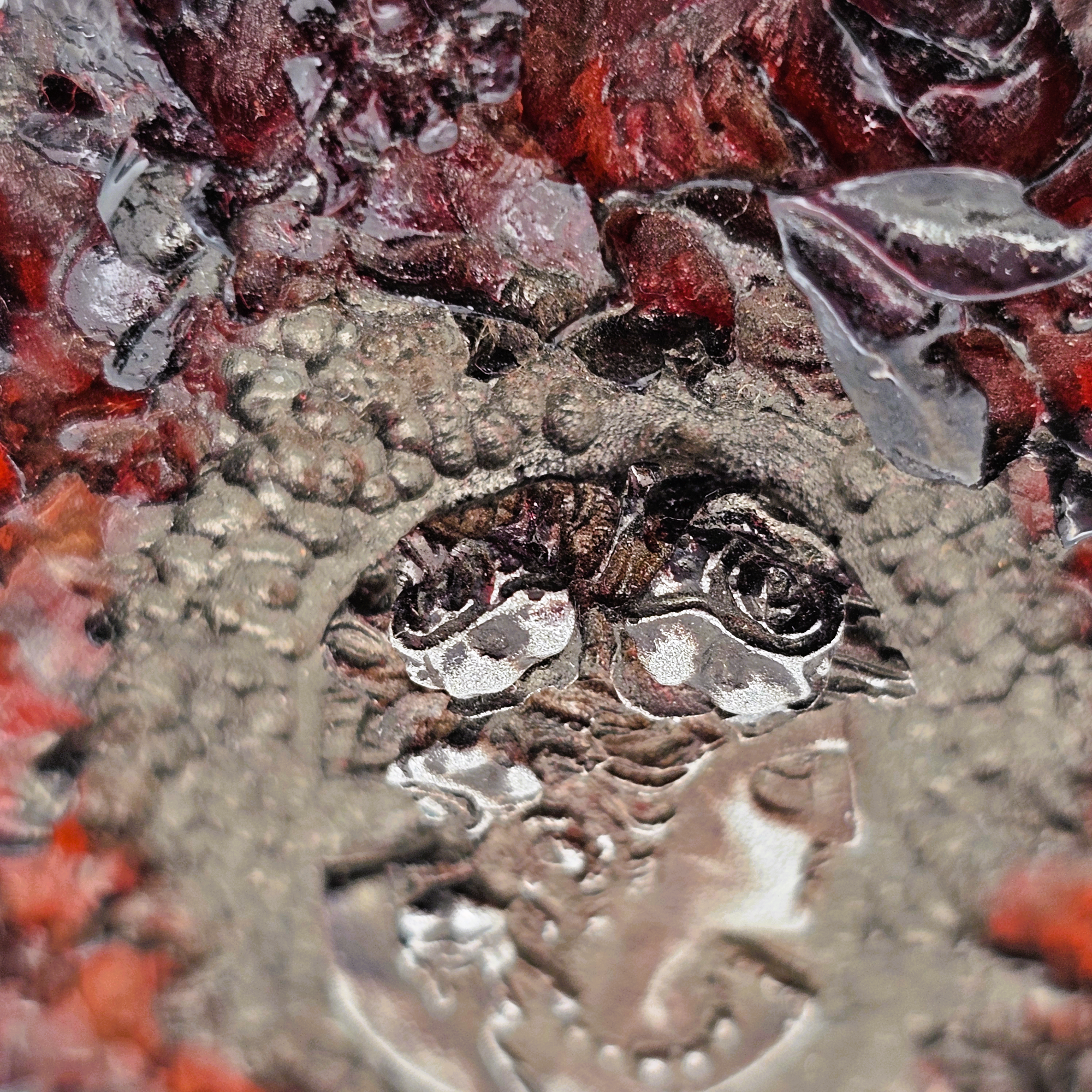 La combinaison du rouge ambré et du métal argenté crée un contraste précieux qui évoque les bijoux anciens.