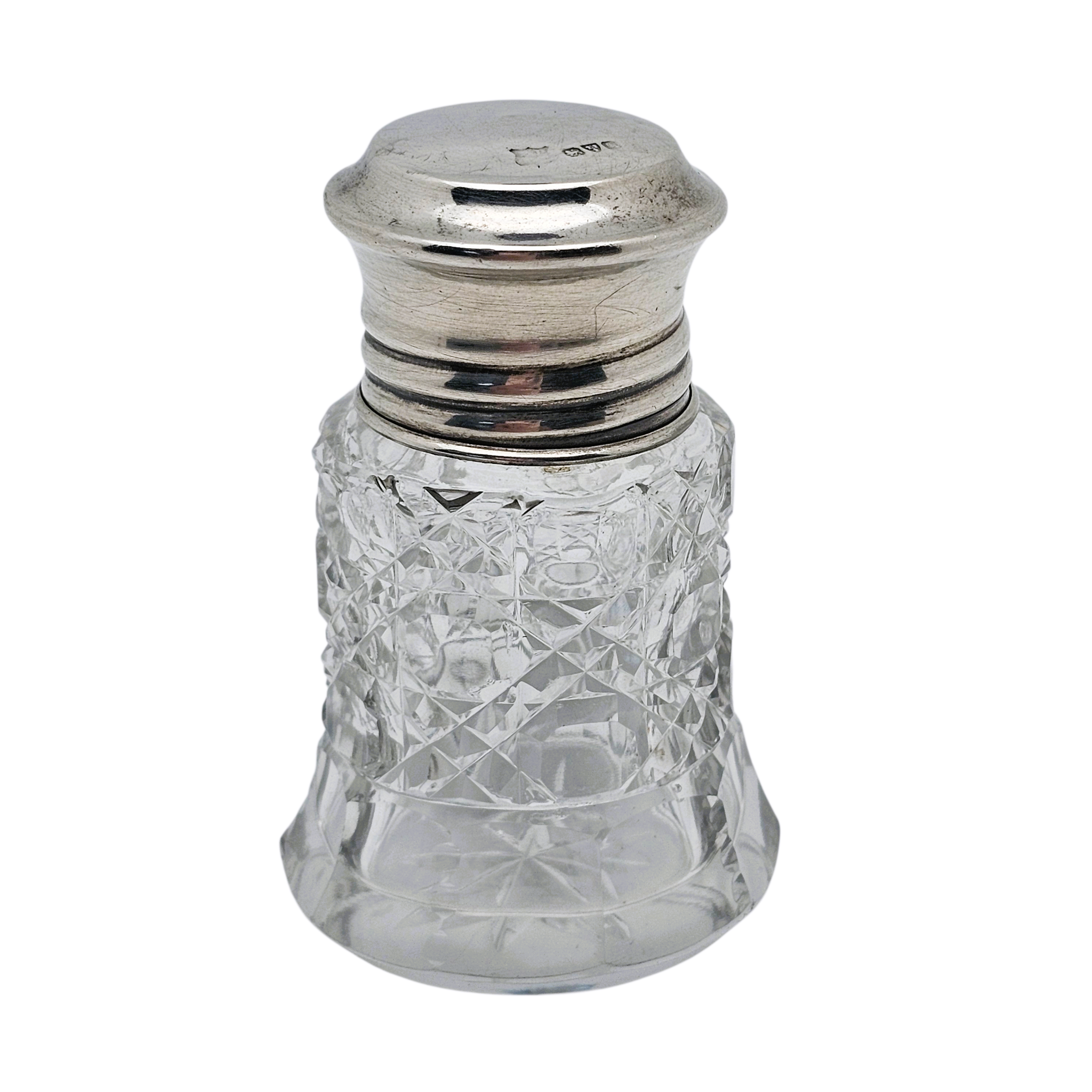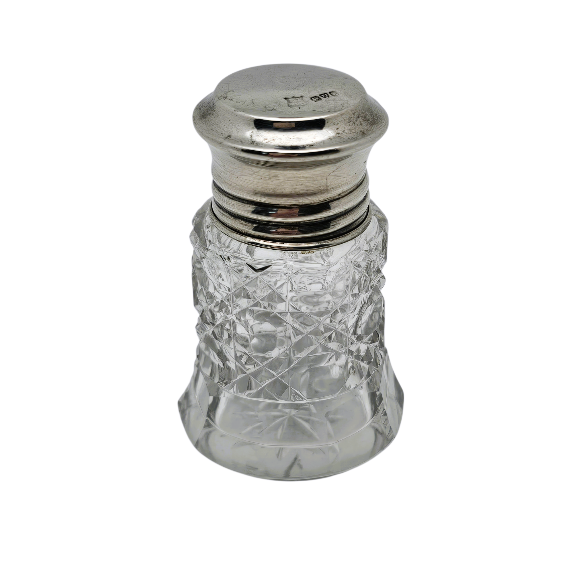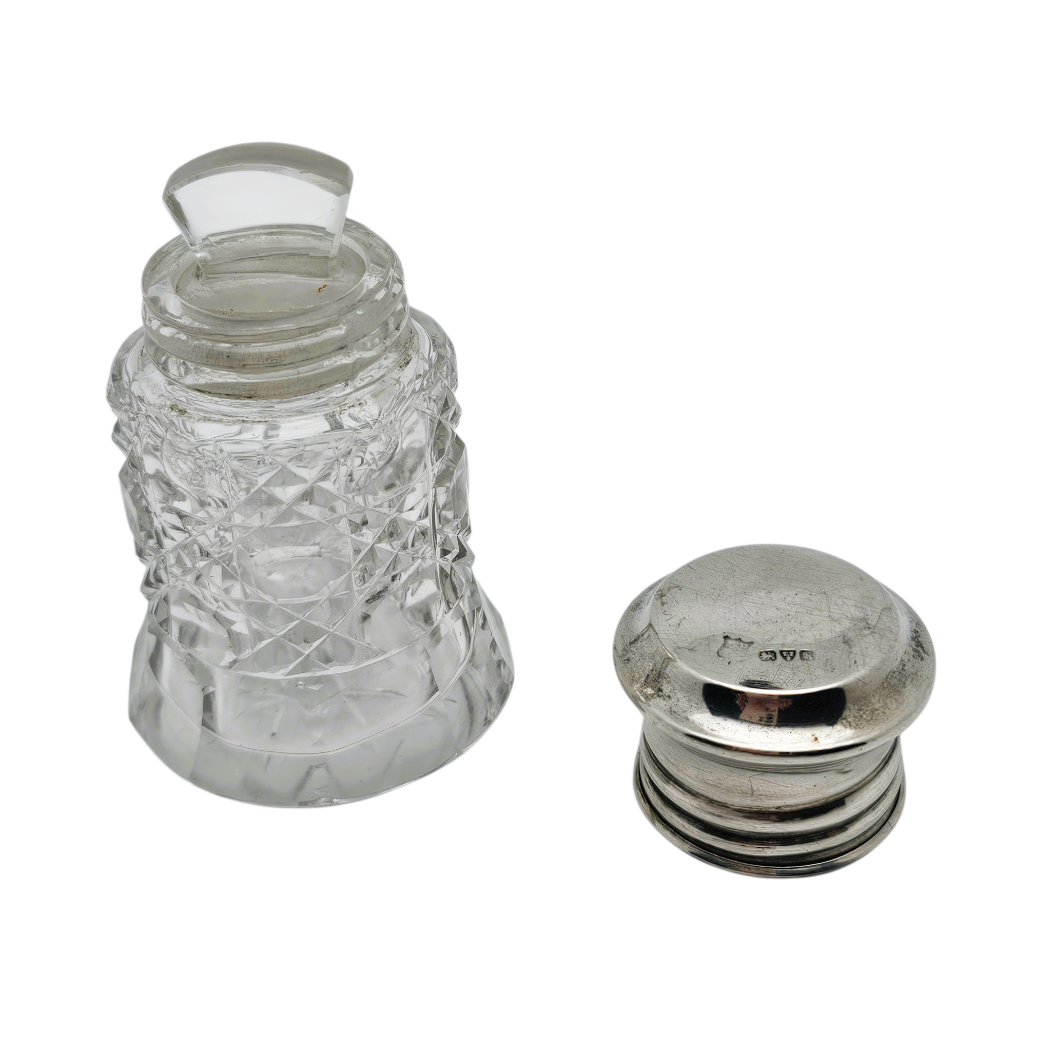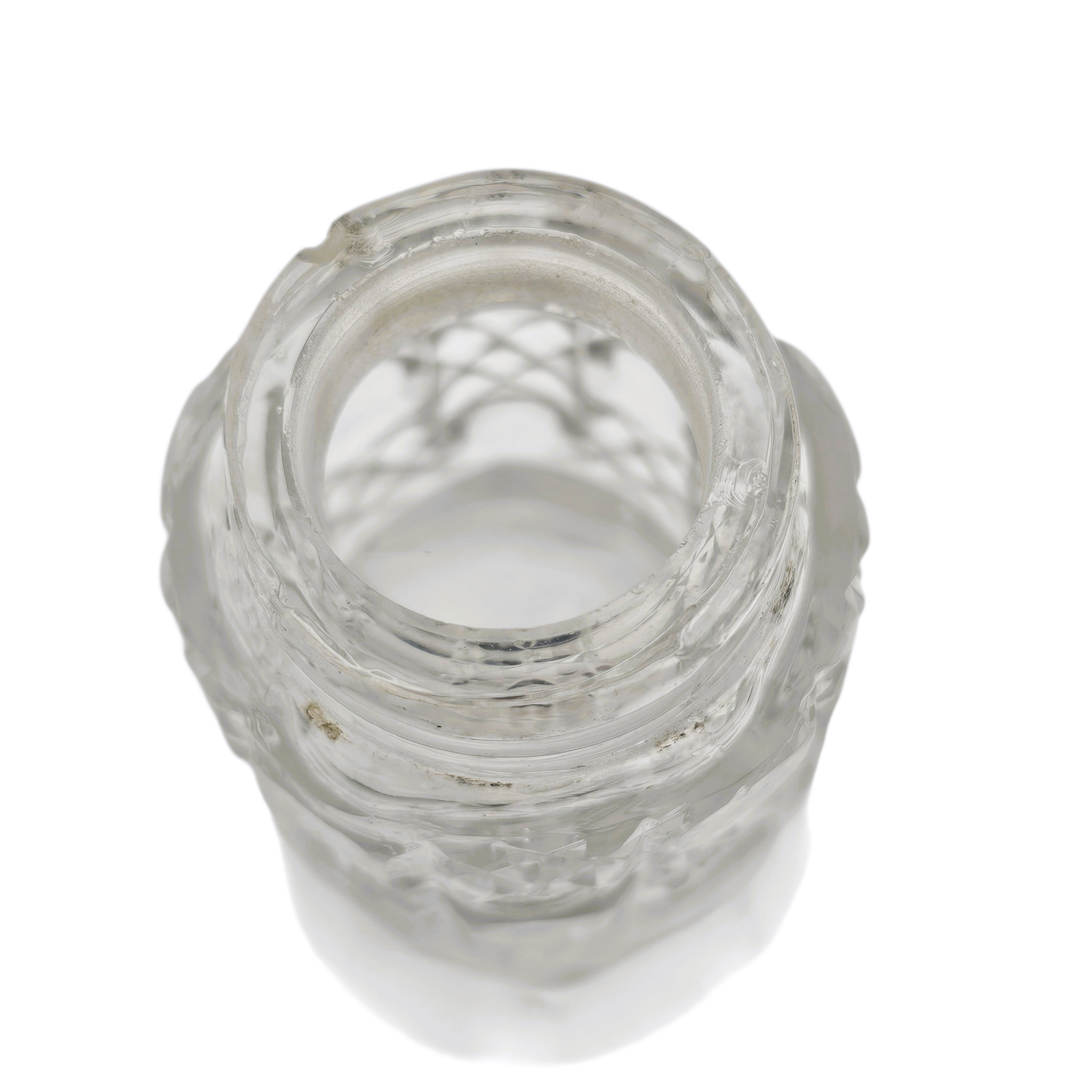 Élégant flacon en cristal taillé, surmonté de son capuchon en argent massif d'origine, parfaitement ajusté. Un petit objet raffiné, à la fois décoratif et chargé d'histoire.