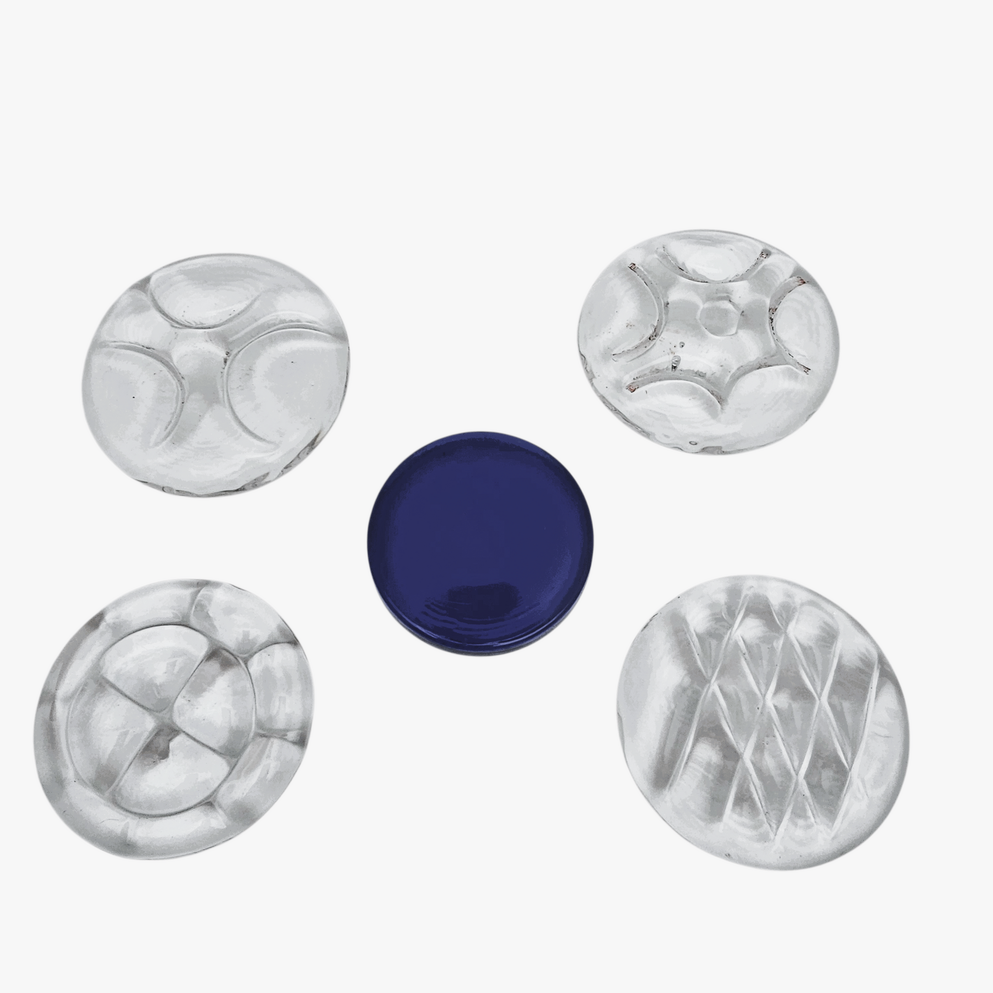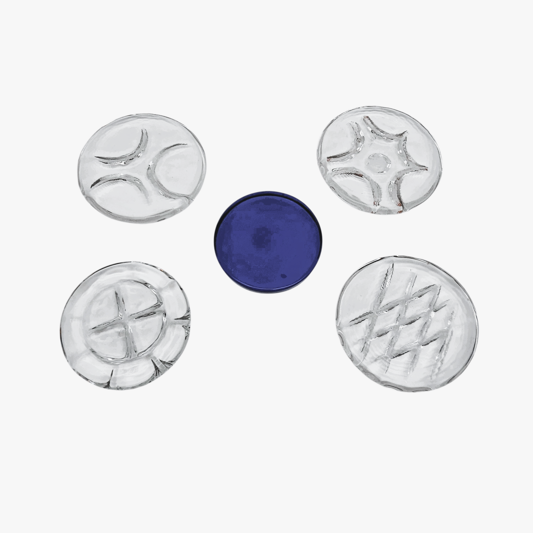 Redécouvrez la poésie des jeux anciens avec ce lot de 5 palets de marelle en verre moulé, chacun doté d'un motif unique : croisillons, stries profondes, pastilles en relief… et un superbe palet bleu qui apporte une touche chaleureuse à l'ensemble.