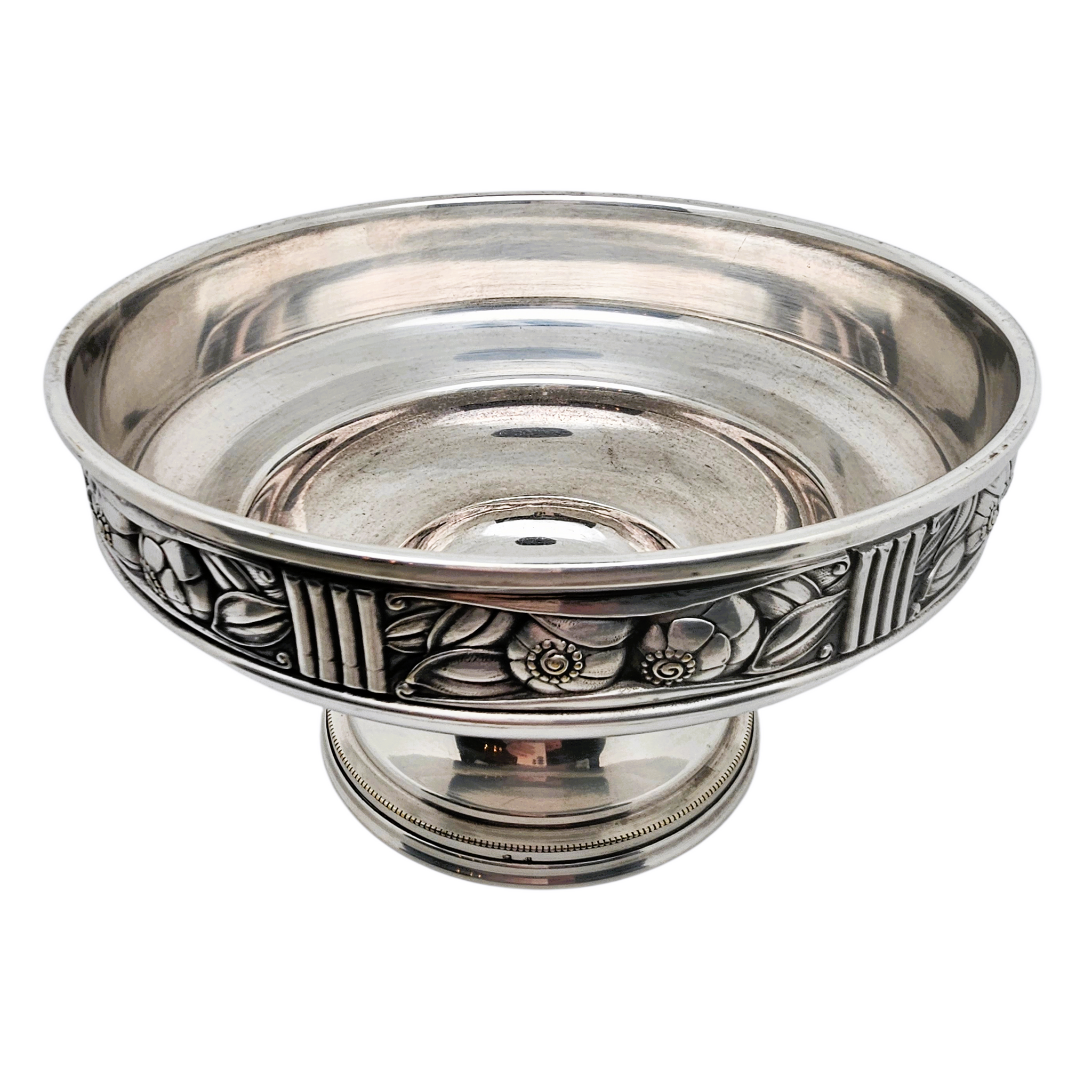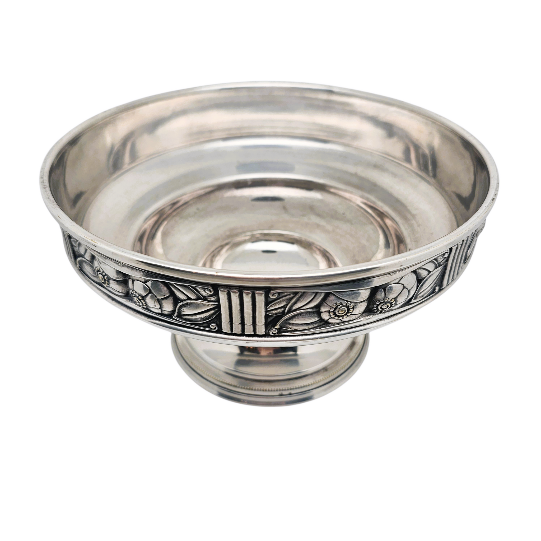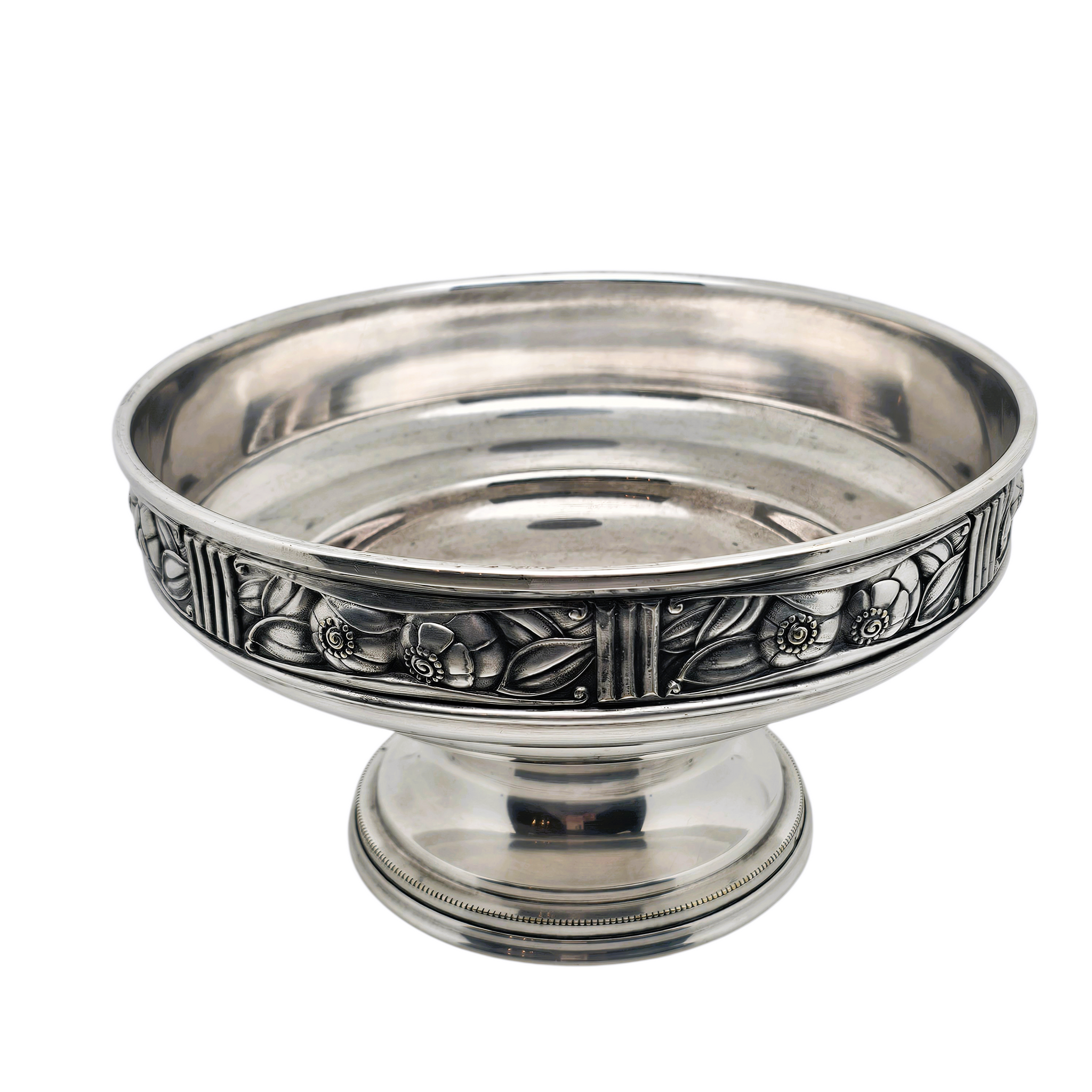 Élégante coupe à fruits sur piédouche en métal argenté, caractéristique du style Art déco des années 1920–1930.