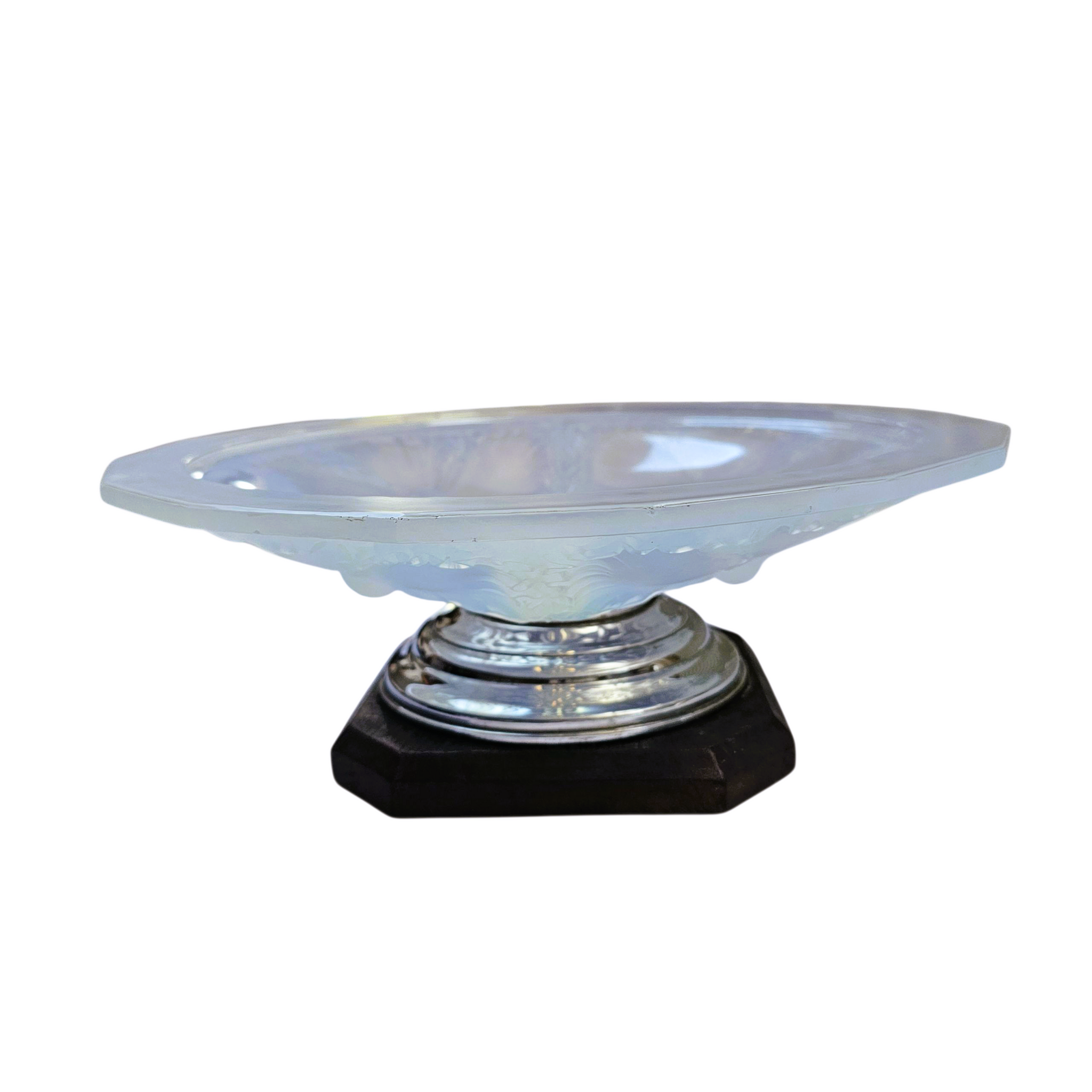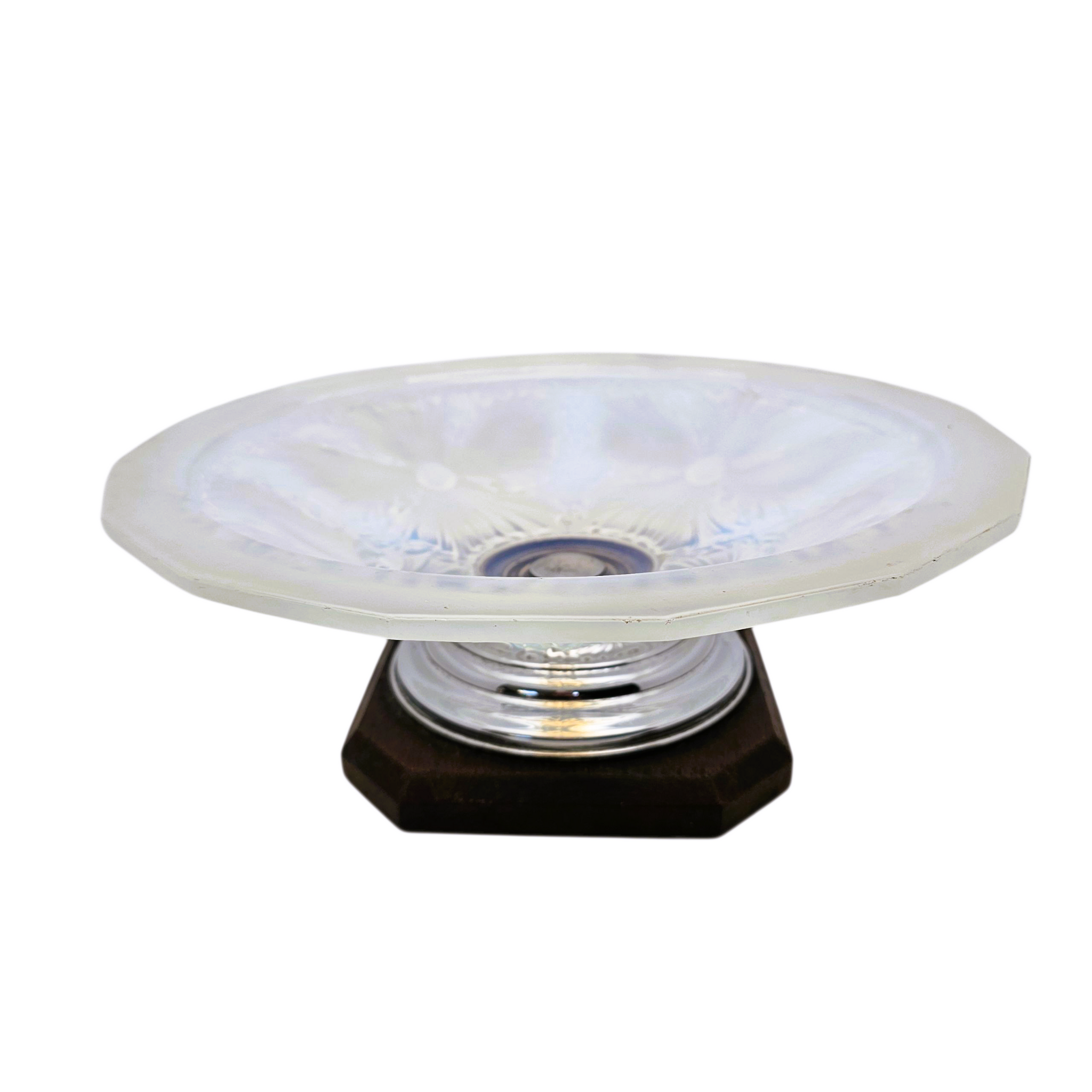 Elle repose sur une monture chromée fixée à une base en bois sombre. Une pièce décorative d’une grande élégance, parfaite en centre de table ou pour compléter une collection de verrerie Art déco.