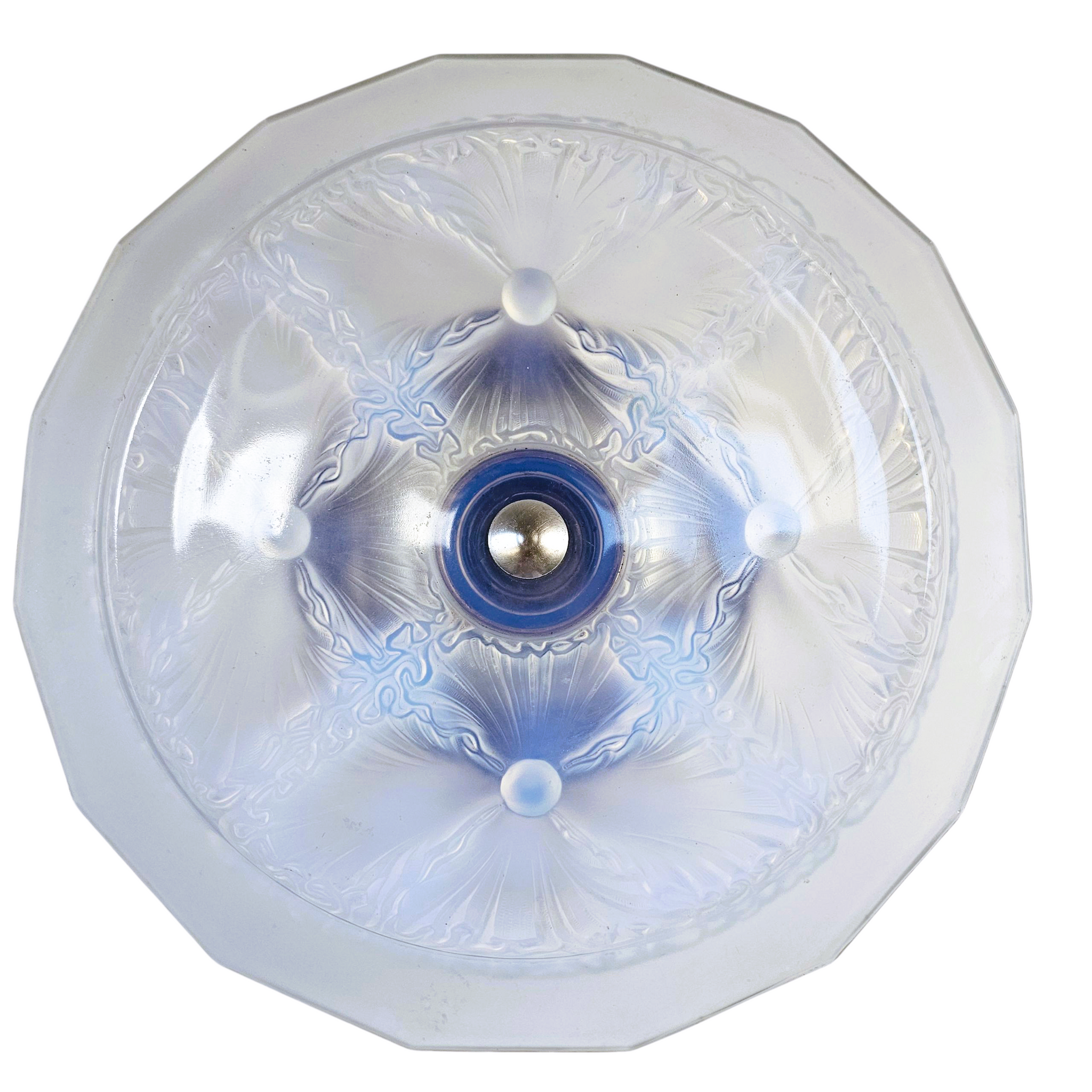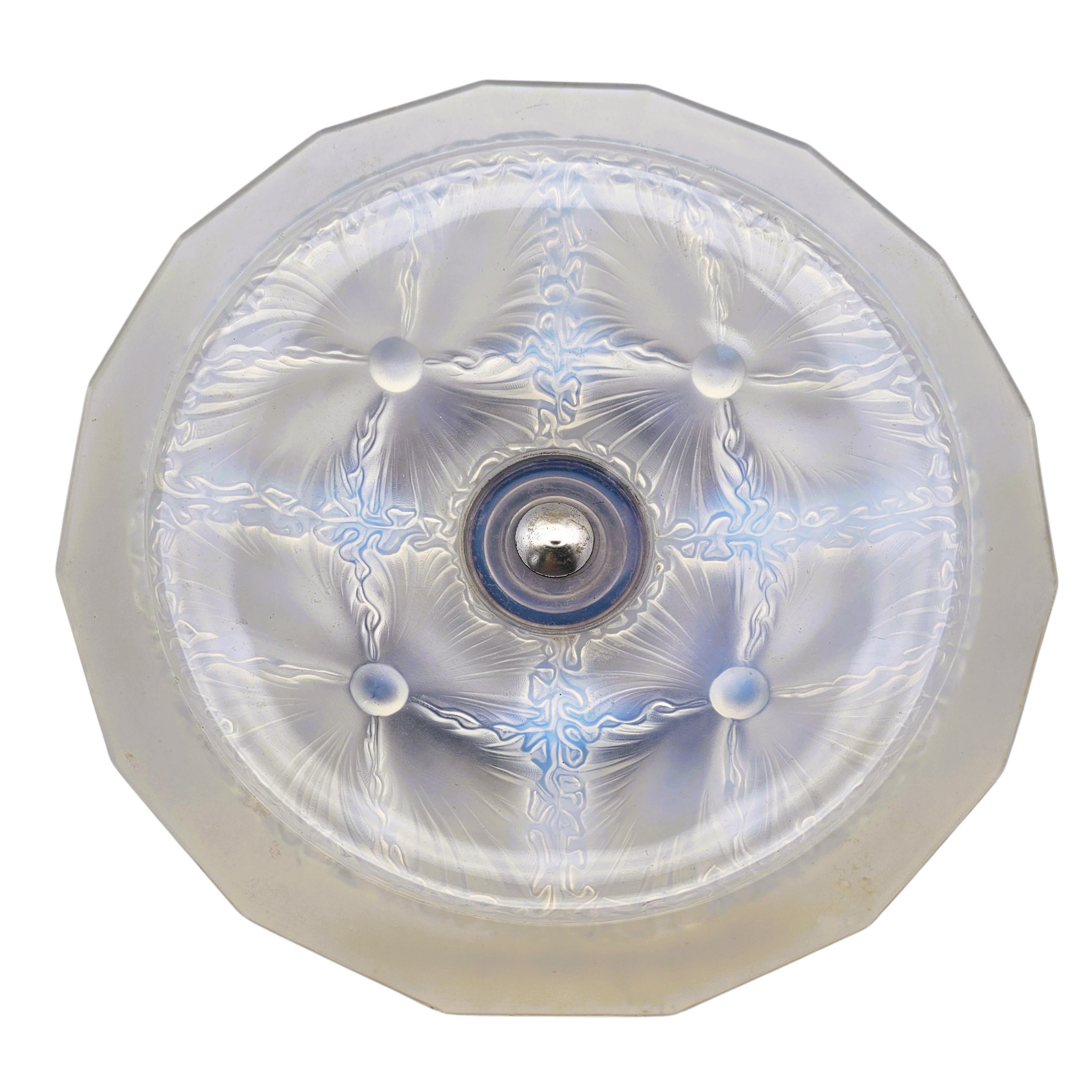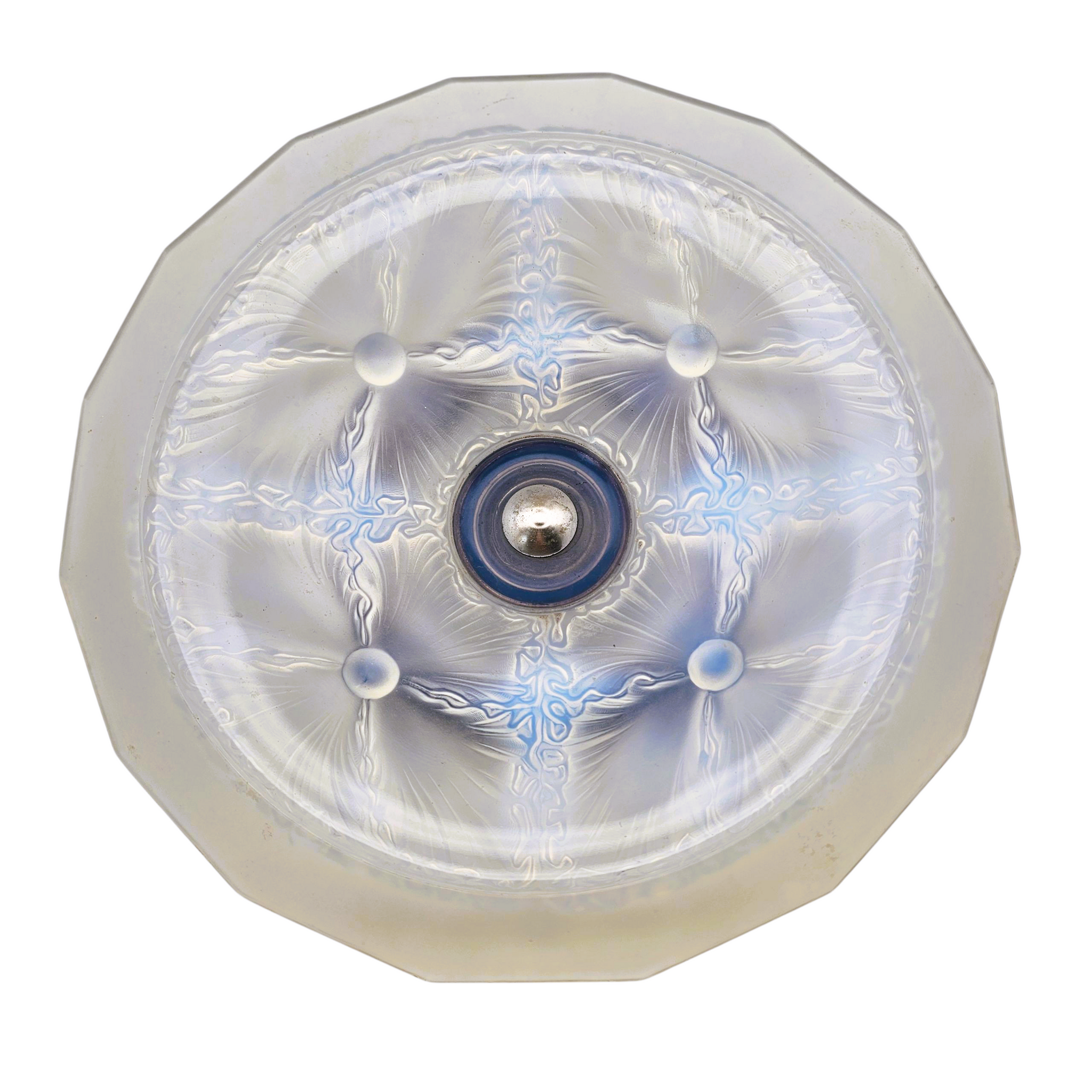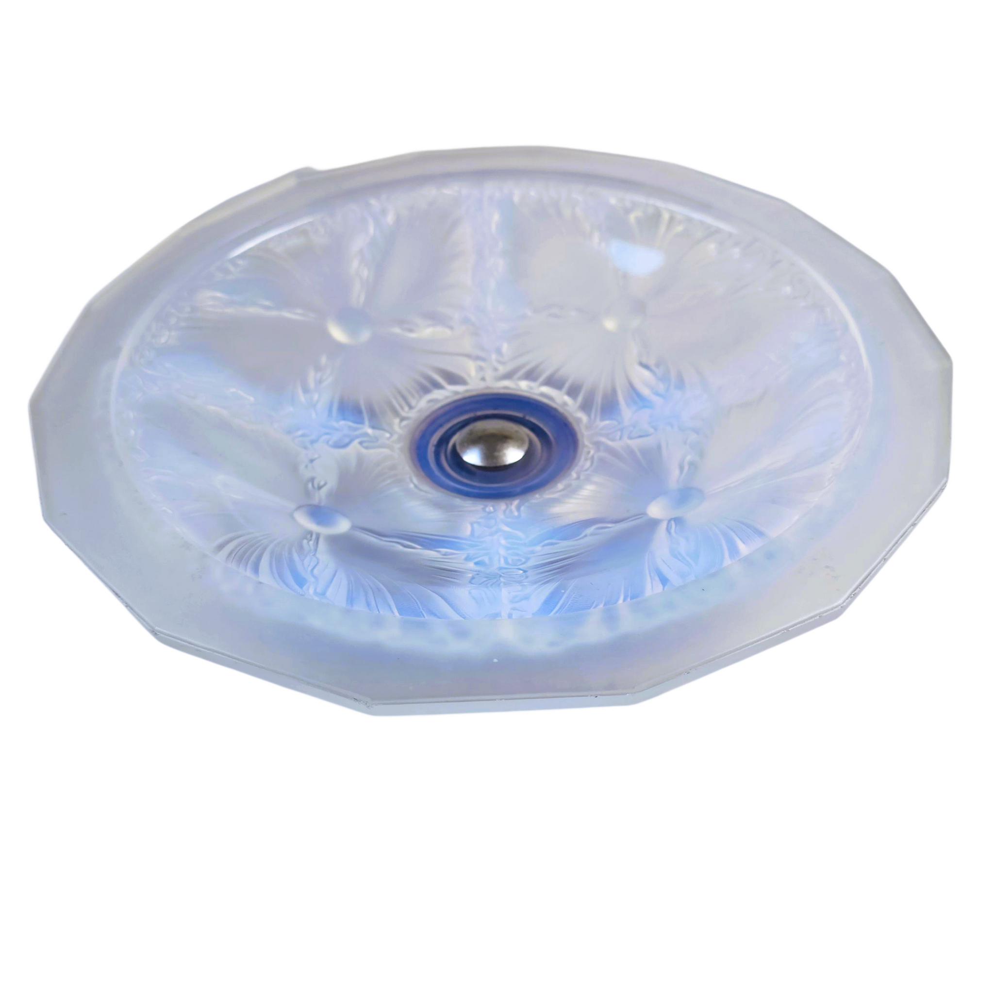 Superbe coupe Art déco en verre opalescent moulé, dont les reflets bleutés et laiteux changent au gré de la lumière. Le décor stylisé de motifs floraux en croix avec cabochons s’inscrit dans une forme circulaire à 16 pans coupés, typique du design géométrique des années 1930.