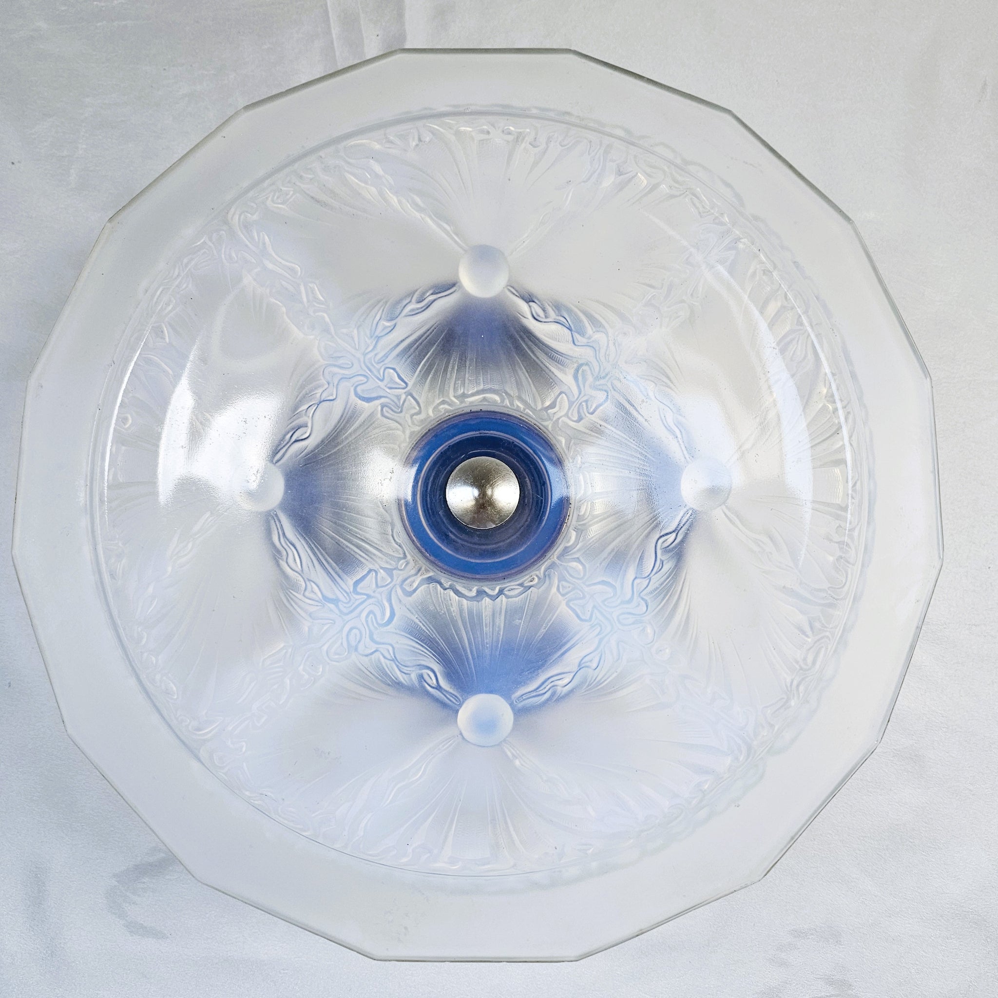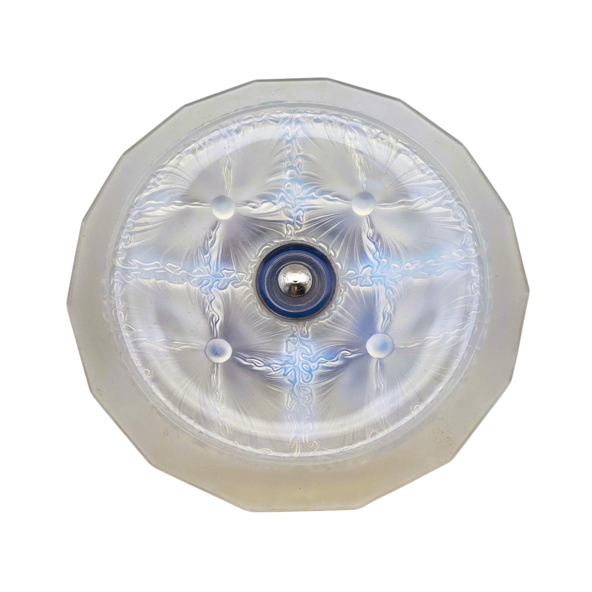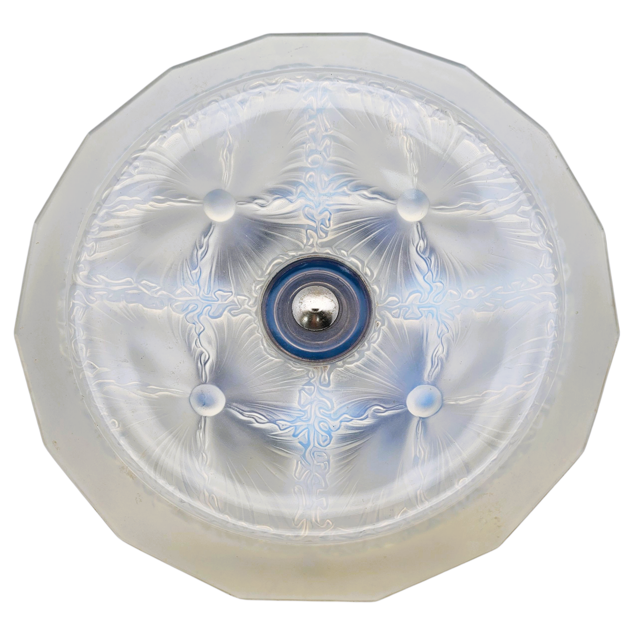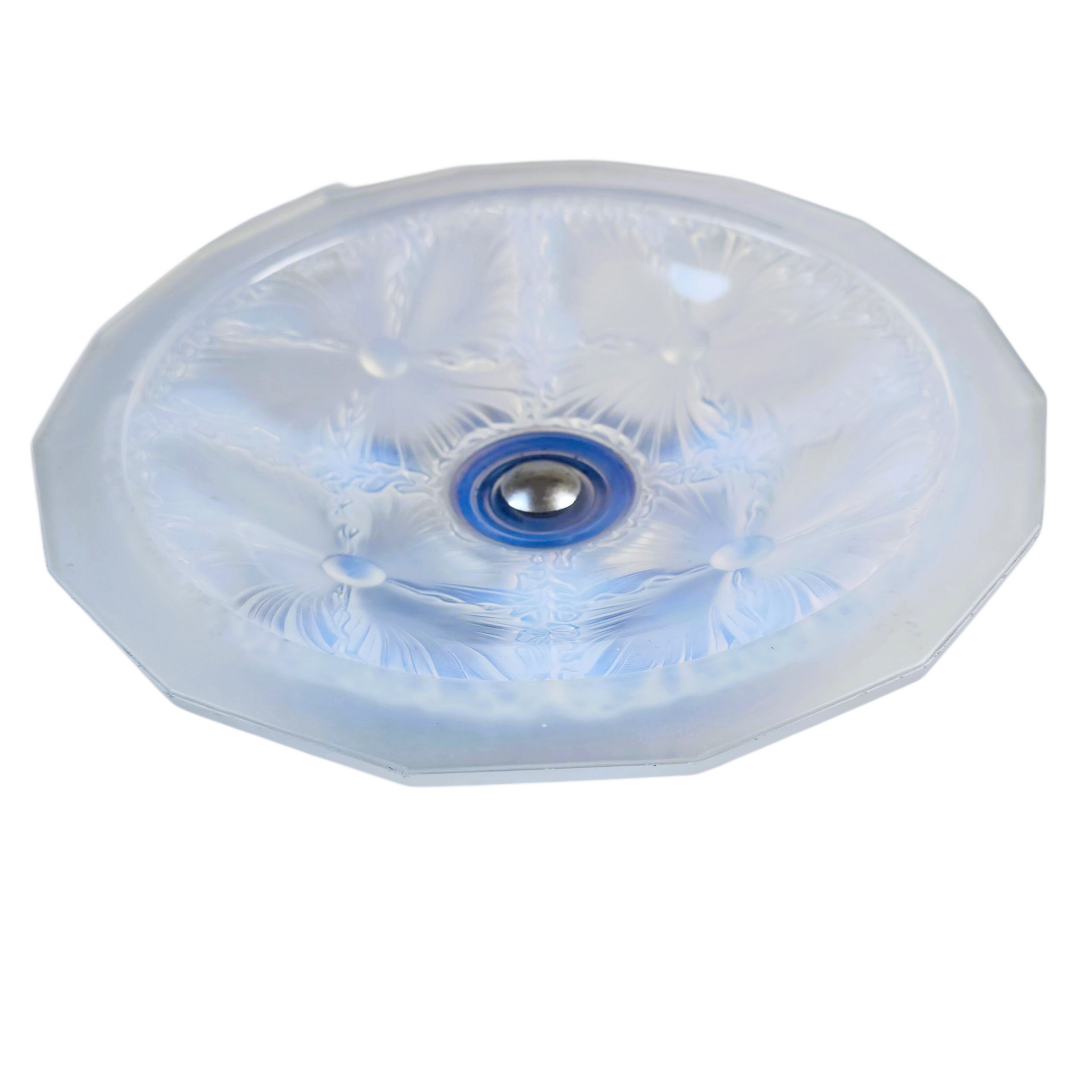 Superbe coupe Art déco en verre opalescent moulé, dont les reflets bleutés et laiteux changent au gré de la lumière. Le décor stylisé de motifs floraux en croix avec cabochons s’inscrit dans une forme circulaire à 16 pans coupés, typique du design géométrique des années 1930.