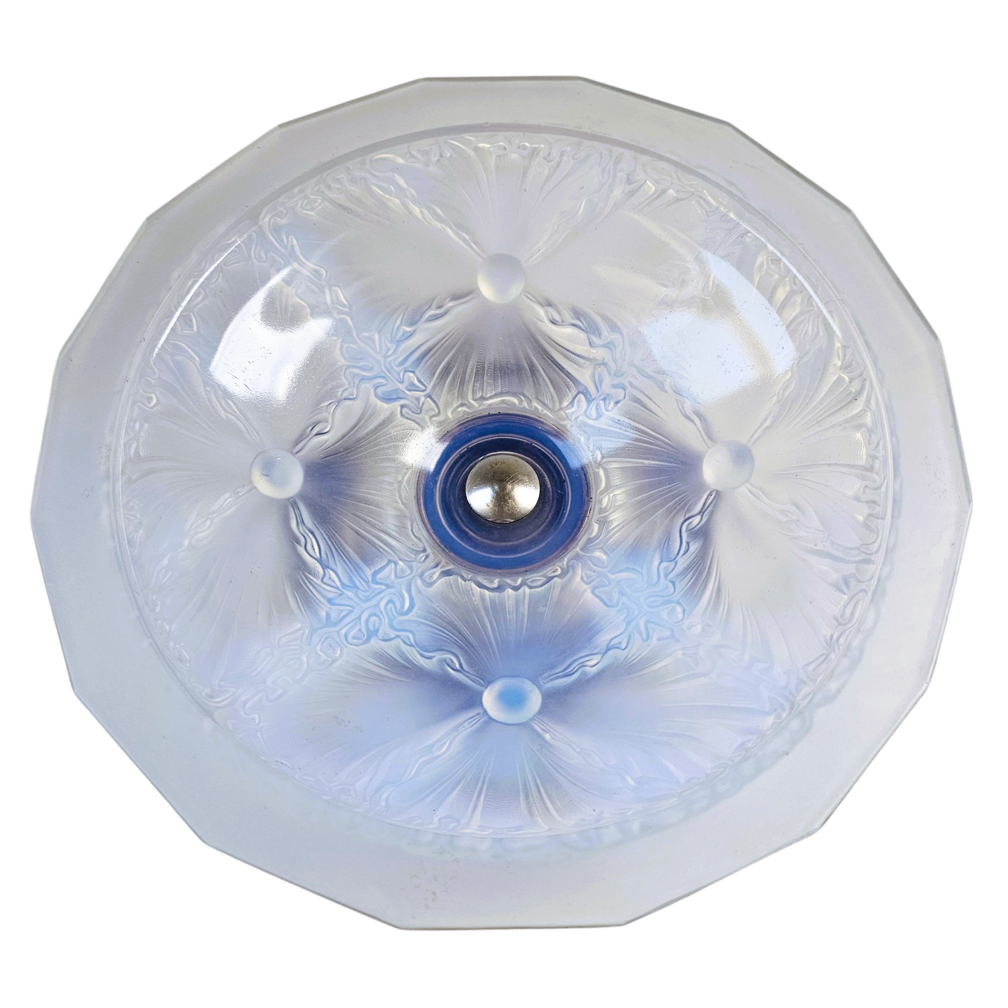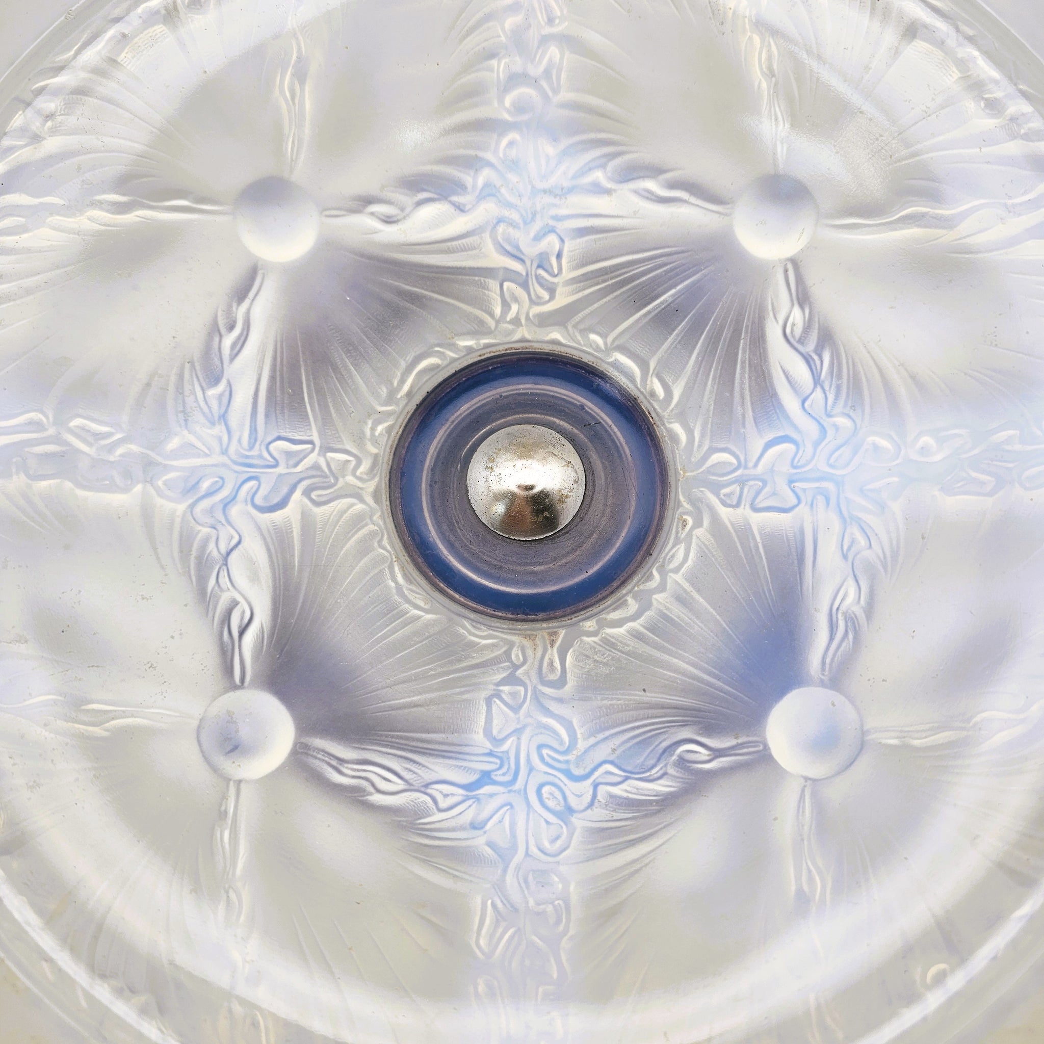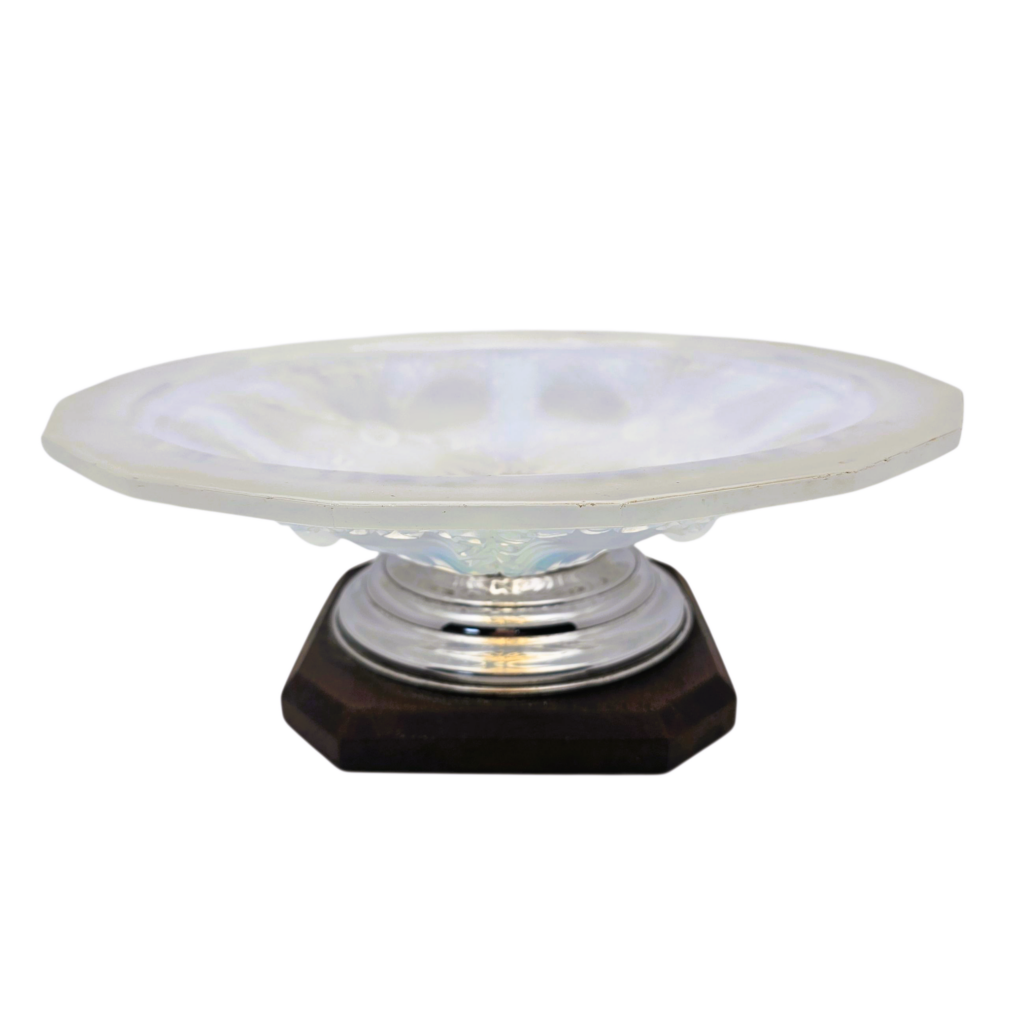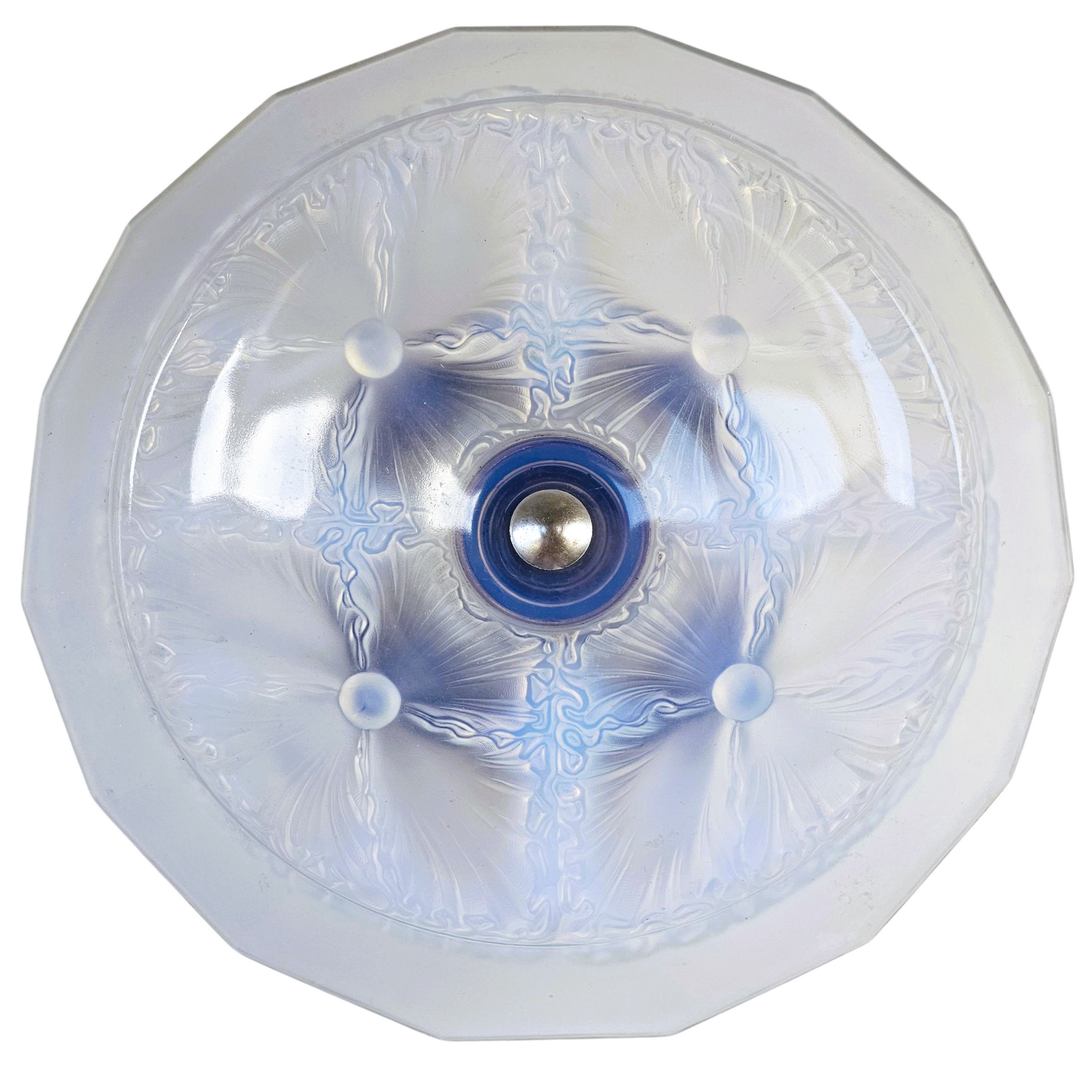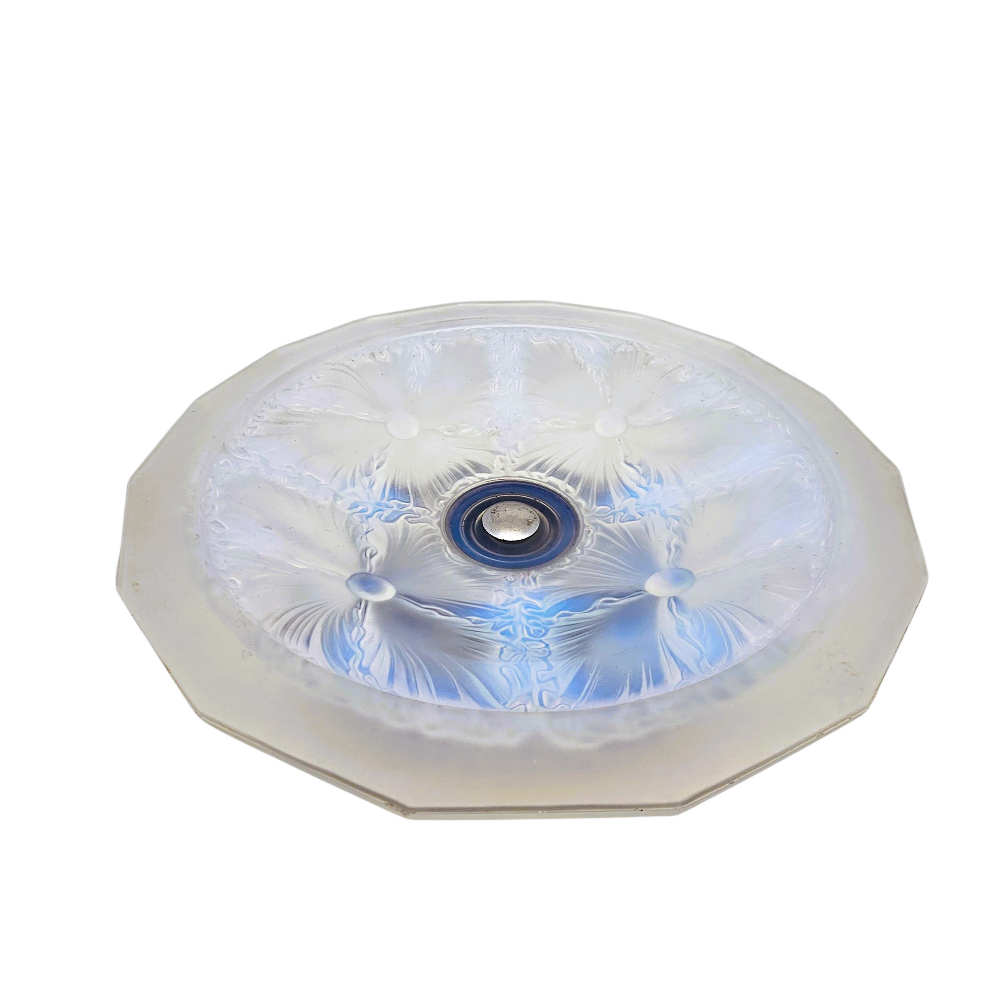 Superbe coupe Art déco en verre opalescent moulé, dont les reflets bleutés et laiteux changent au gré de la lumière. Le décor stylisé de motifs floraux en croix avec cabochons s’inscrit dans une forme circulaire à 16 pans coupés, typique du design géométrique des années 1930.