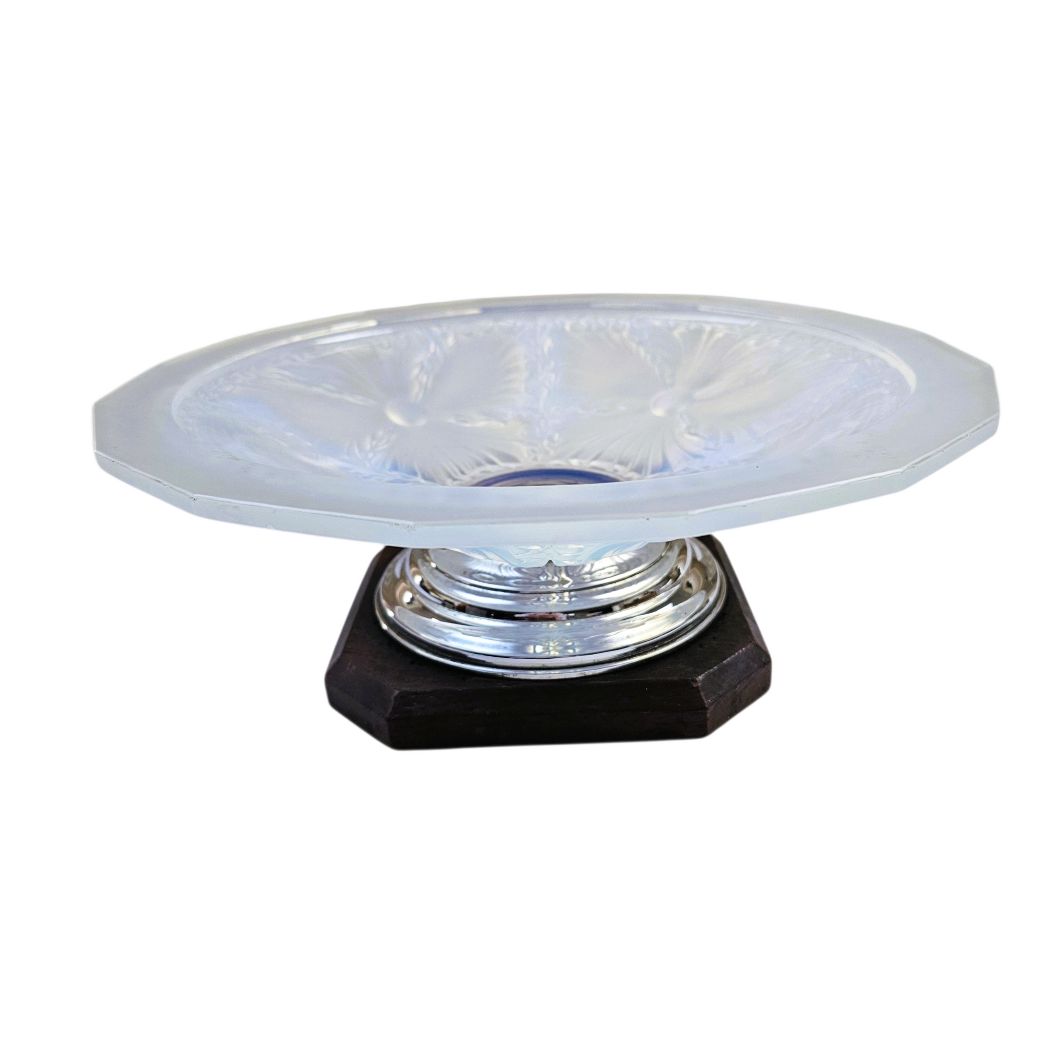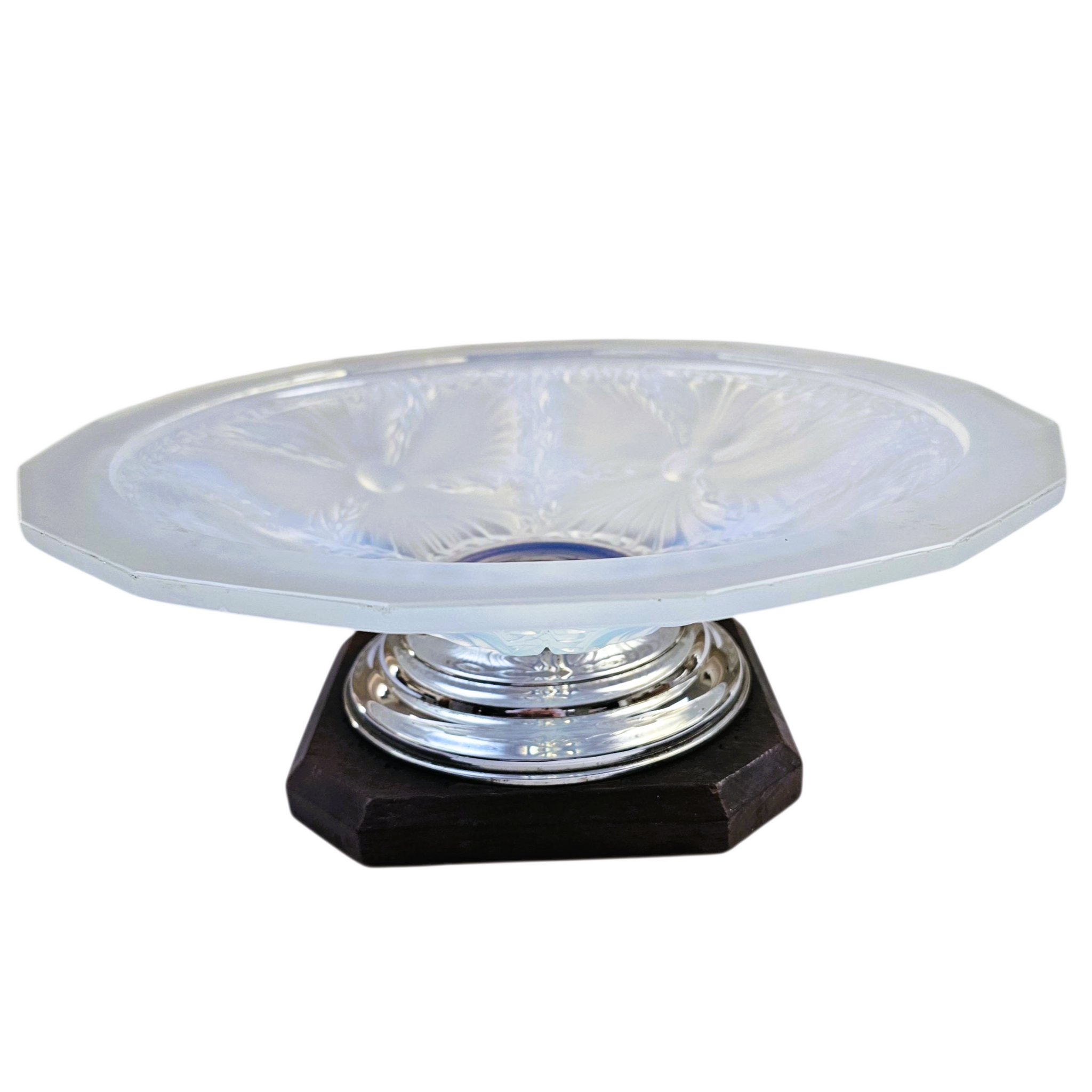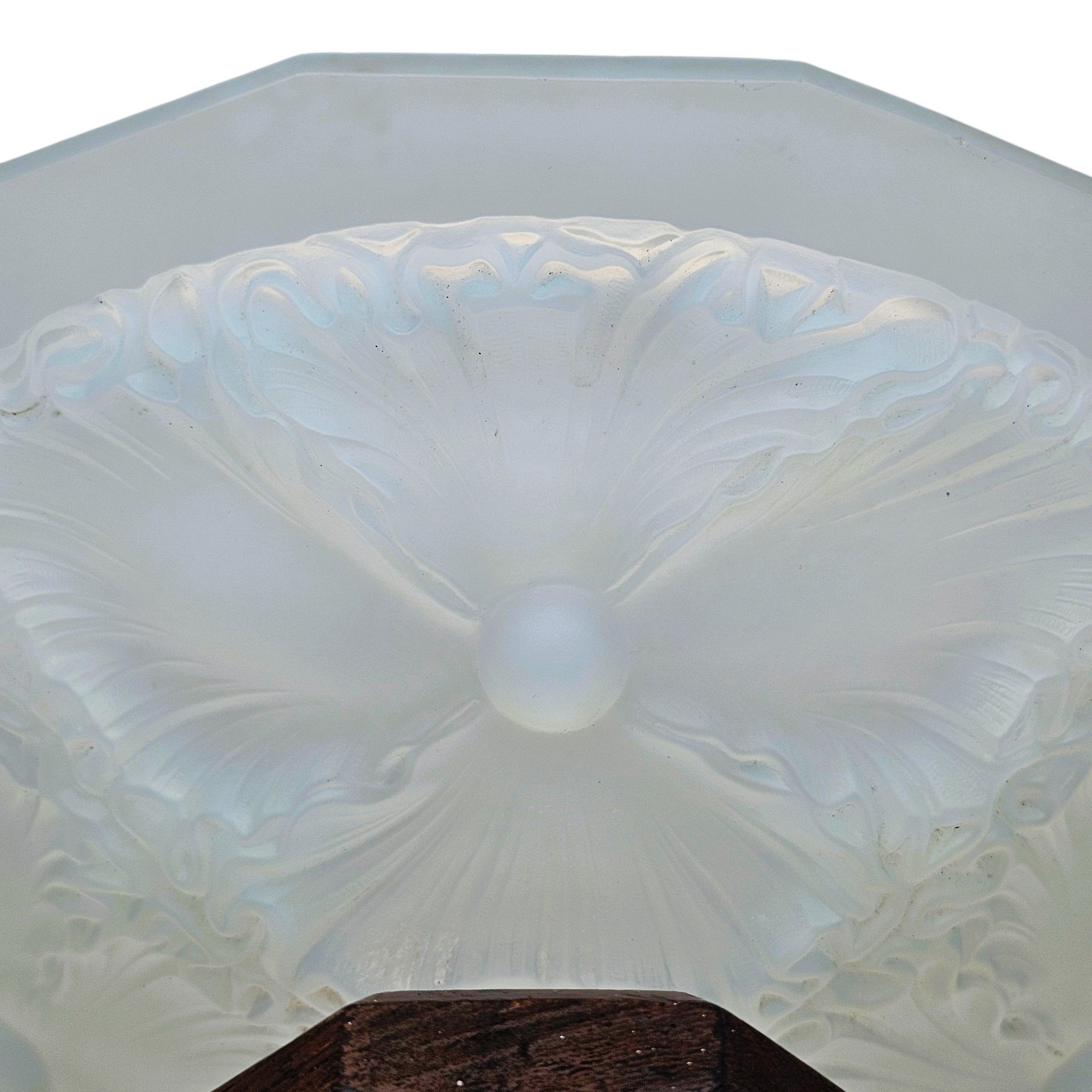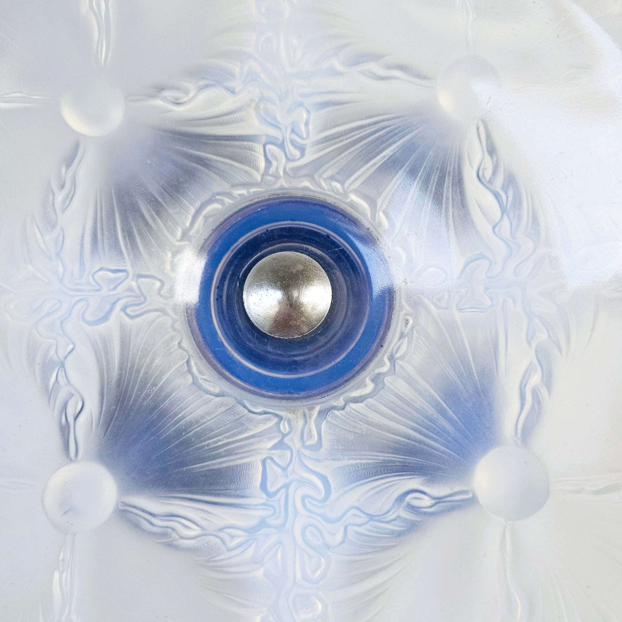 Superbe coupe Art déco en verre opalescent moulé, dont les reflets bleutés et laiteux changent au gré de la lumière. Le décor stylisé de motifs floraux en croix avec cabochons s’inscrit dans une forme circulaire à 16 pans coupés, typique du design géométrique des années 1930.