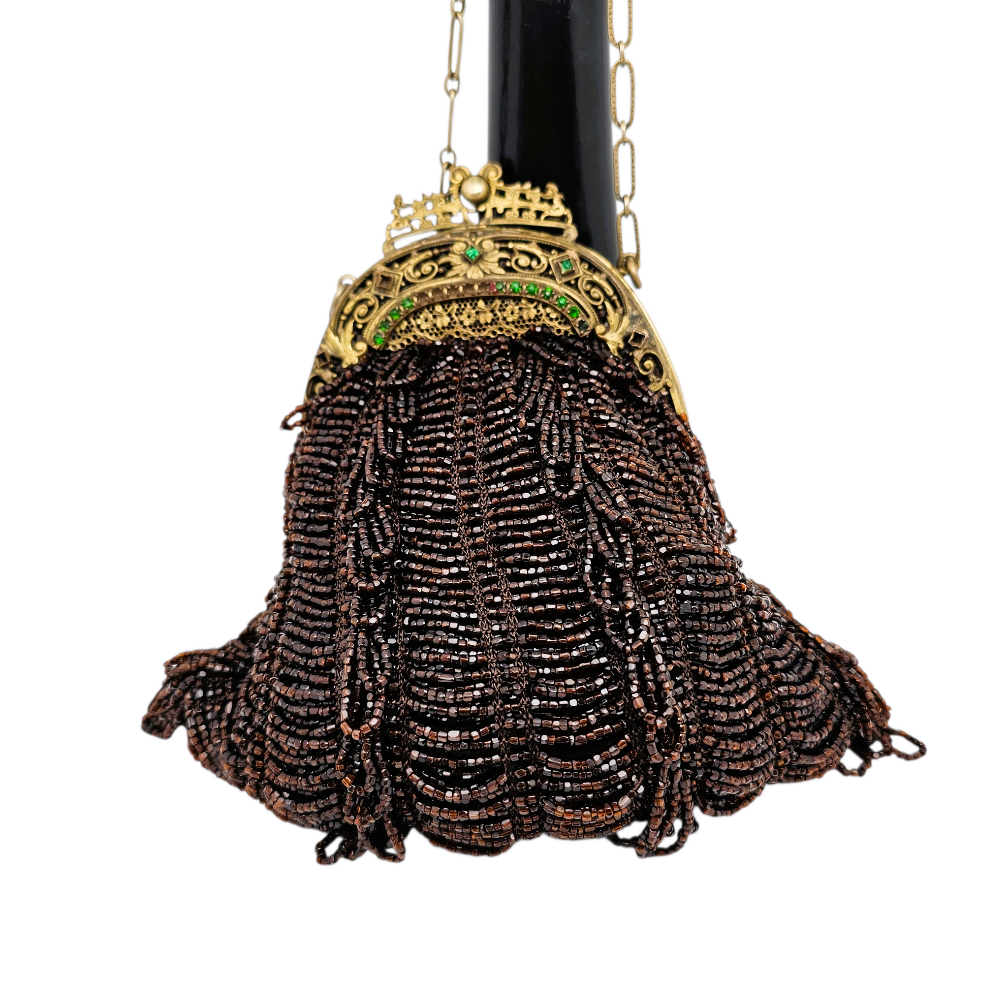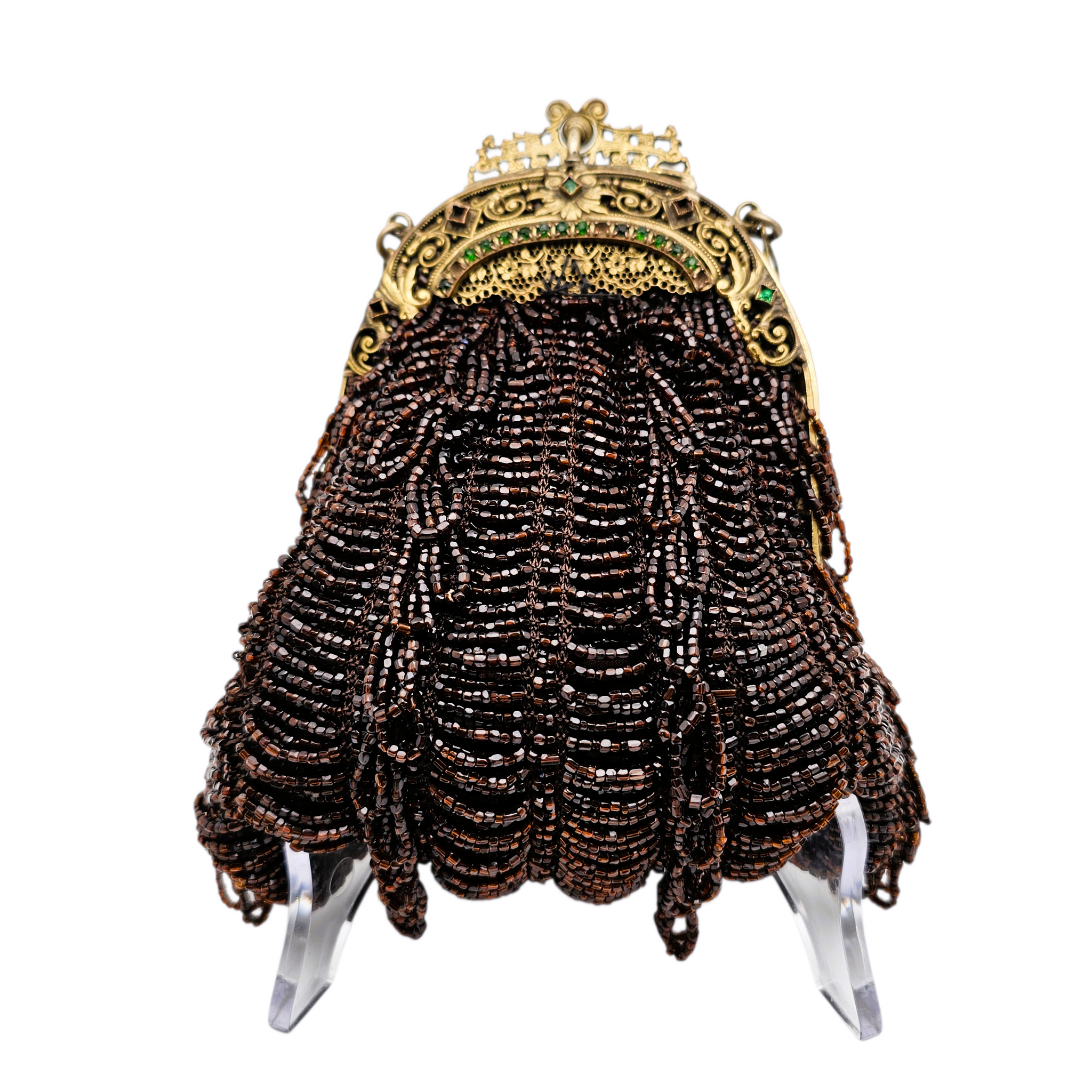 Matériaux : perles de verre de couleur marron, monture en métal doré, pierres colorées