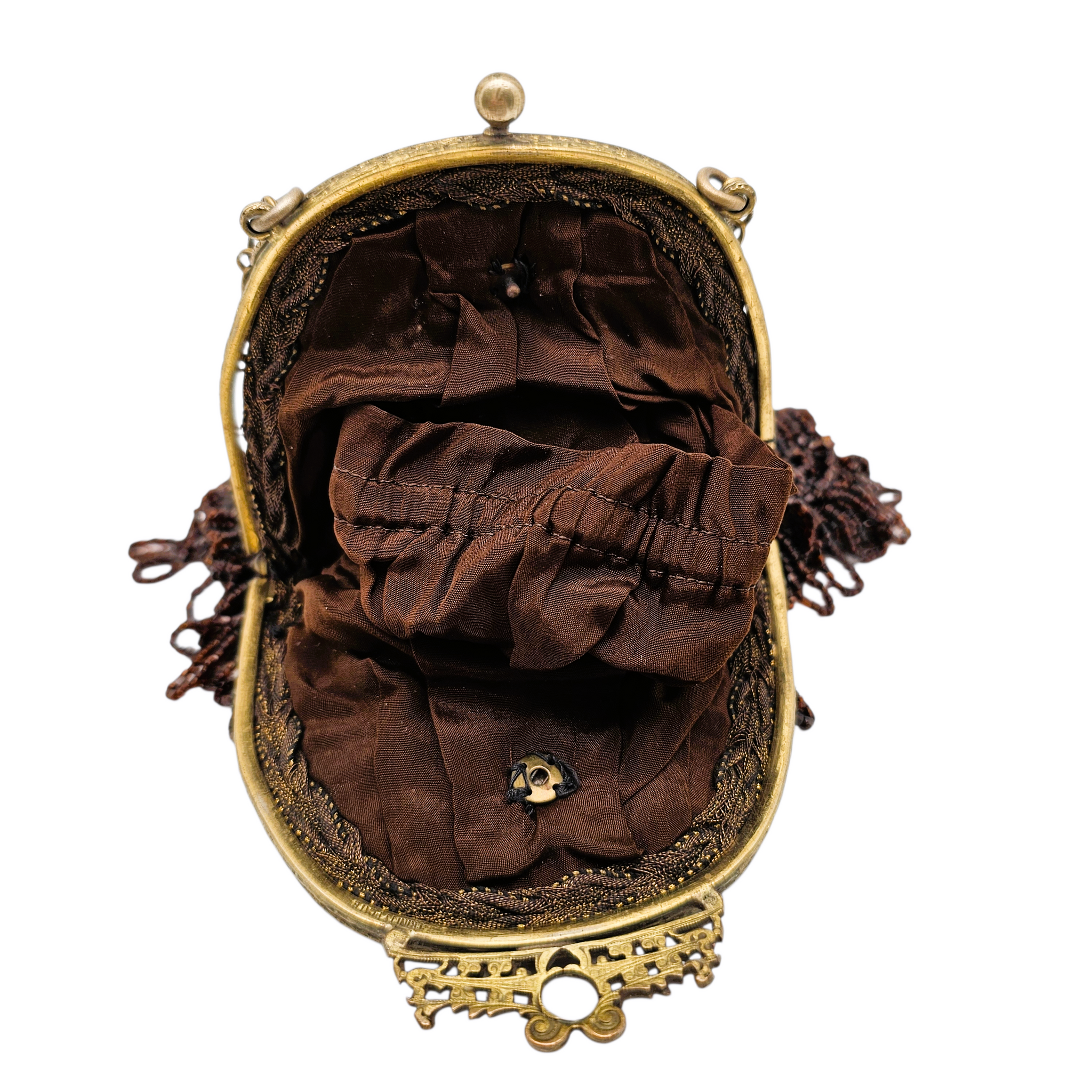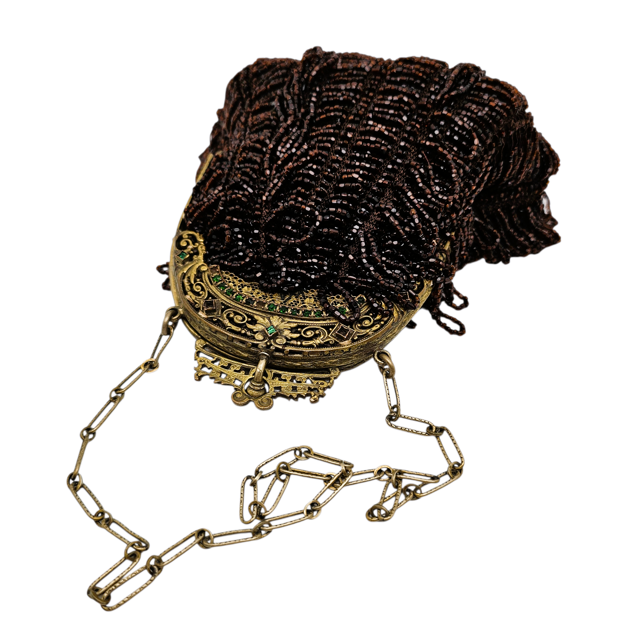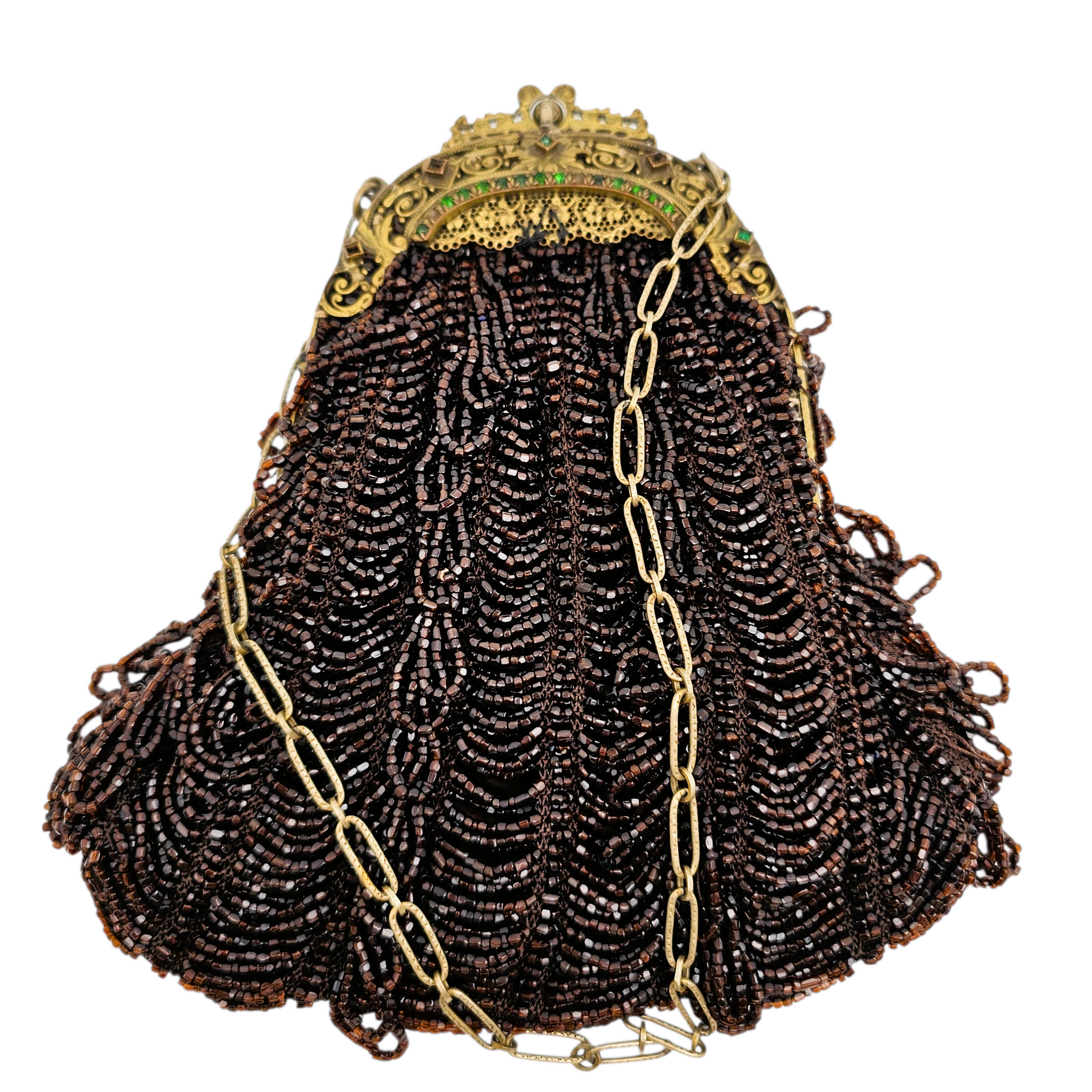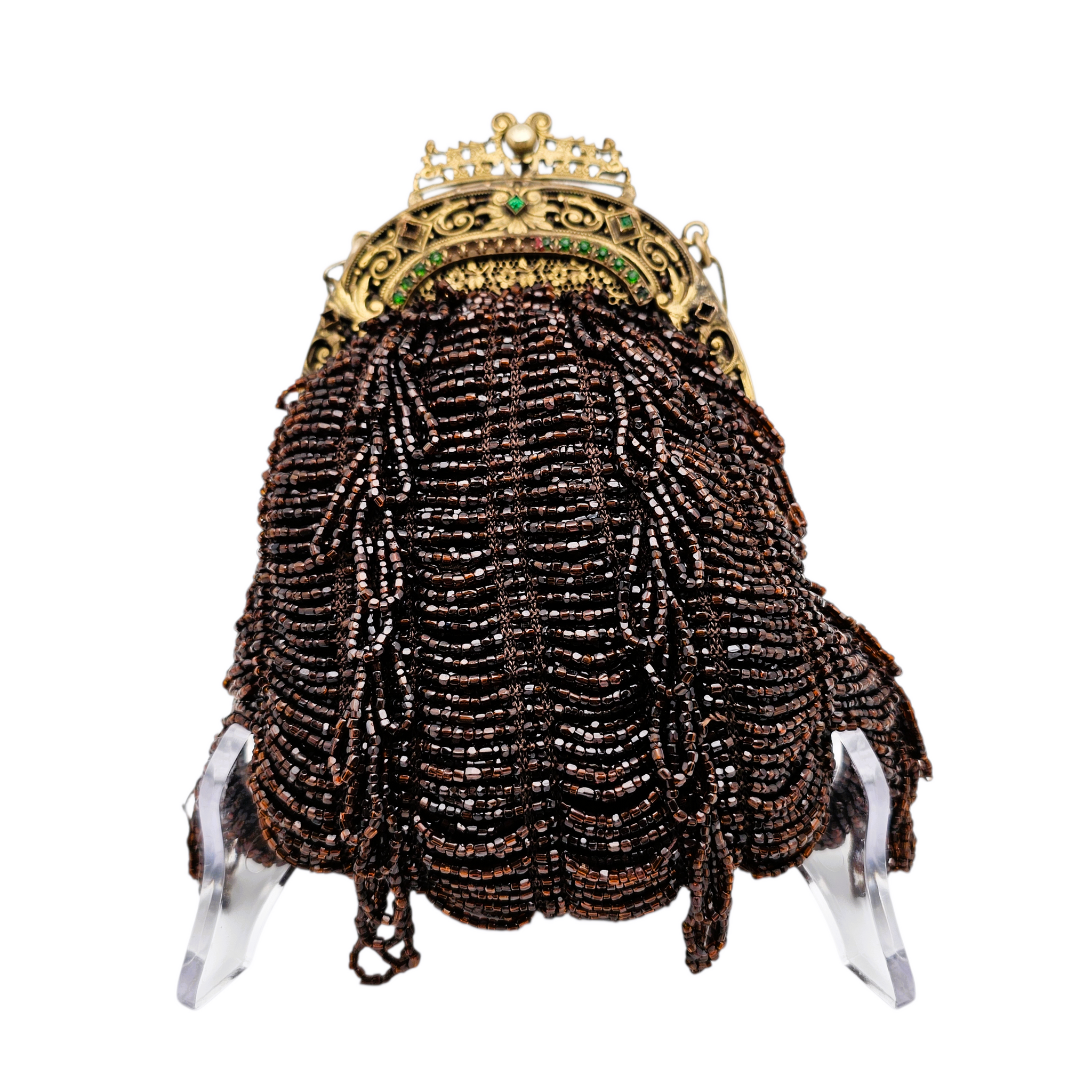 État : très bon état général ; perlage complet ; quelques petites pierres manquantes sur la monture ; fermoir fonctionnel ; intérieur en très bon état