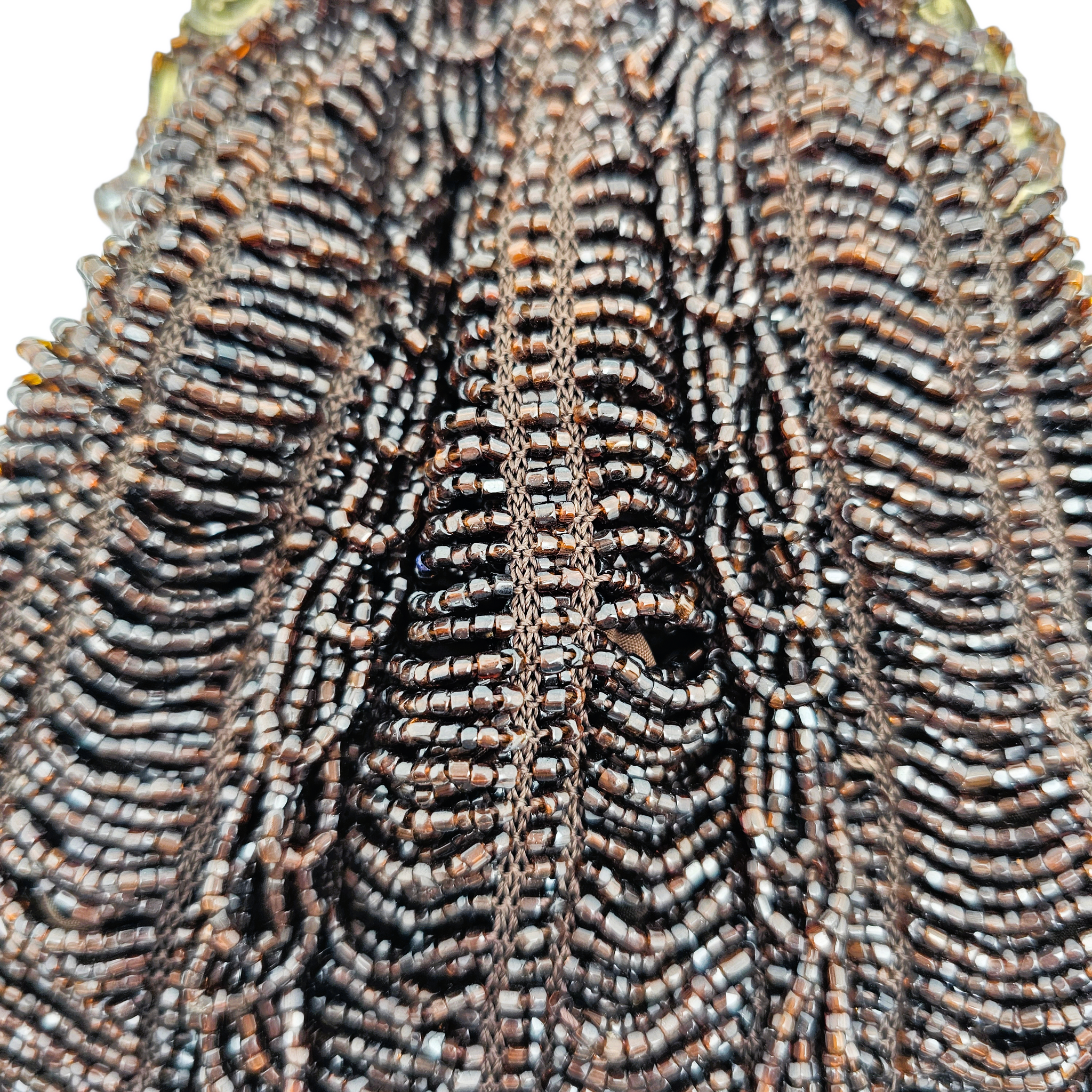 Le perlage, dense et régulier, compose un motif souple et harmonieux. Toutes les perles sont présentes, ce qui est remarquable pour une pièce de ce format et de ce poids.