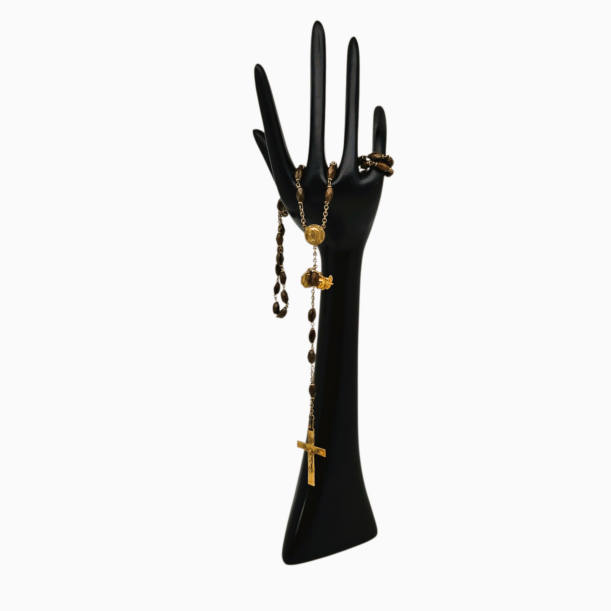 Les grains, en verre facetté brun ambré, reflètent la lumière avec une douce chaleur.