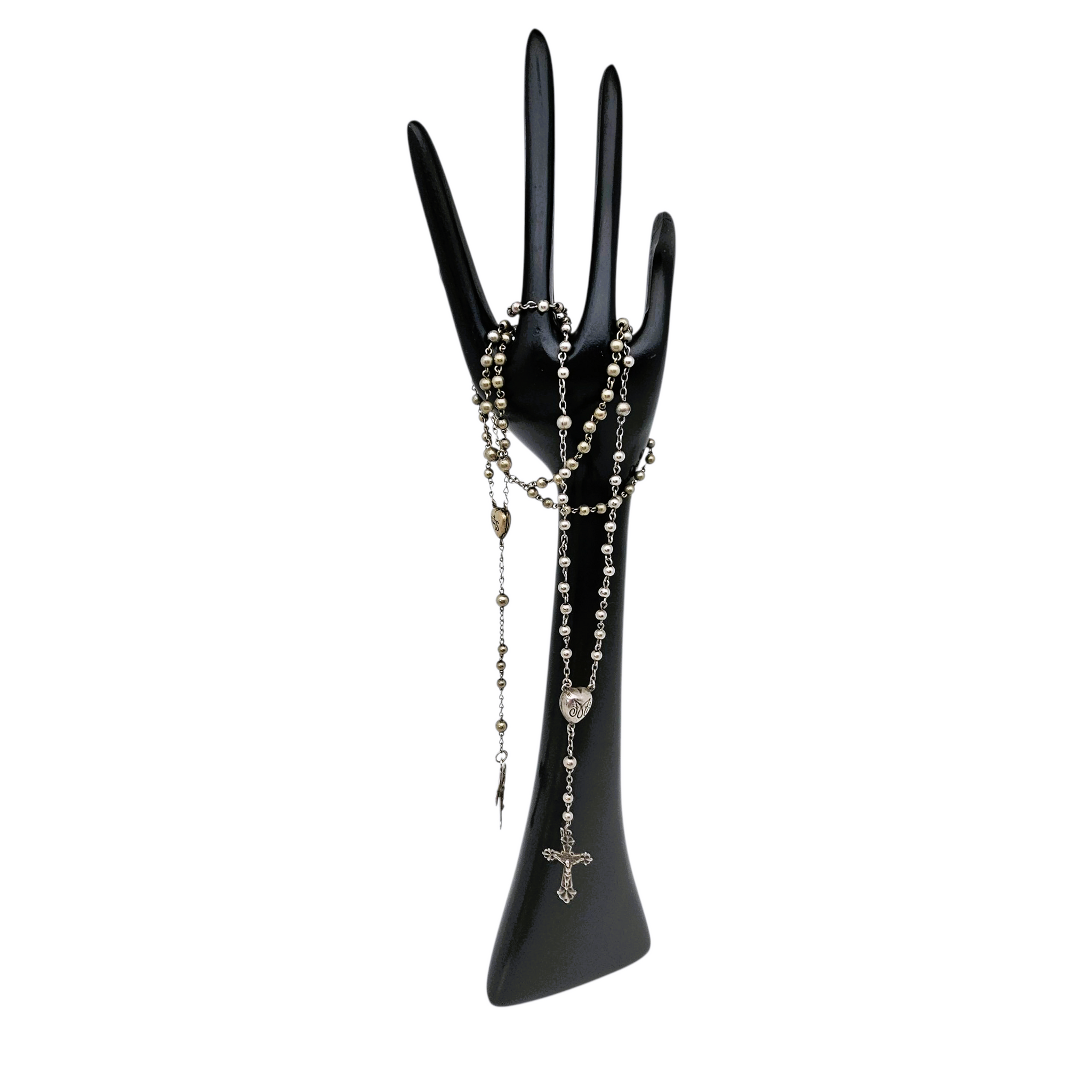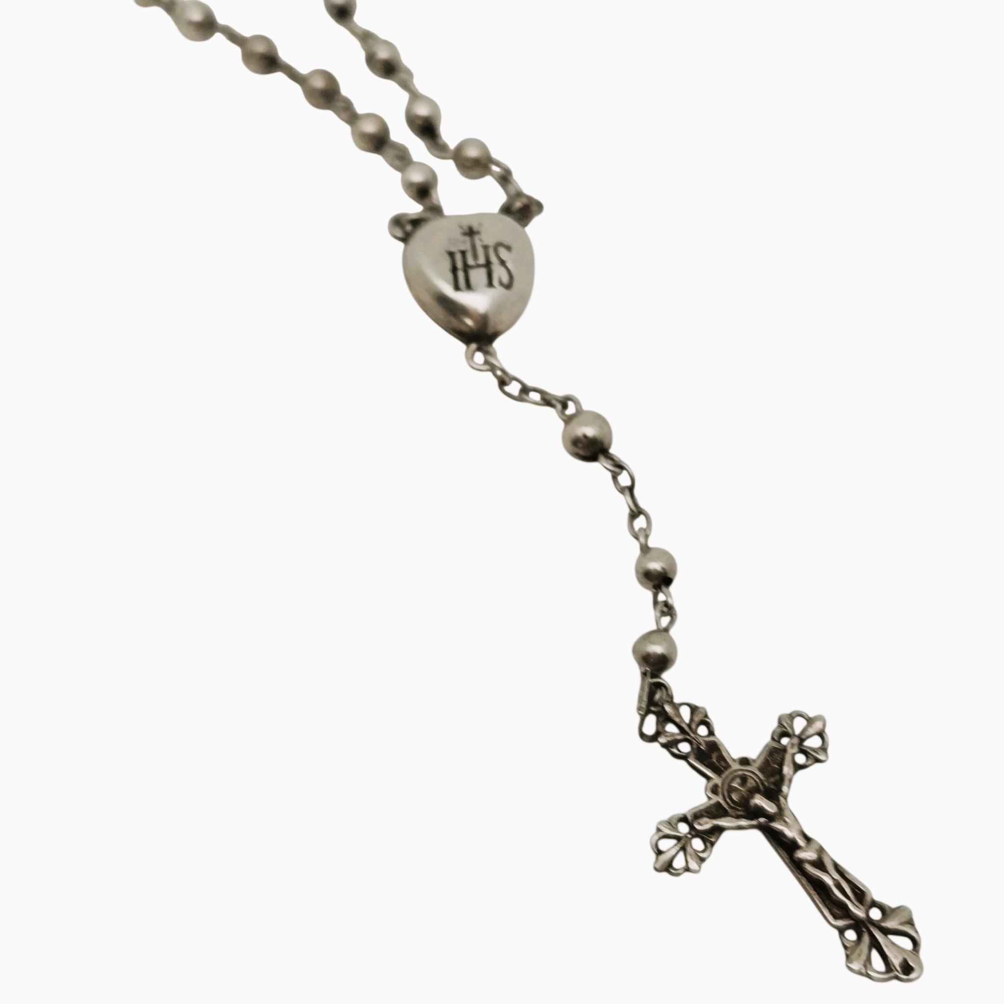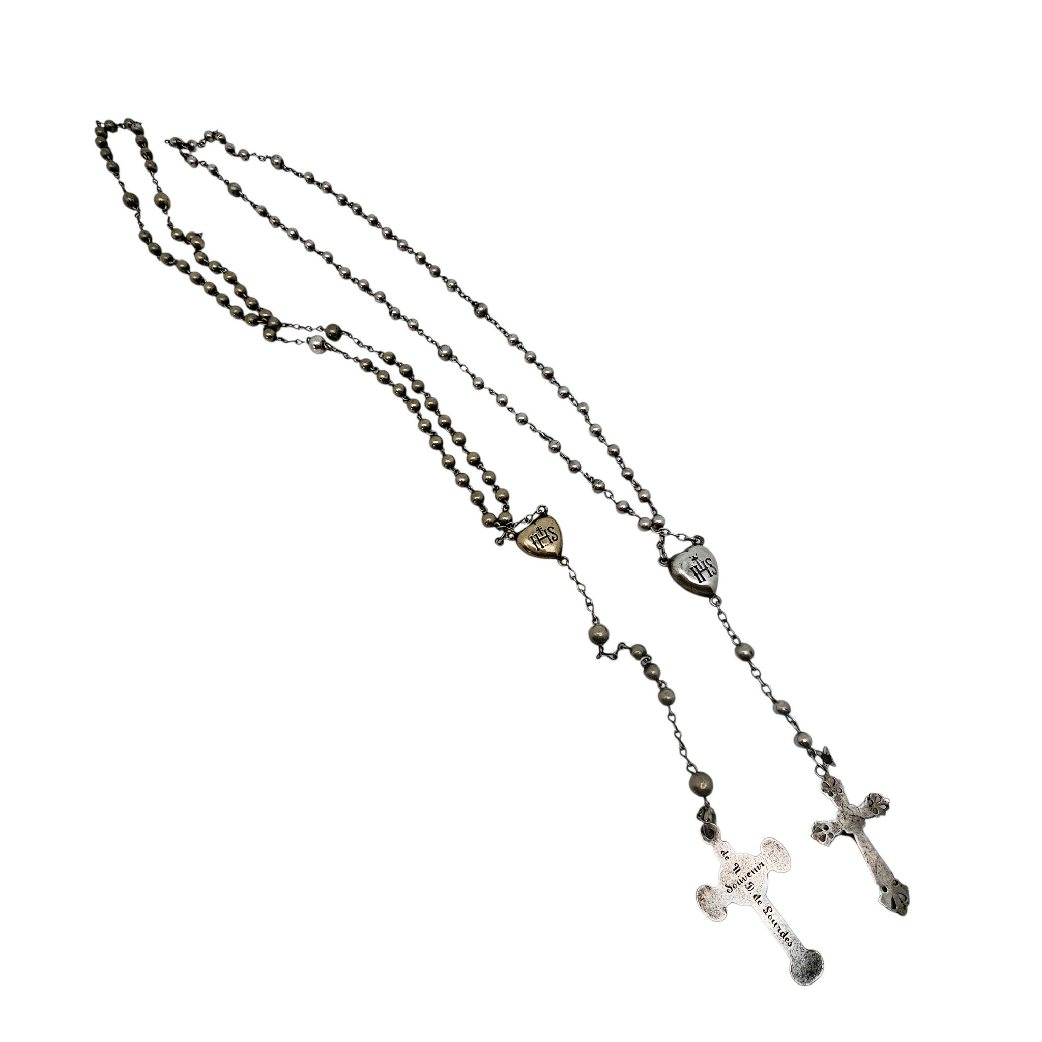 Le premier, en argent massif testé, présente un délicat cœur “IHS” et un crucifix ajouré à décor gothique.