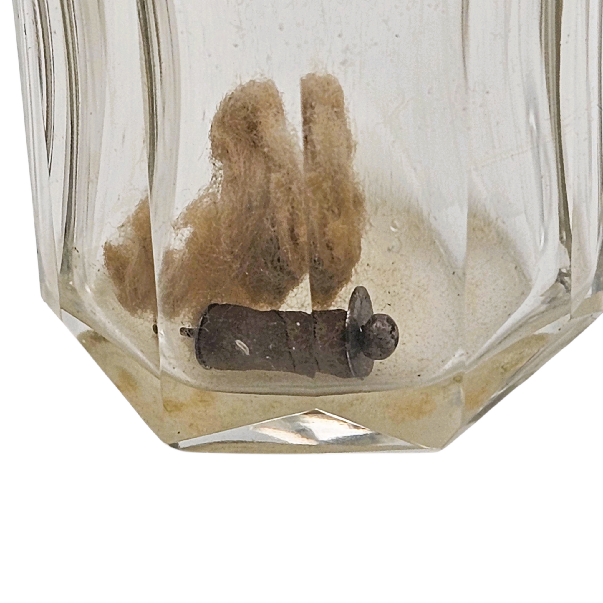 L’un d’eux conserve d’ailleurs à l’intérieur un petit vestige de mèche et de tube métallique, discret rappel de son usage d’origine : contenir des essences parfumées ou des sels odorants.