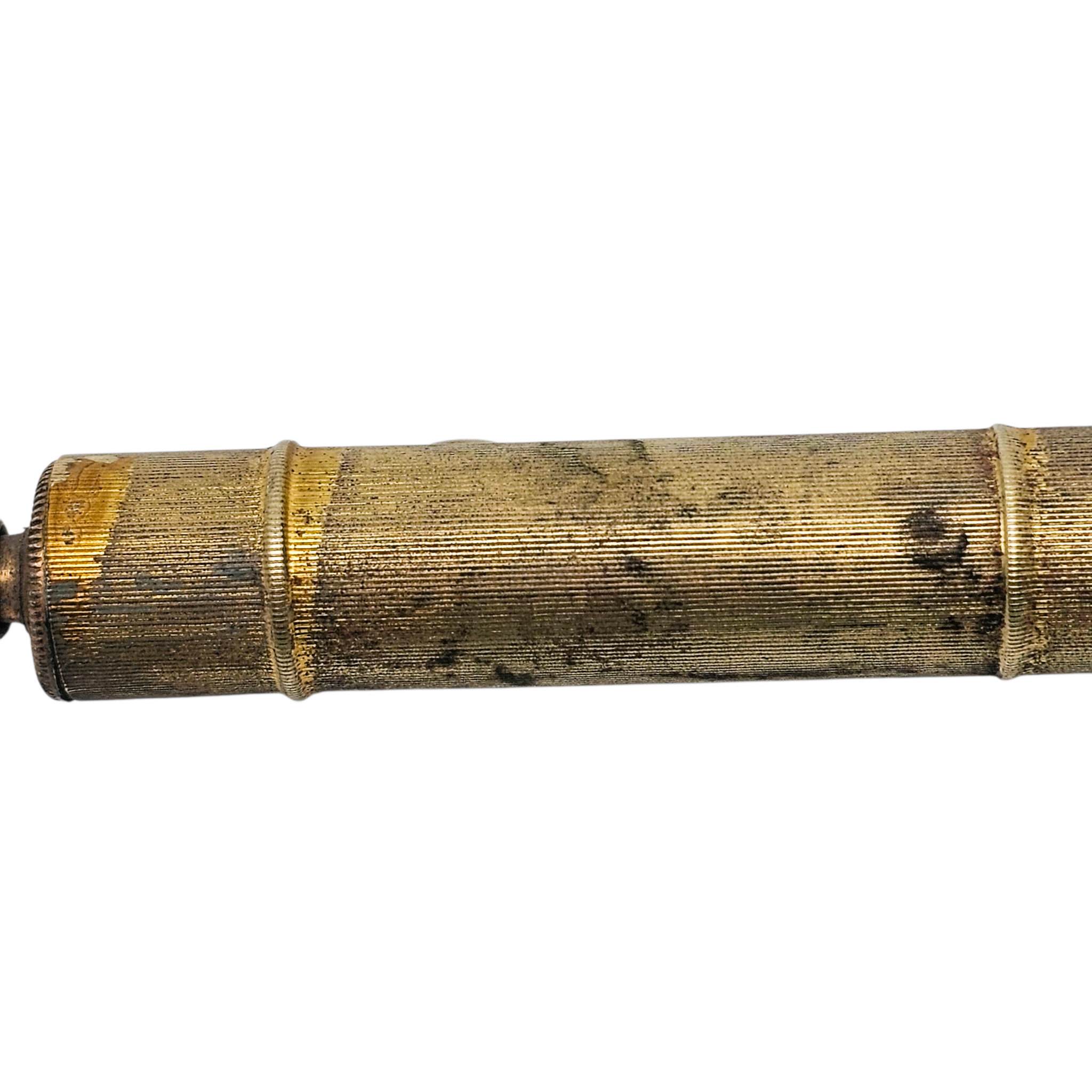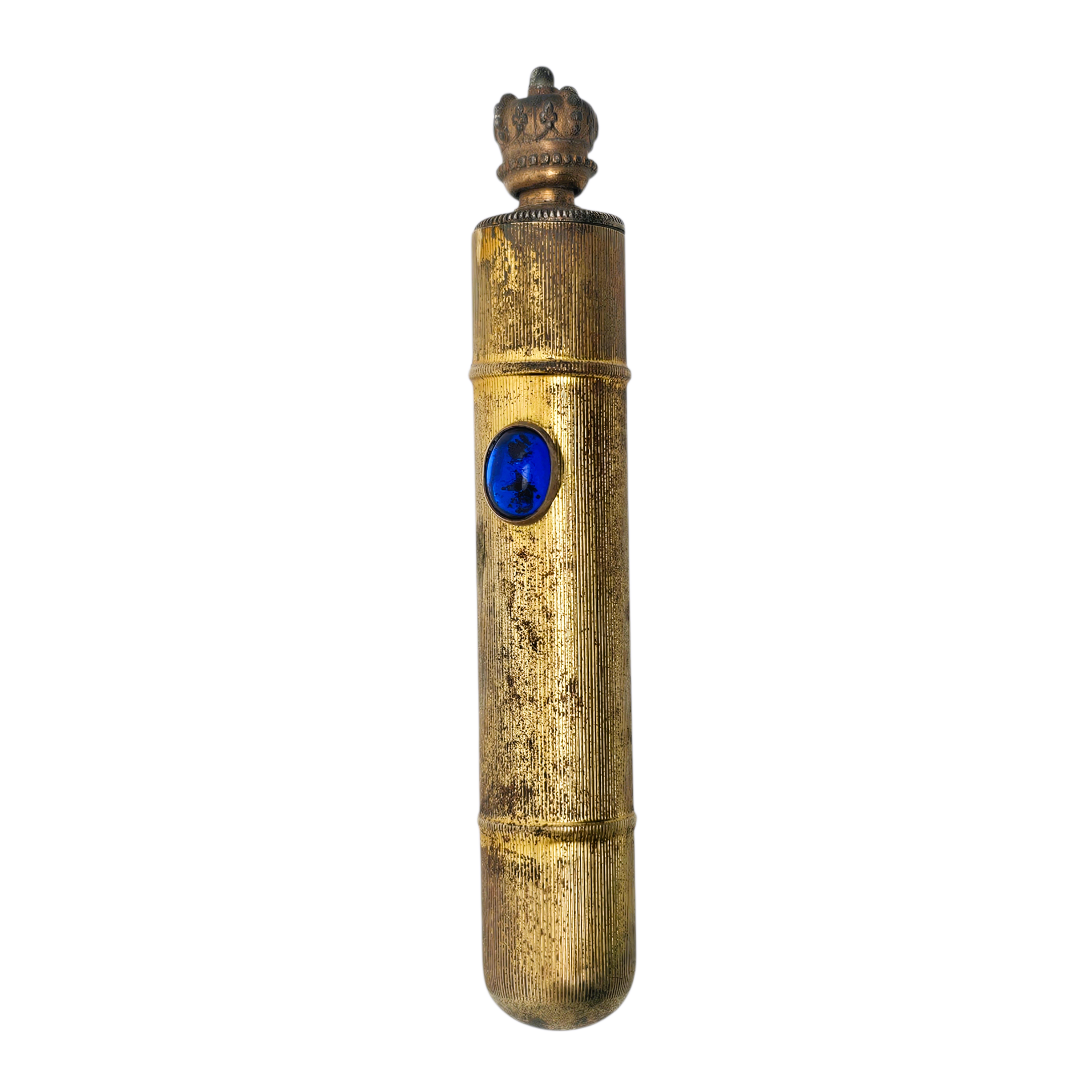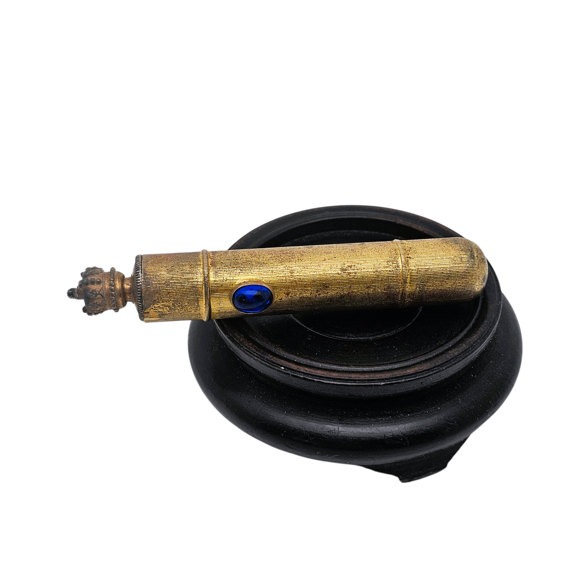 Son corps cylindrique en métal doré finement strié, joliment patiné par le temps, est rehaussé d’un cabochon en verre bleu décoratif, apportant une note raffinée et discrètement précieuse.