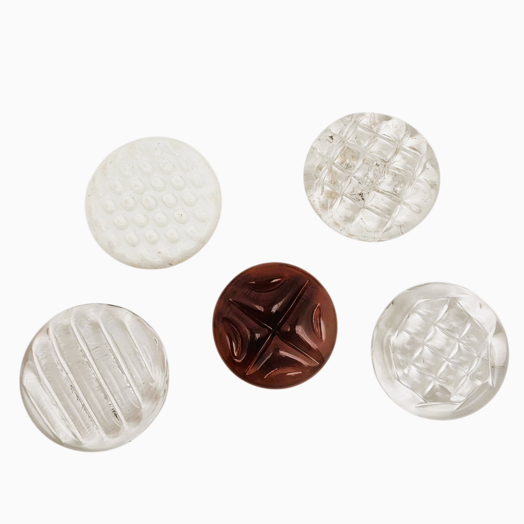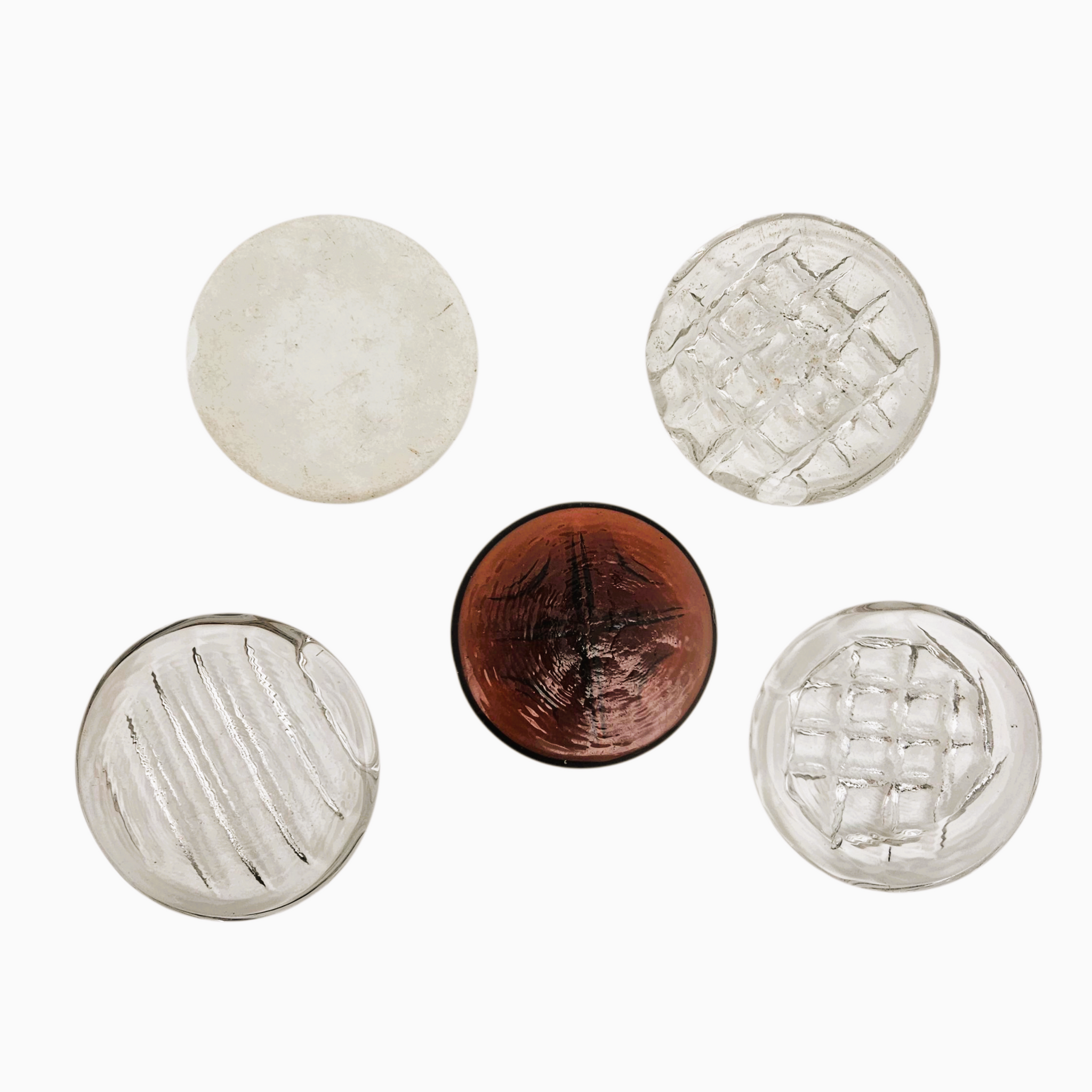 Redécouvrez la poésie des jeux anciens avec ce lot de 5 palets de marelle en verre moulé, chacun doté d’un motif unique : croisillons, stries profondes, pastilles en relief… et un superbe palet ambré qui apporte une touche chaleureuse à l’ensemble.