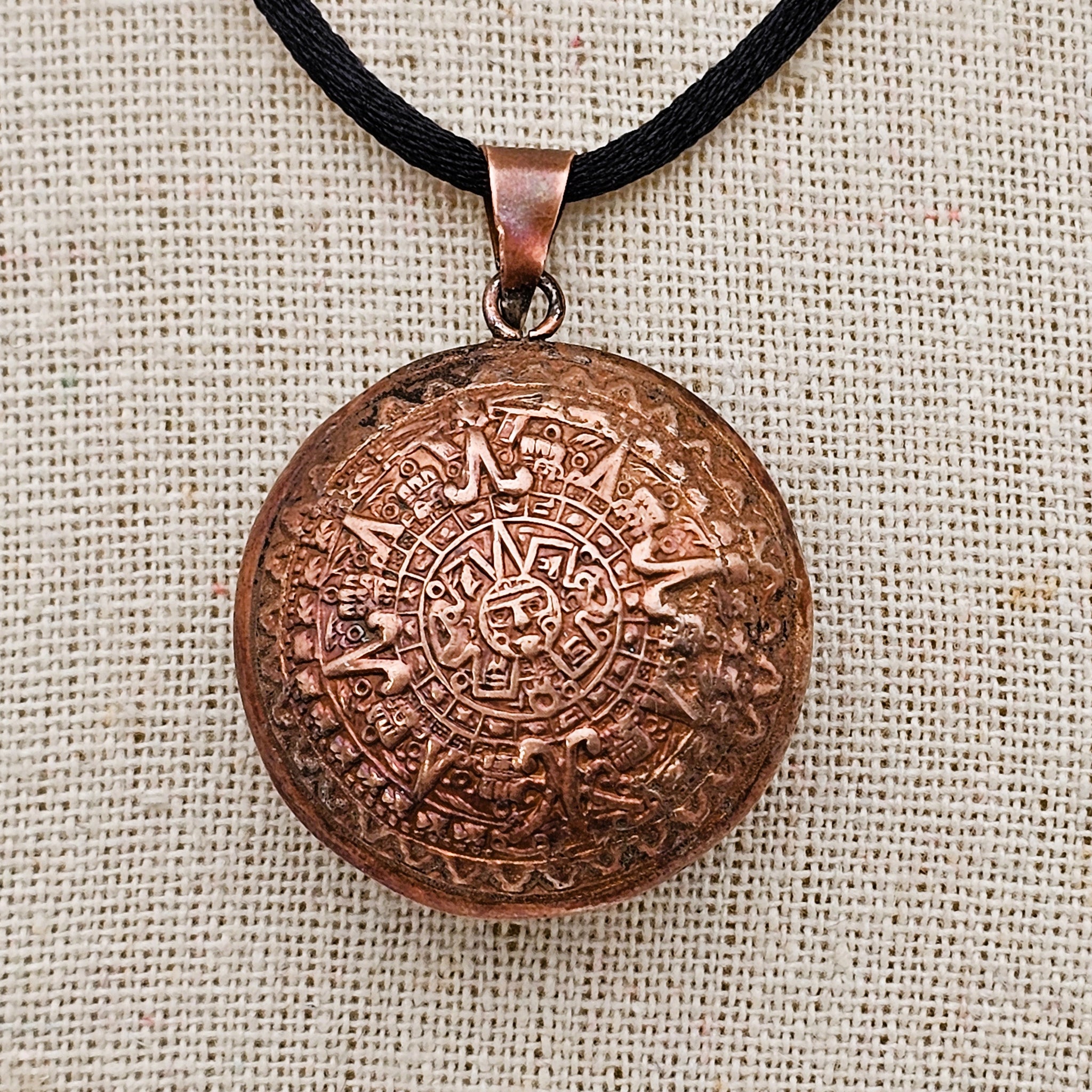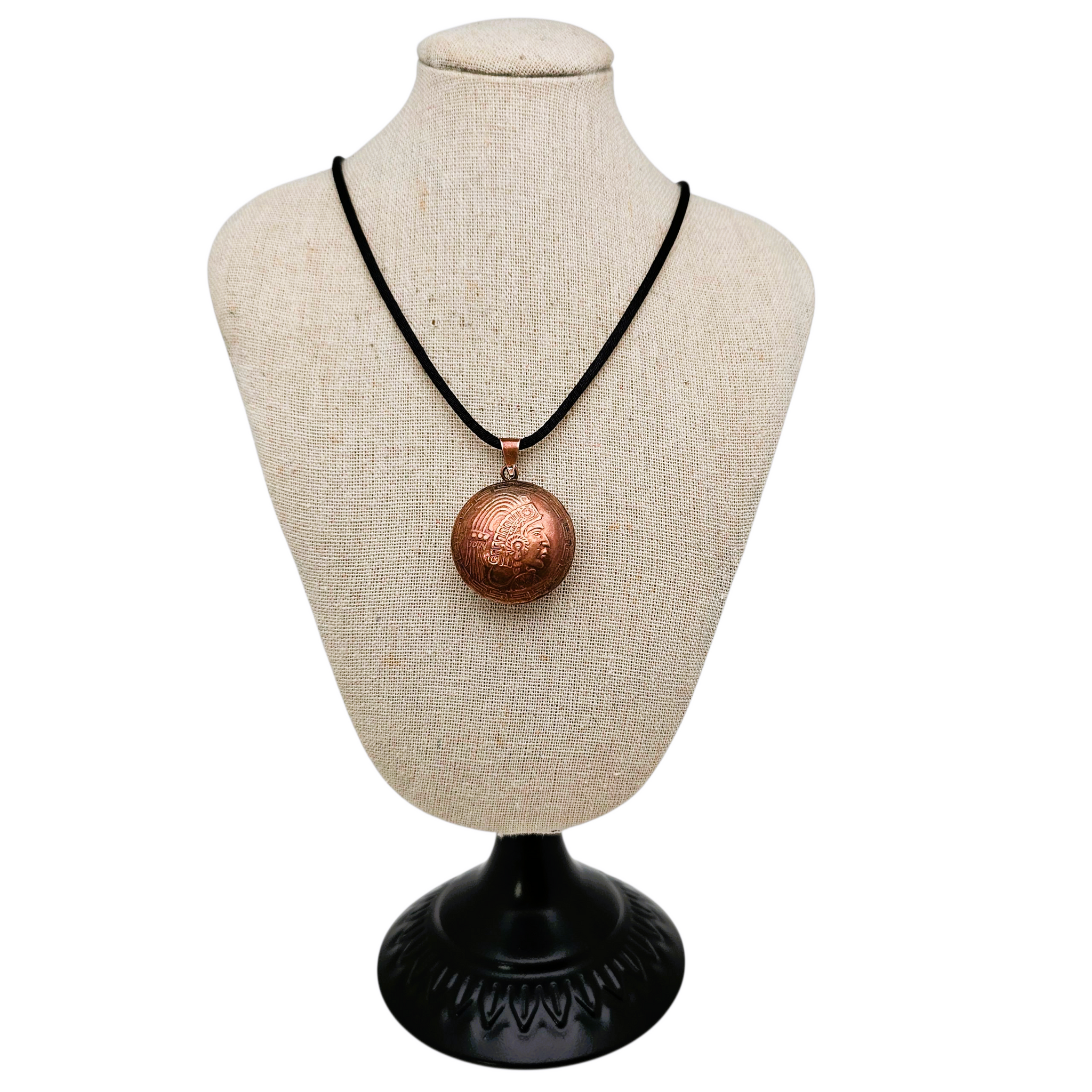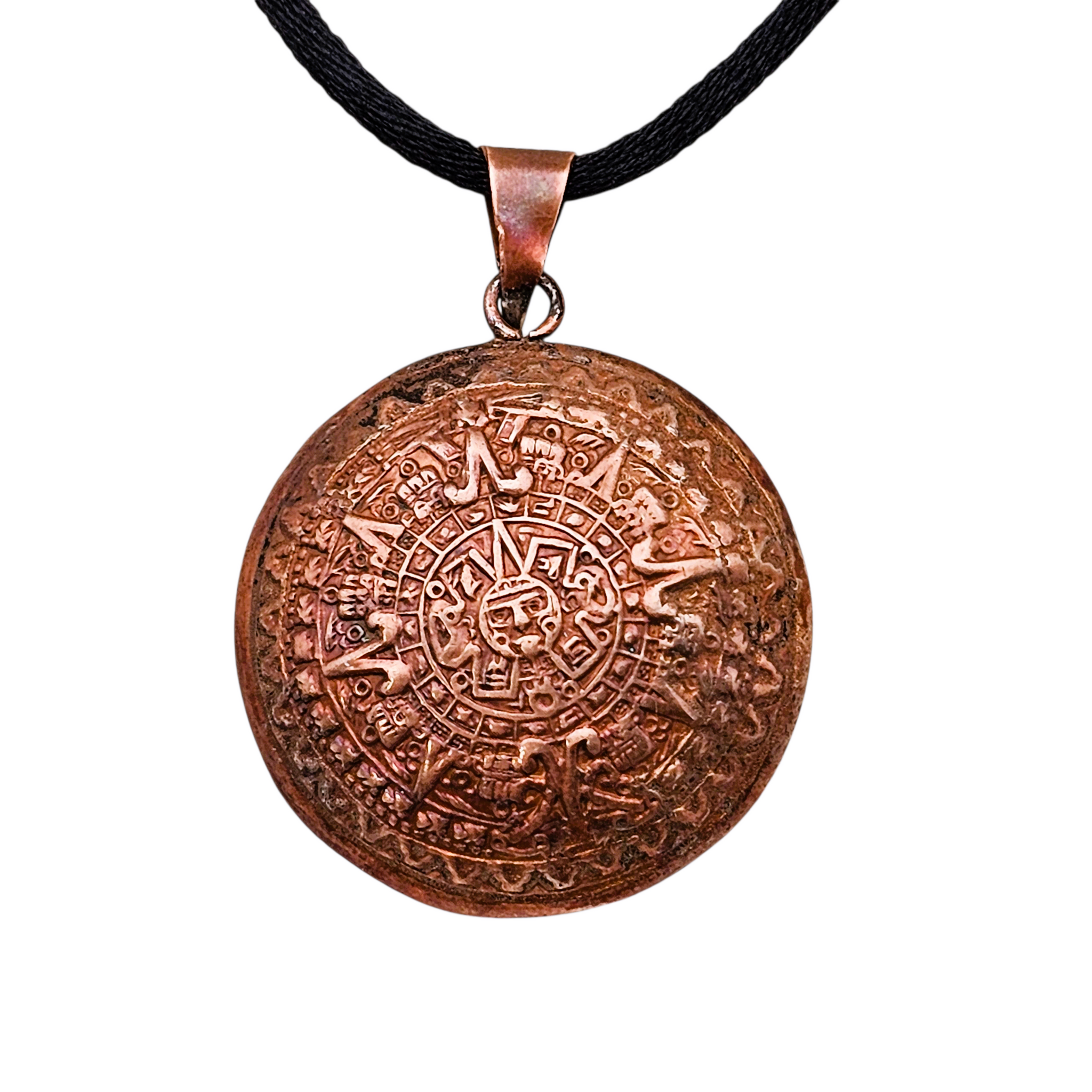 Ce pendentif en cuivre repoussé, finement ciselé sur ses deux faces, rend hommage à la richesse symbolique des civilisations précolombiennes.