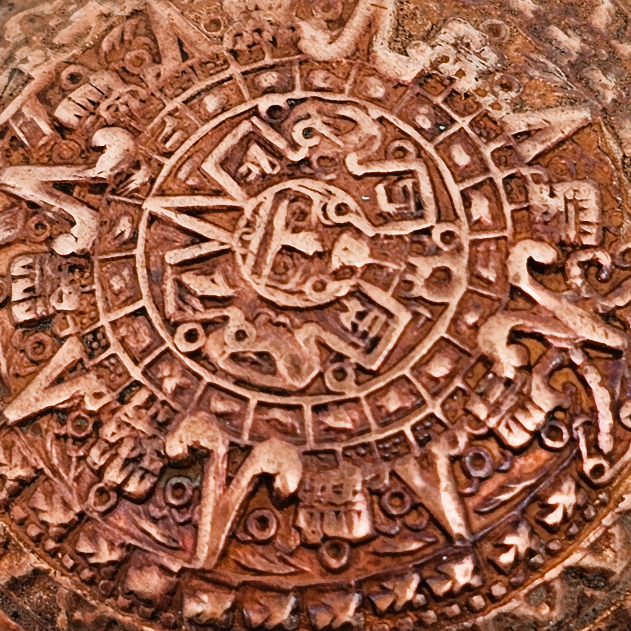 Sur l’autre, le célèbre calendrier solaire, emblème de la culture aztèque et de son rapport sacré au temps et à la nature.