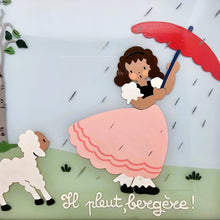 Adorable petit tableau rétro représentant la célèbre scène de la comptine française « Il pleut, bergère ! ». On y voit une jeune bergère en robe rose, tenant un parapluie rouge sous la pluie, accompagnée de son mouton, tandis qu’un arbre se penche sous le vent.