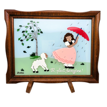Tableau vintage peint sur verre "Il pleut, bergère !" signé Yvalan, années 1955-1965