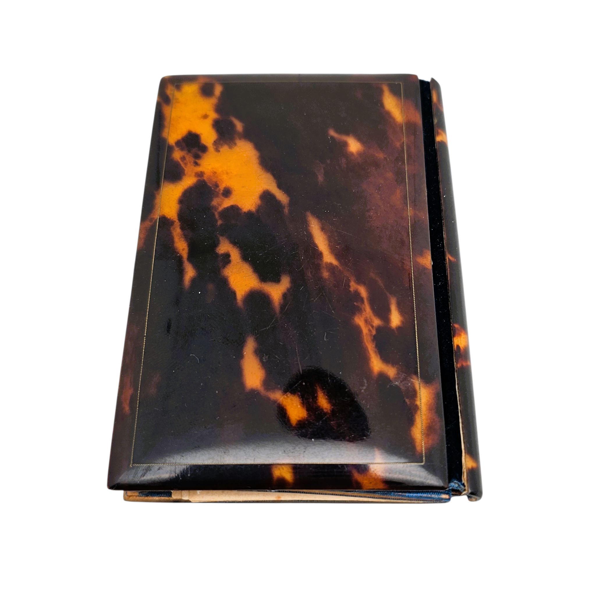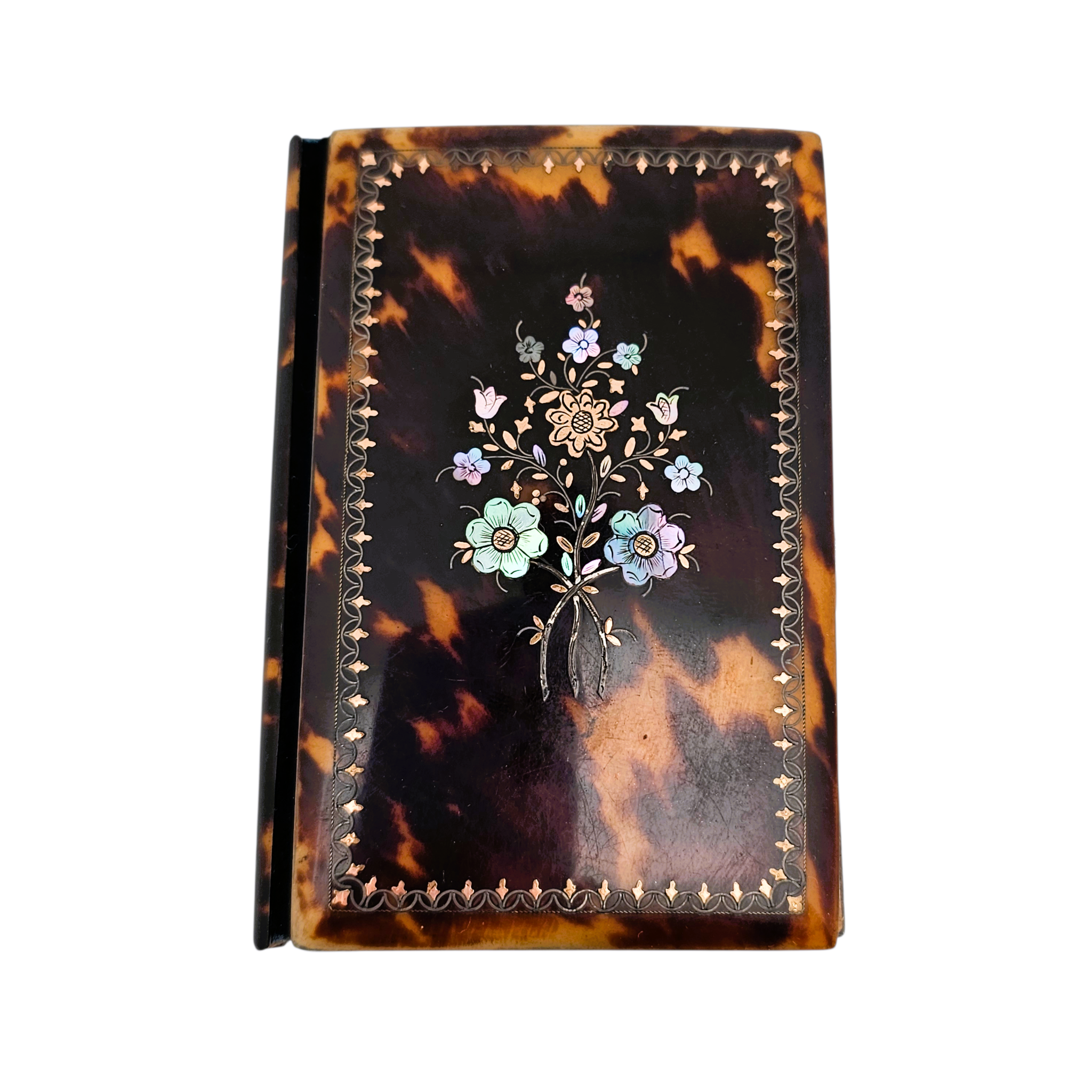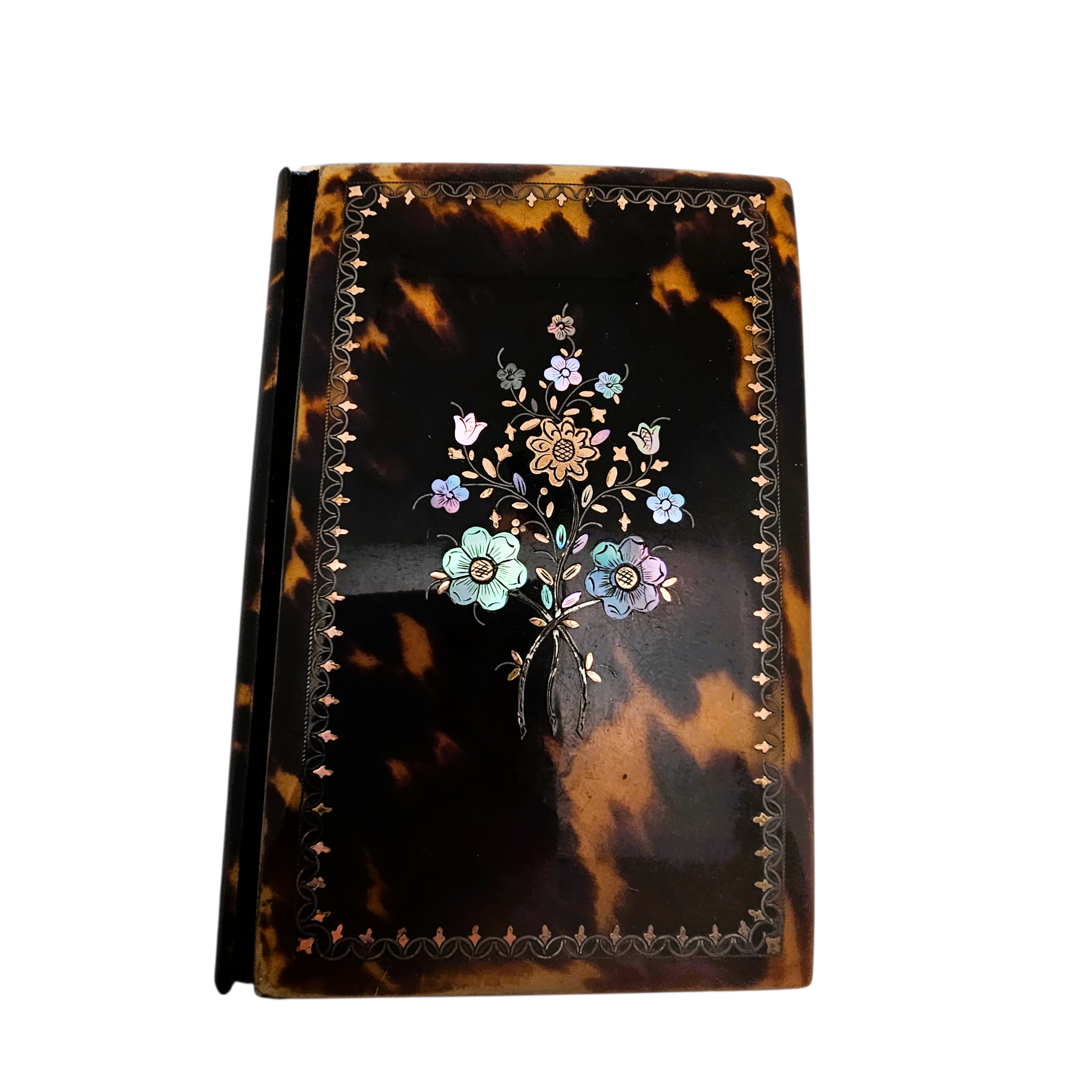 Sa couverture en écaille est finement incrustée de nacre et de laiton, formant un délicat décor floral encadré d’une frise ornementale. Le contraste entre les nuances chaudes de l’écaille et l’éclat irisé de la nacre lui confère beaucoup de raffinement.