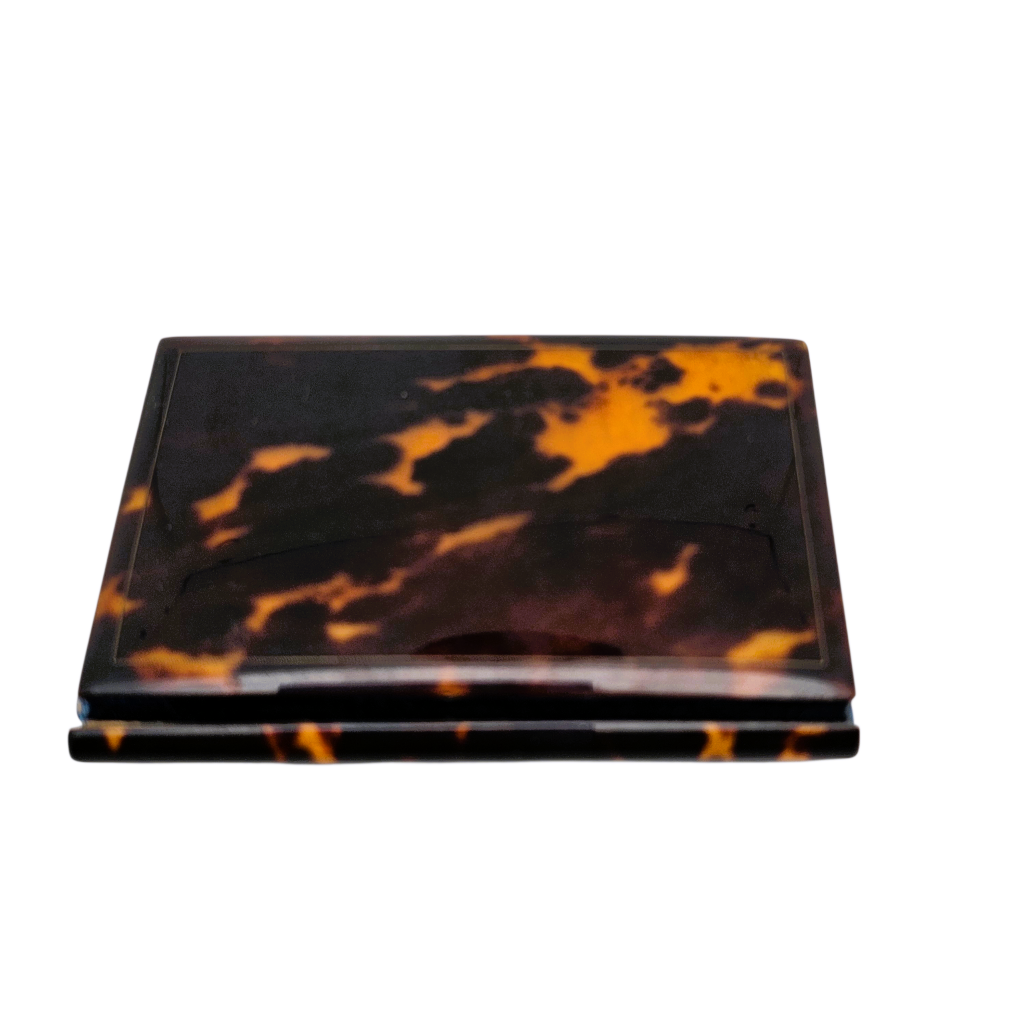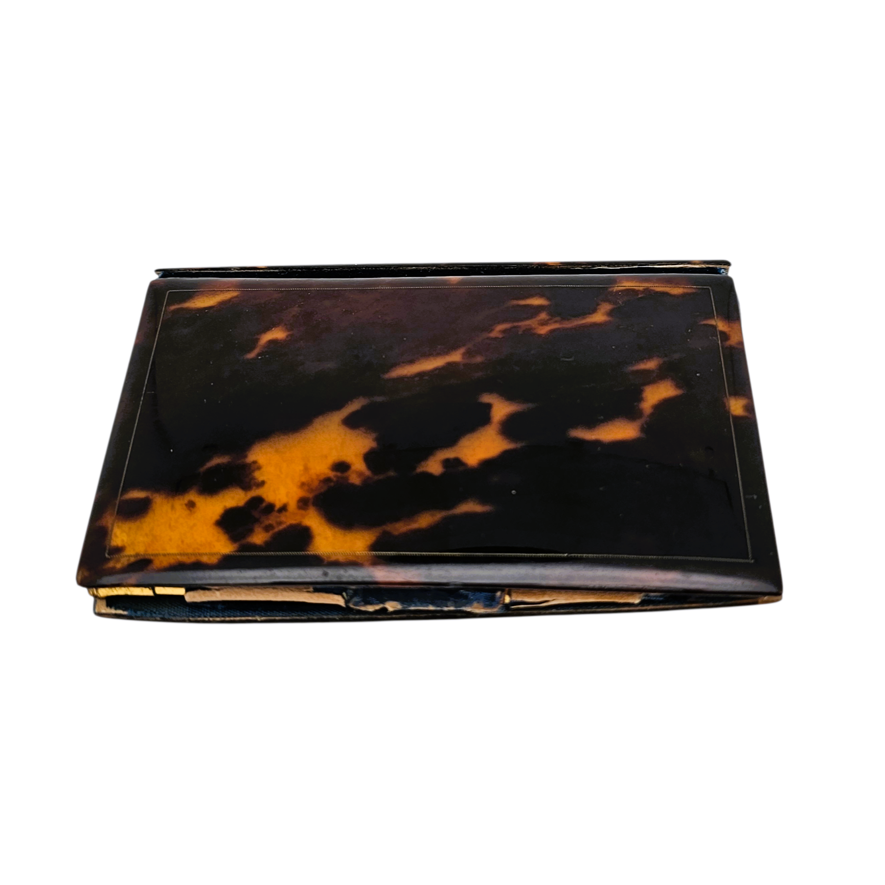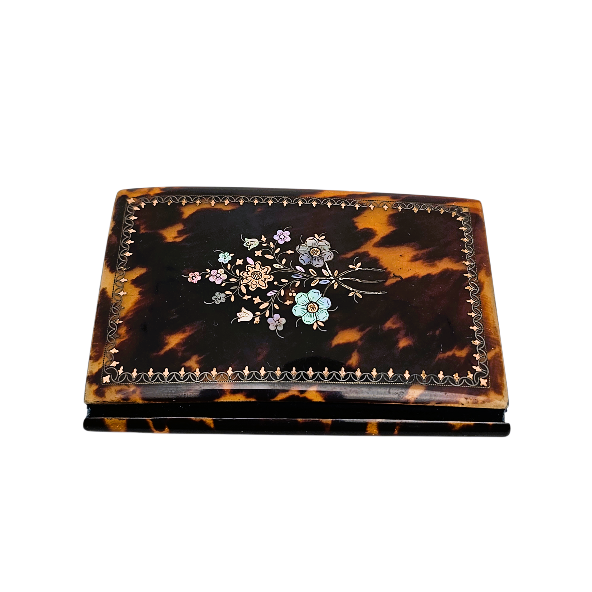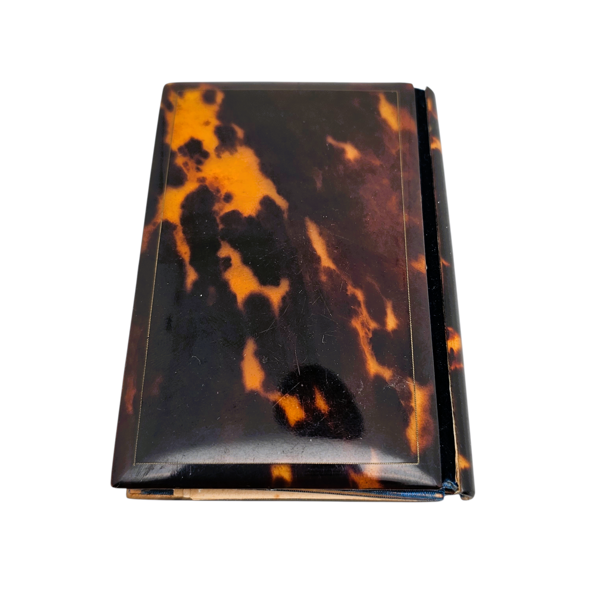 Sa couverture en écaille est finement incrustée de nacre et de laiton, formant un délicat décor floral encadré d’une frise ornementale. Le contraste entre les nuances chaudes de l’écaille et l’éclat irisé de la nacre lui confère beaucoup de raffinement.