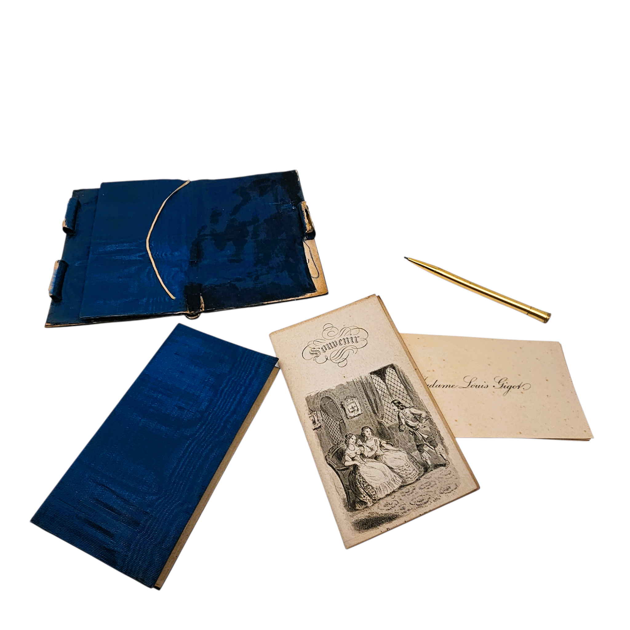 L’intérieur est doublé de soie bleue d’origine et conserve ses feuillets anciens, dont certains portent encore des annotations manuscrites.
