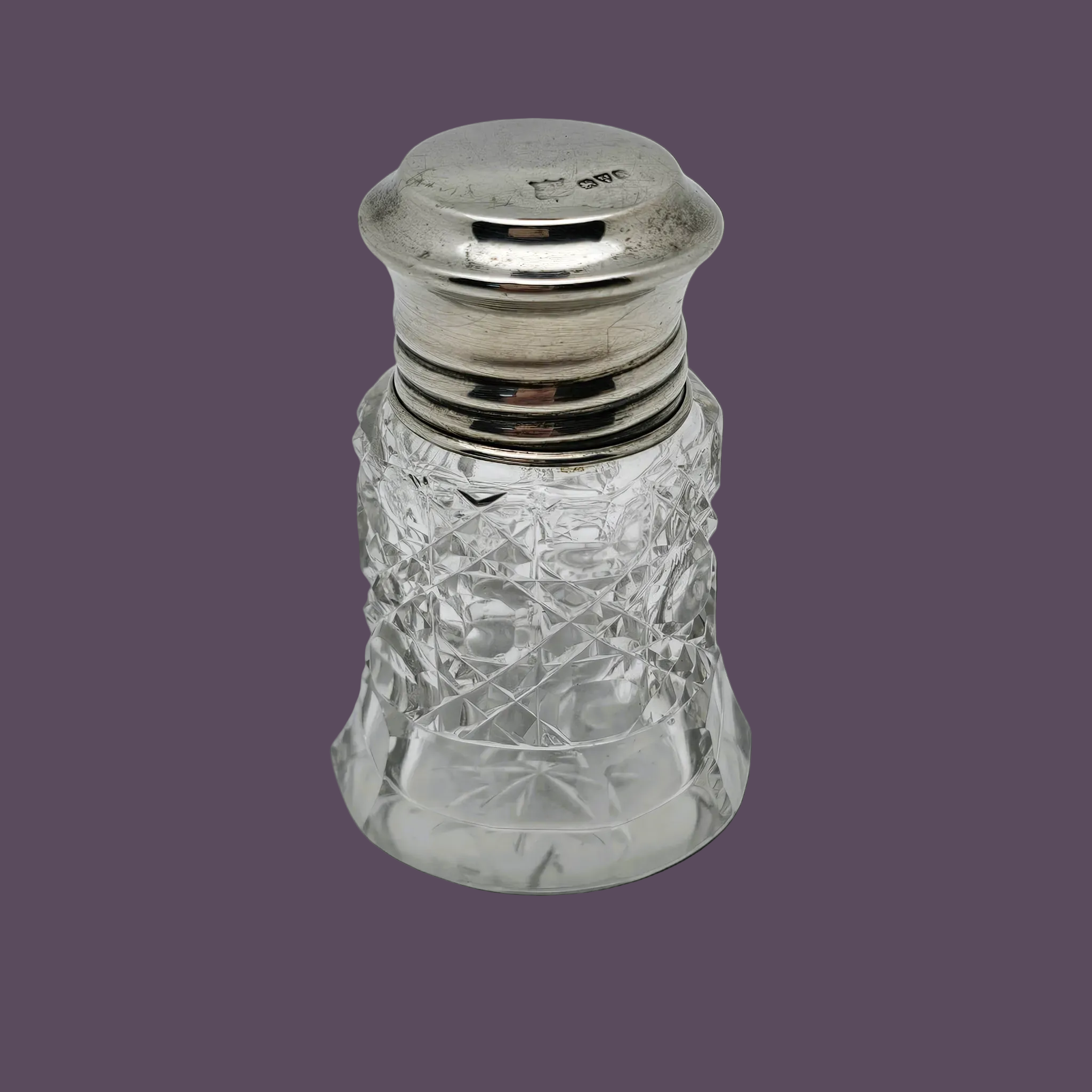 Élégant flacon en cristal taillé, surmonté de son capuchon en argent massif d'origine, parfaitement ajusté. Un petit objet raffiné, à la fois décoratif et chargé d'histoire.