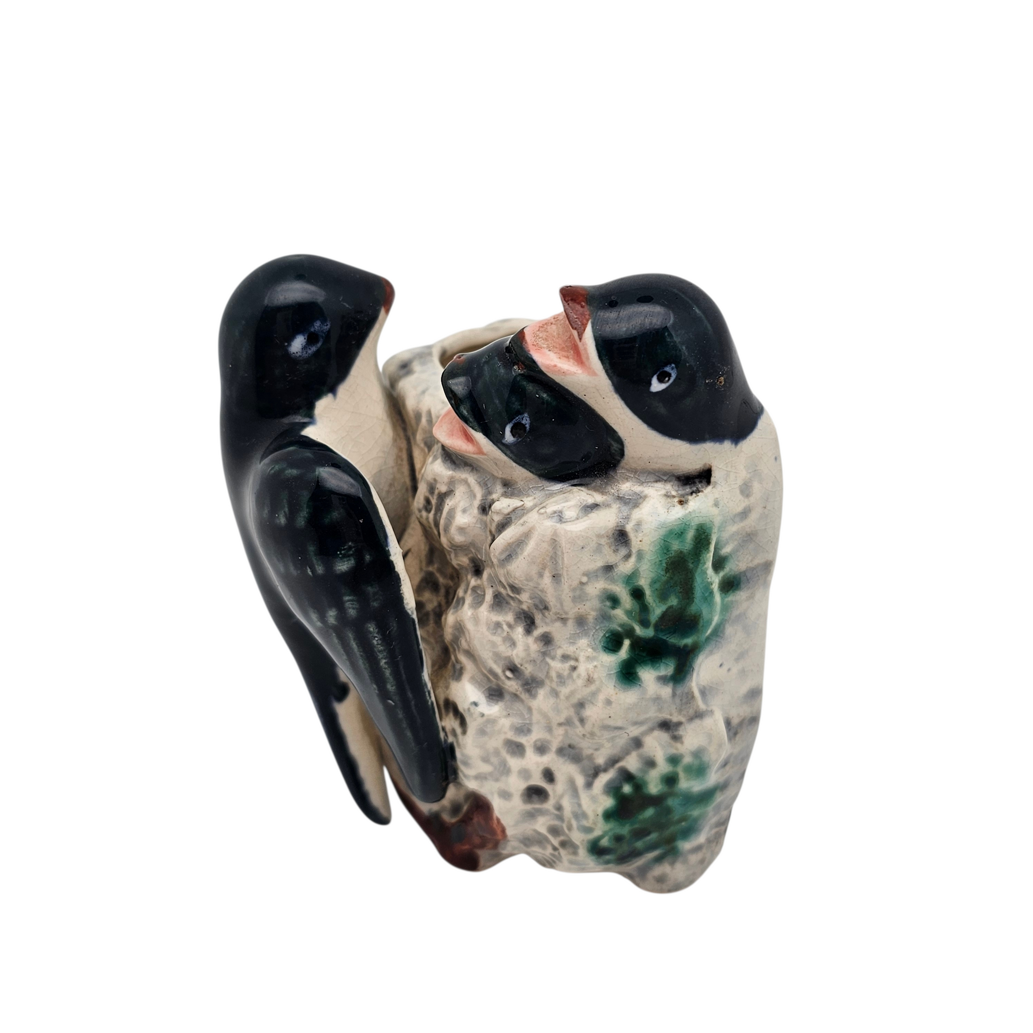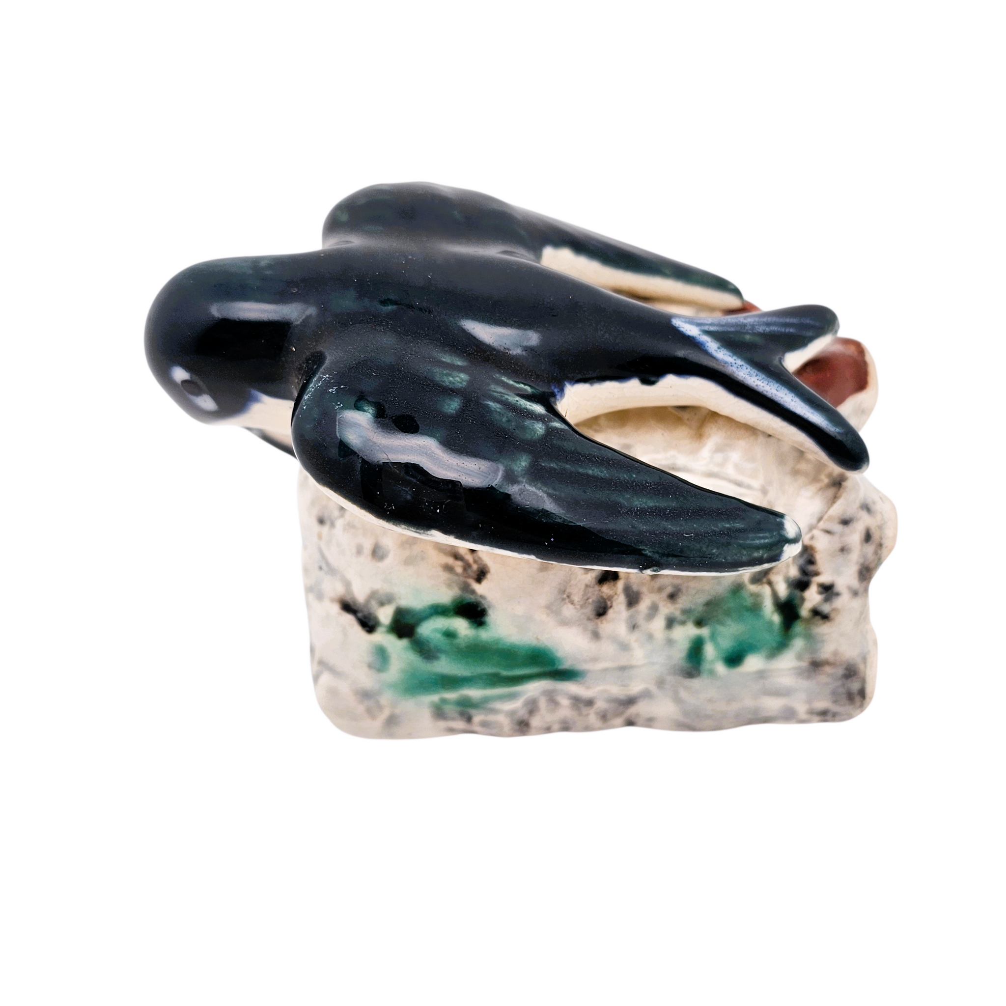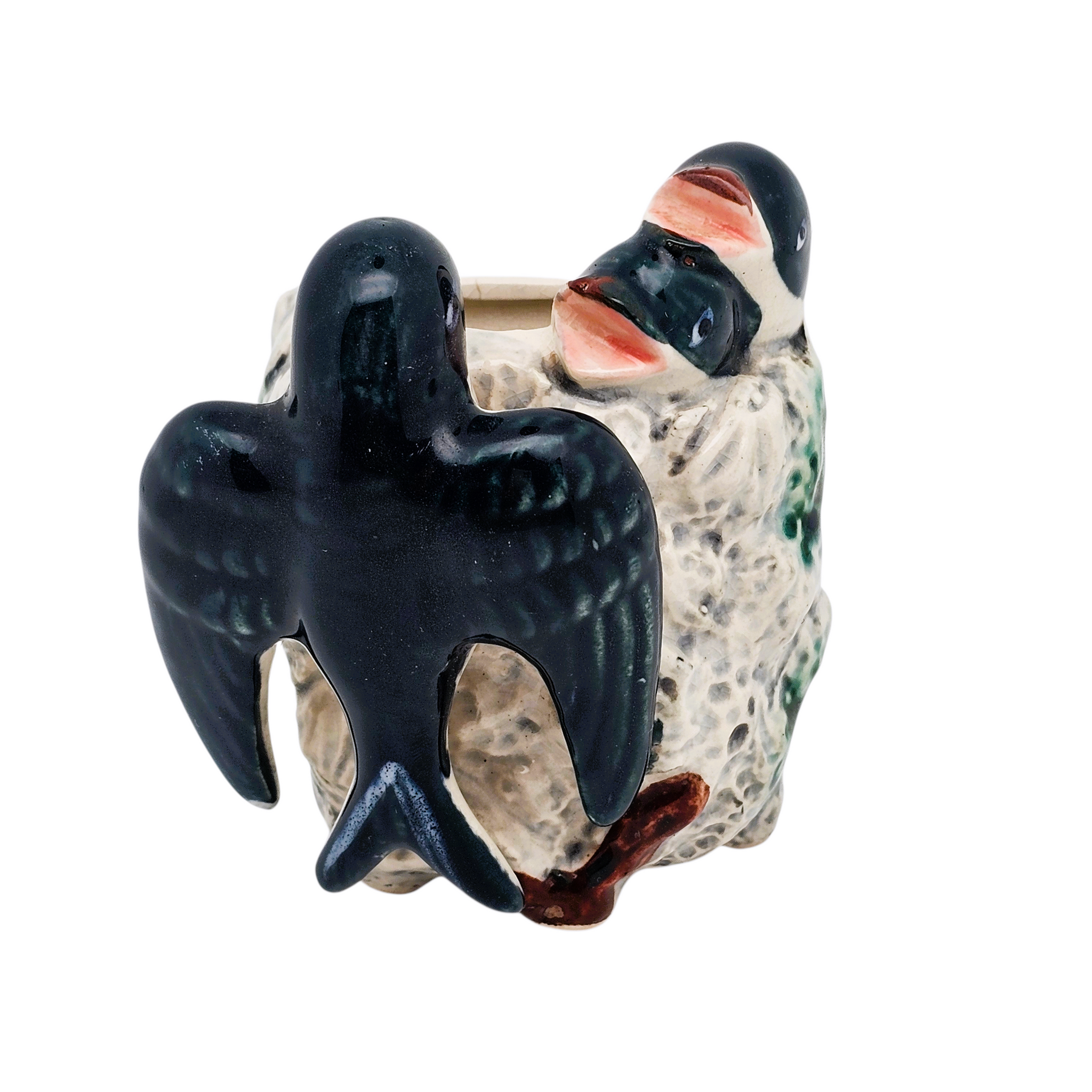 Charmante petite suspension murale en céramique représentant un nid d’hirondelles avec l'un des parents veillant sur leurs oisillons. Une scène pleine de tendresse et de poésie, symbole du foyer, de la protection et du renouveau.