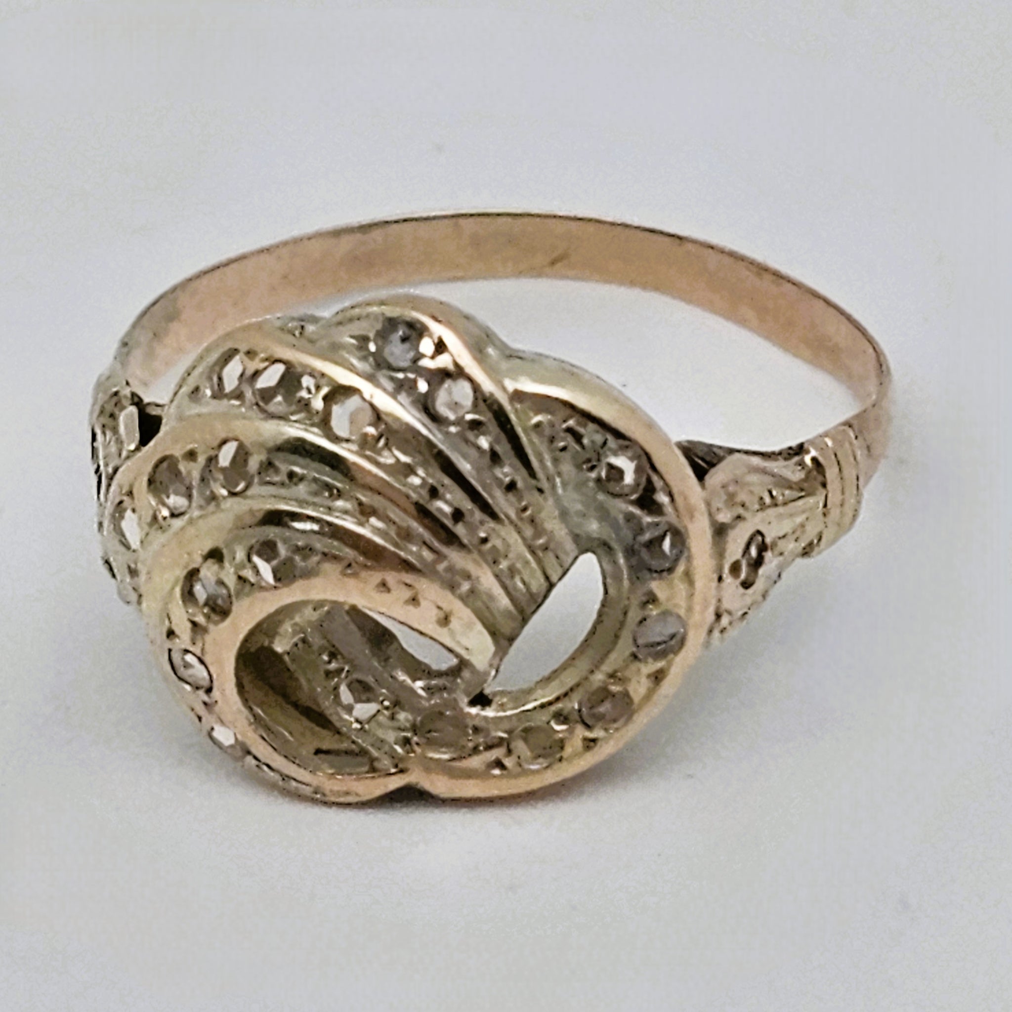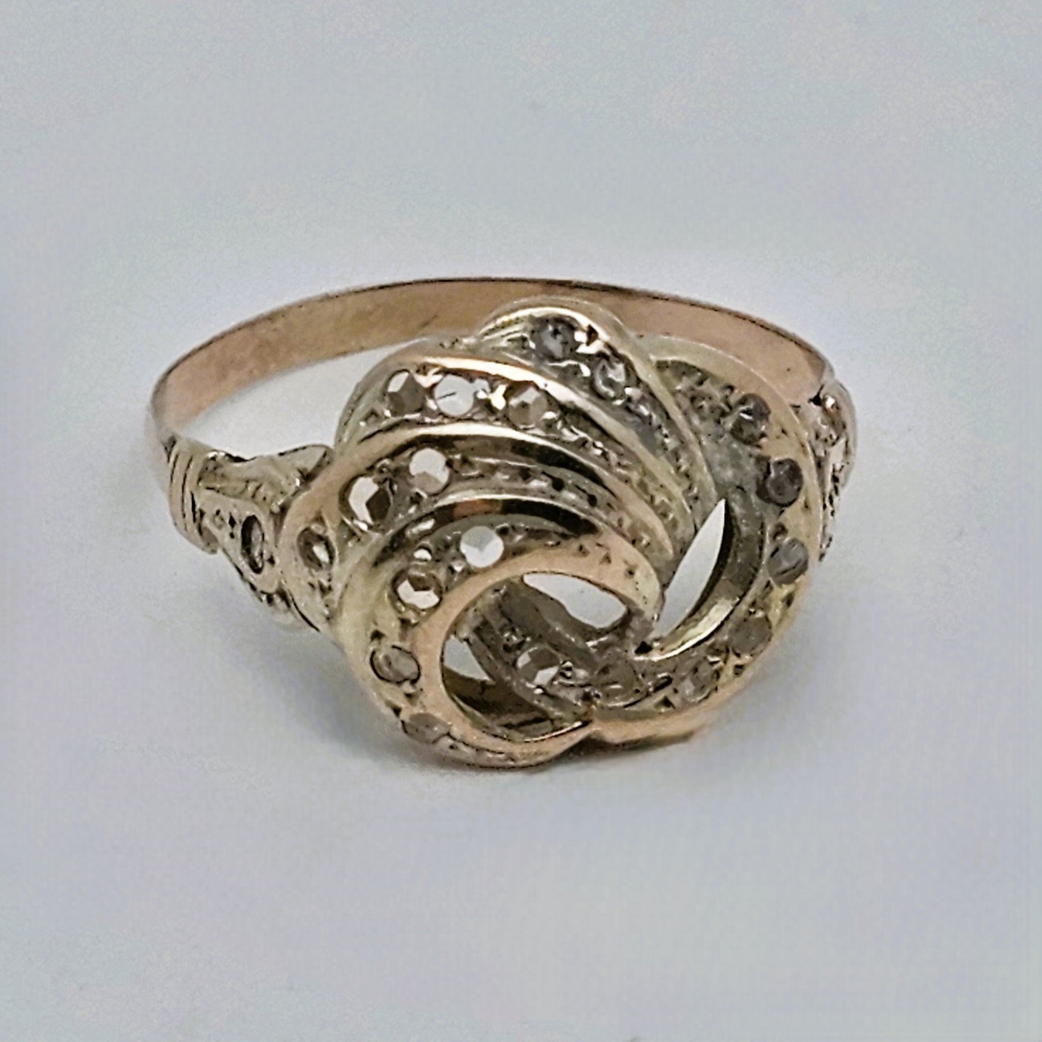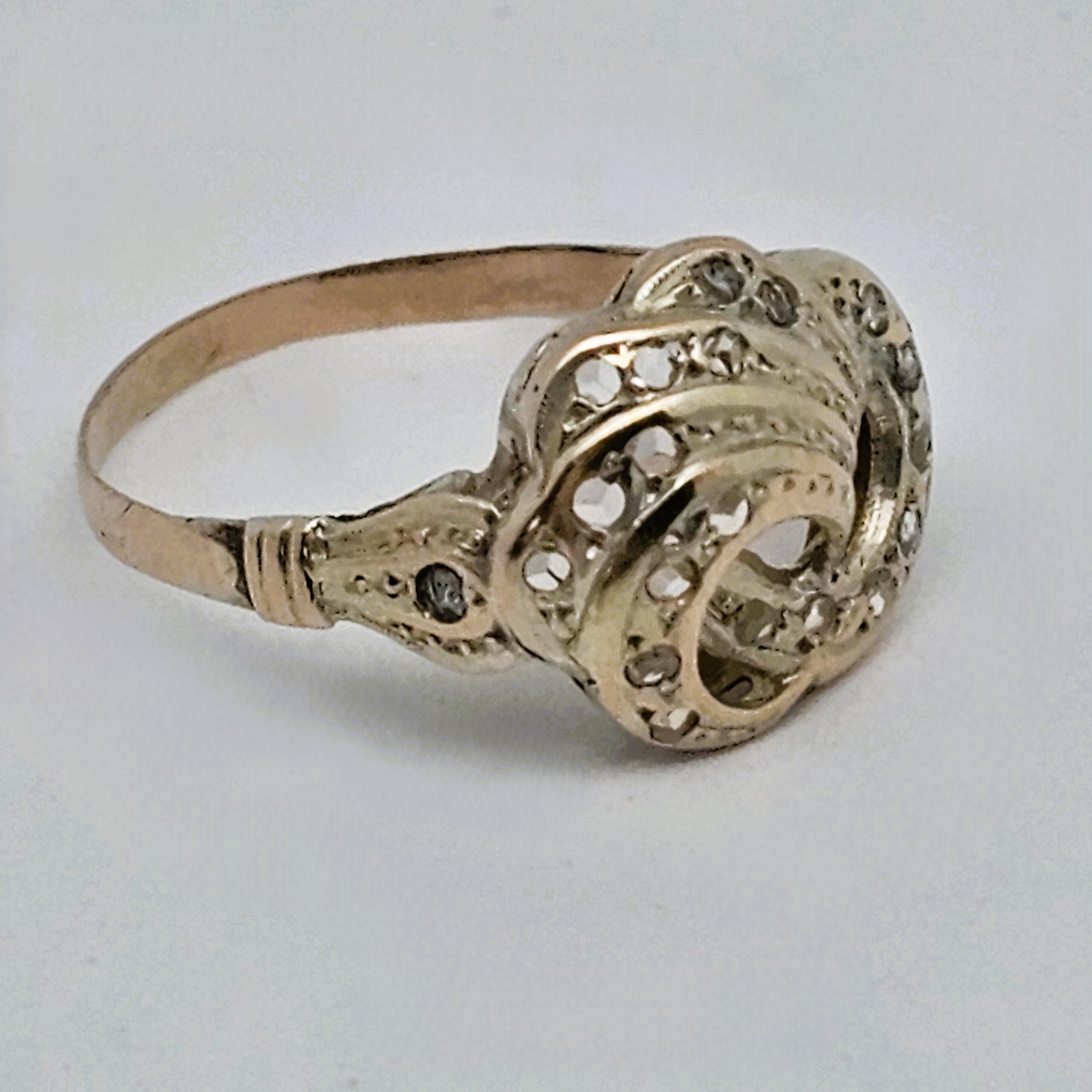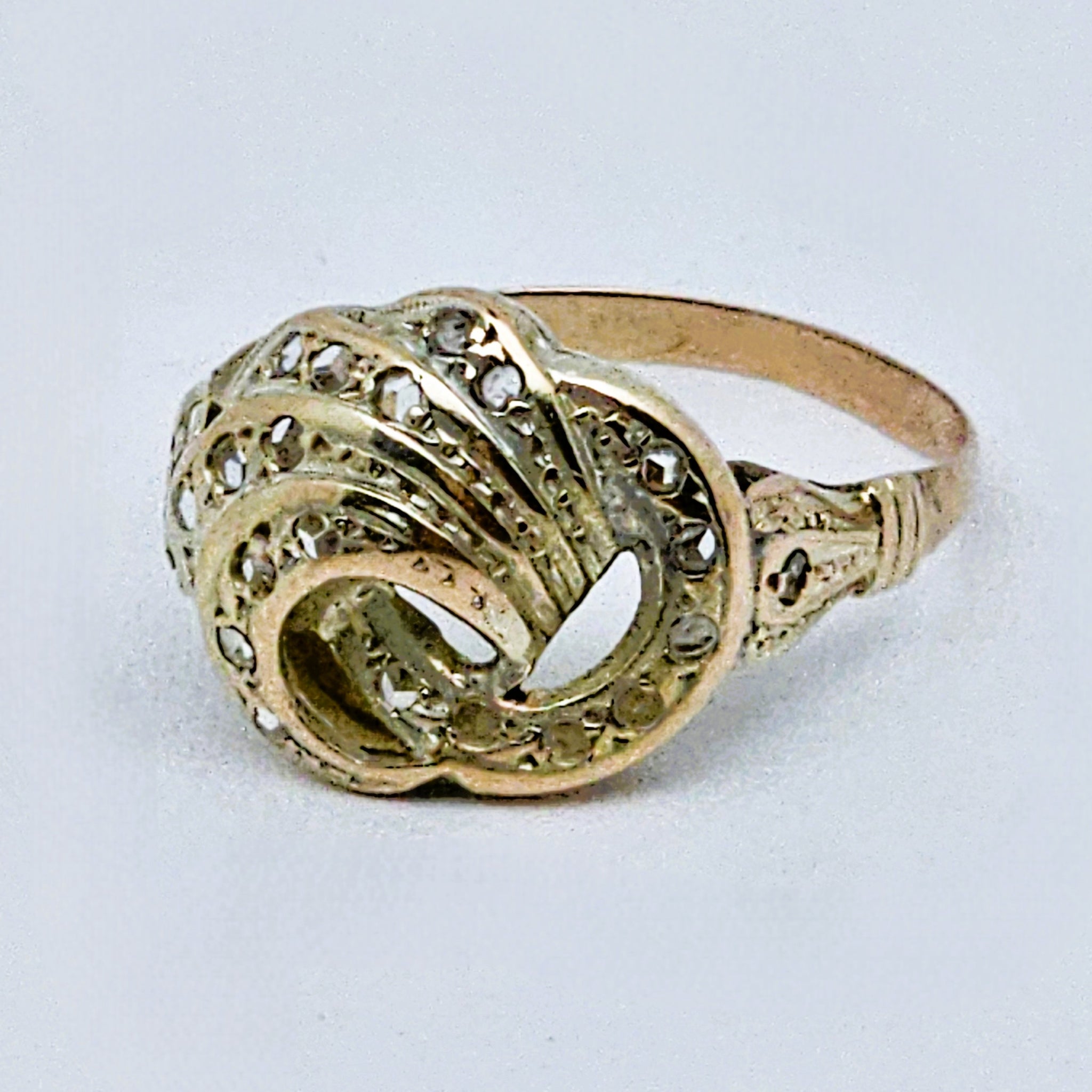 Élégante bague ancienne en or 14 carats (or étranger, sans poinçon français), probablement de fabrication espagnole, sertie de 21 diamants taille rose.