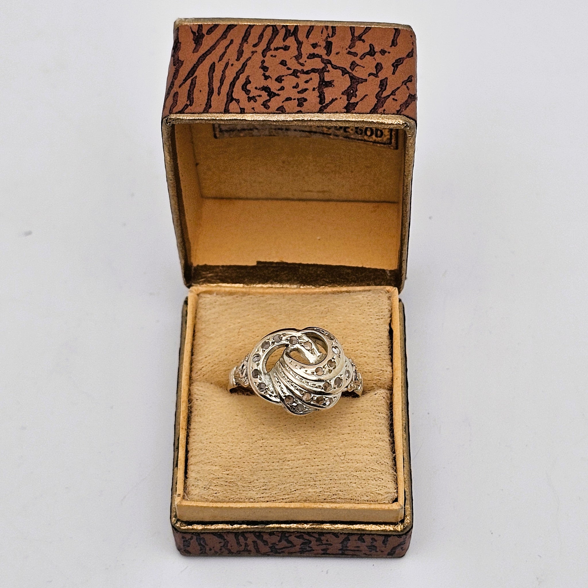Le motif ajouré du dessus, composé de volutes imbriquées, est typique des bijoux de la fin du XIXe siècle / début Belle Époque. Les diamants taille rose, à la coupe ancienne et à la brillance douce, confirment l’ancienneté de cette bague et lui donnent un charme raffiné et délicat.
