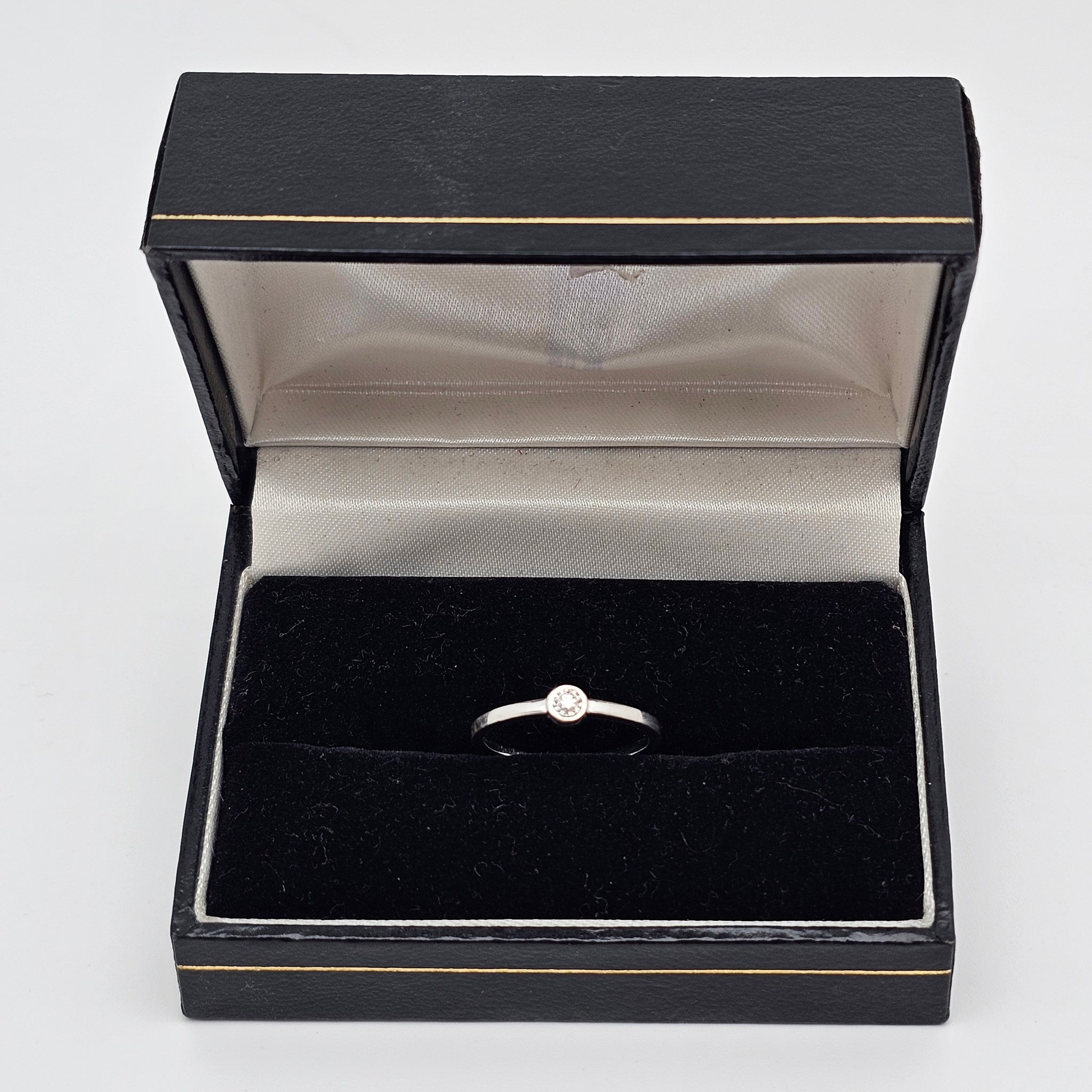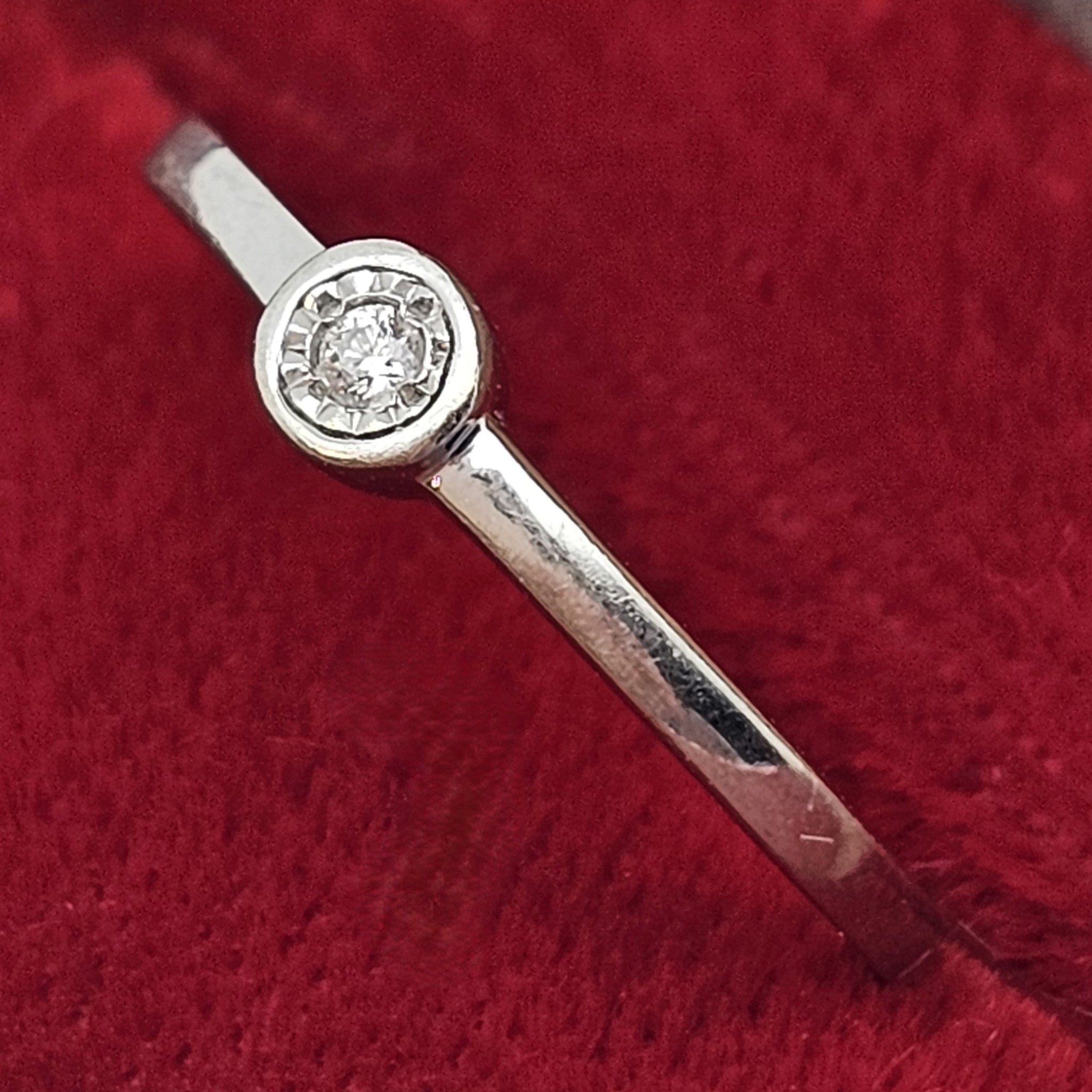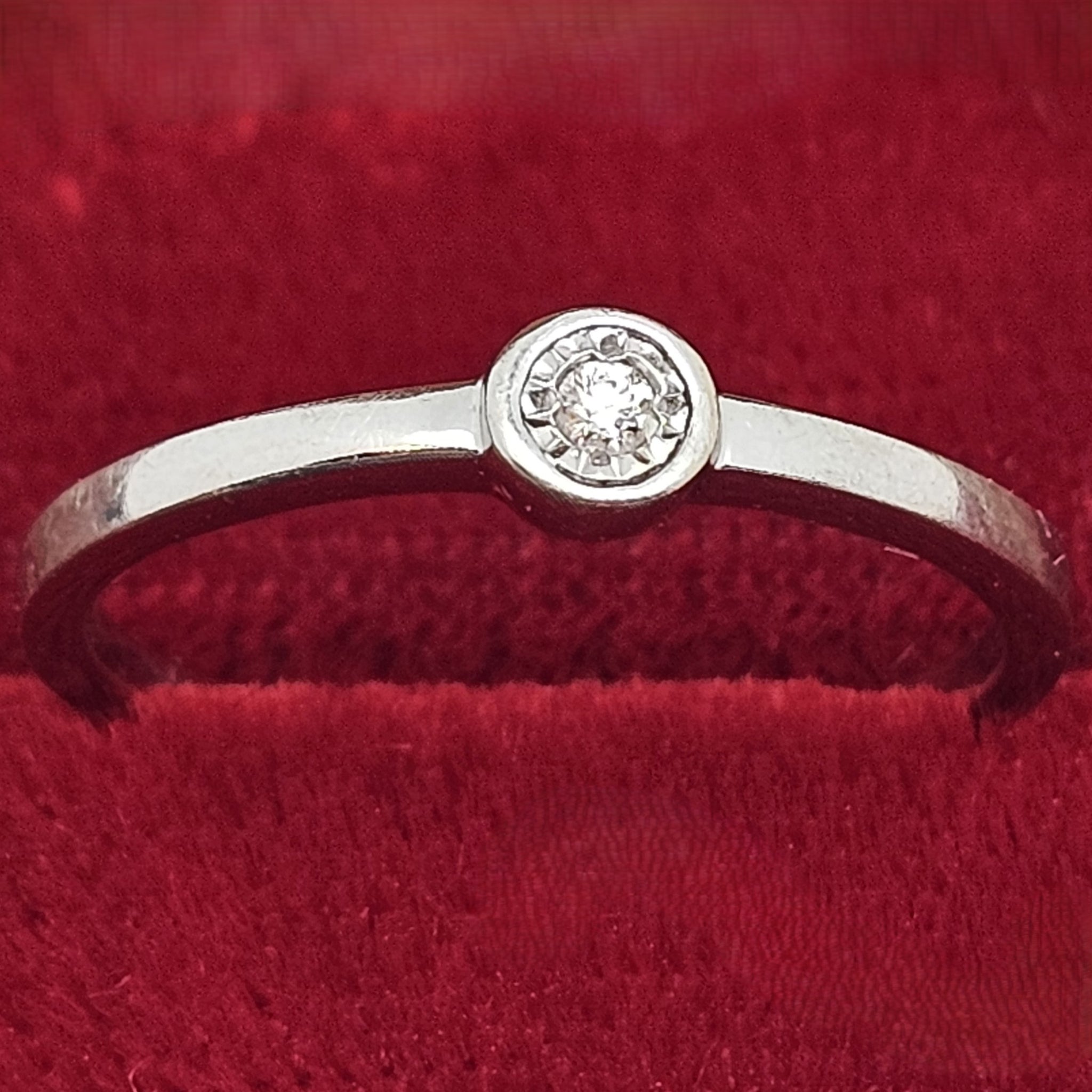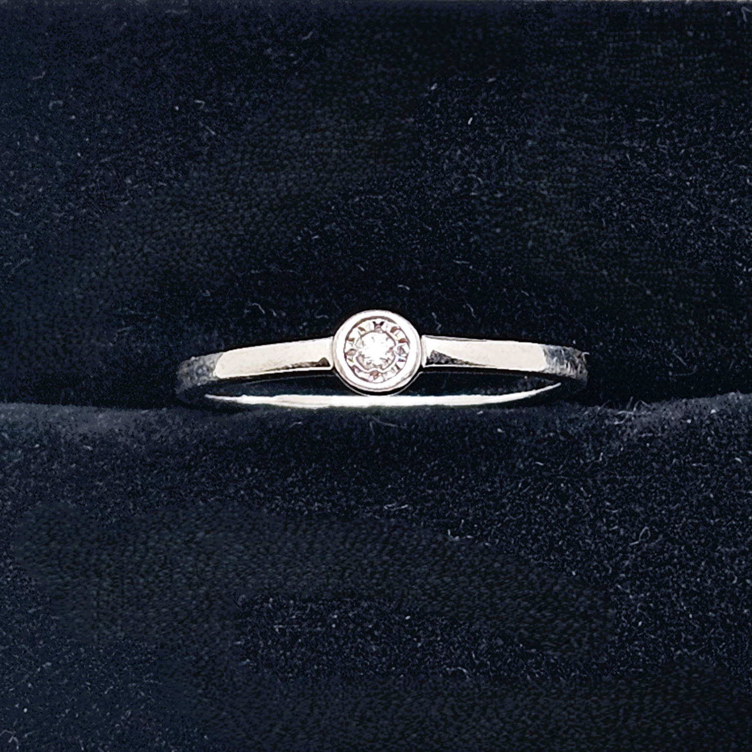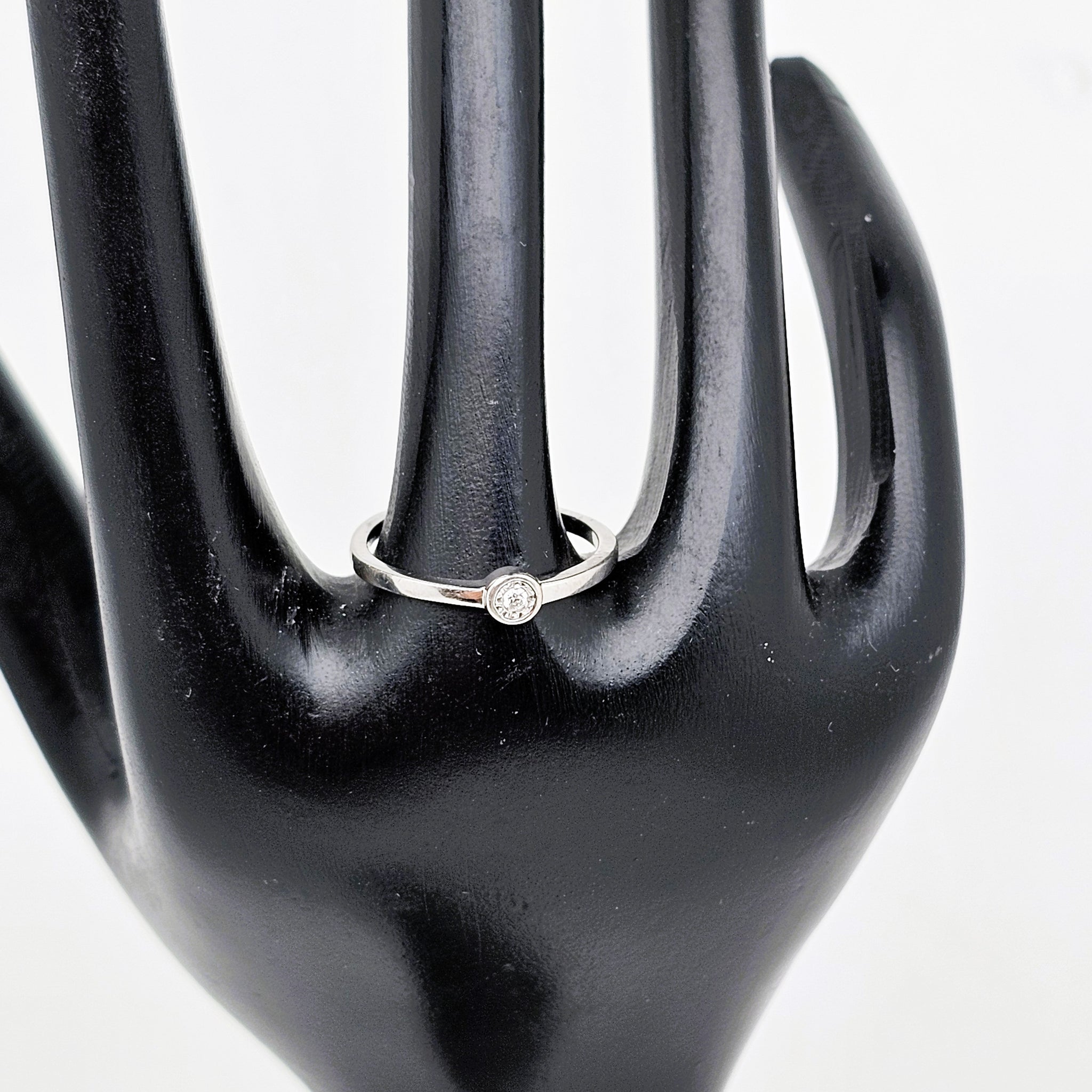 Au centre, un diamant d’environ 0,06 carat, taillé en brillant et mis en valeur par un serti clos délicatement facetté, capte joliment la lumière. Une création sobre et intemporelle, idéale à porter seule ou en accumulation.