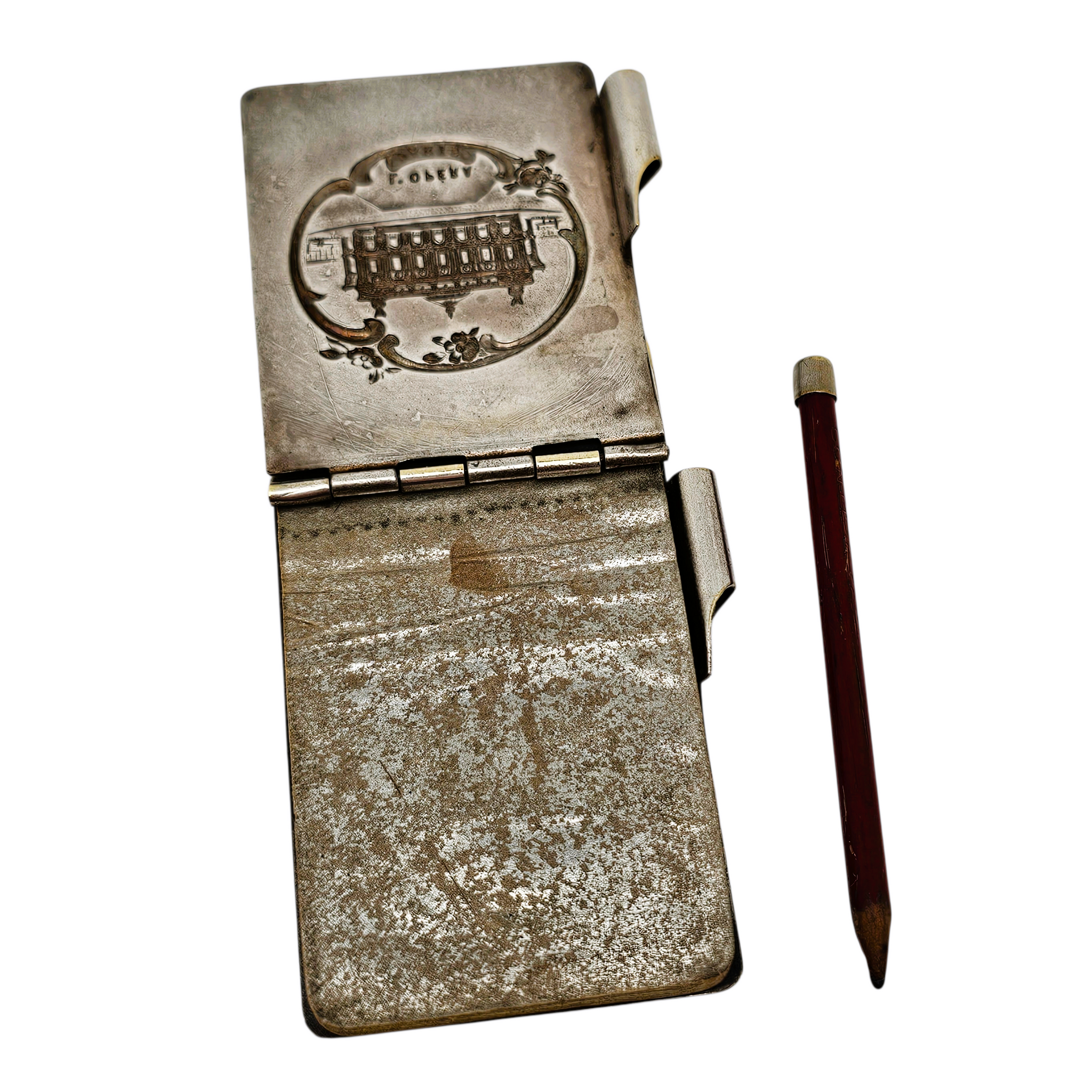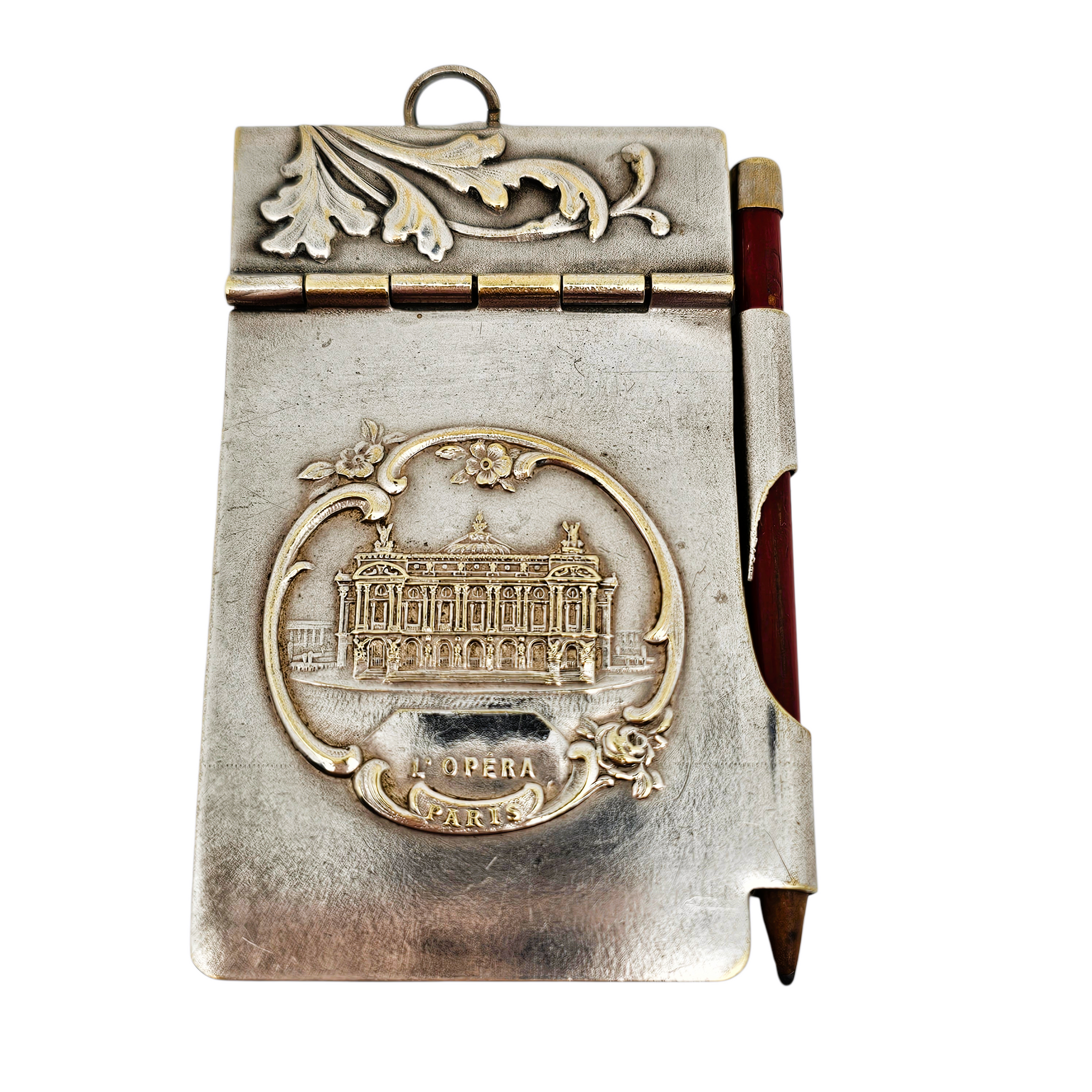 Destiné à accompagner les dames lors des bals, il conserve son crayon d'origine , ainsi que ses feuillets intérieurs anciens , aujourd'hui joliment patinés par le temps. Un anneau situé sur le dessus permettait de le suspendre à une chaînette ou à une châtelaine.