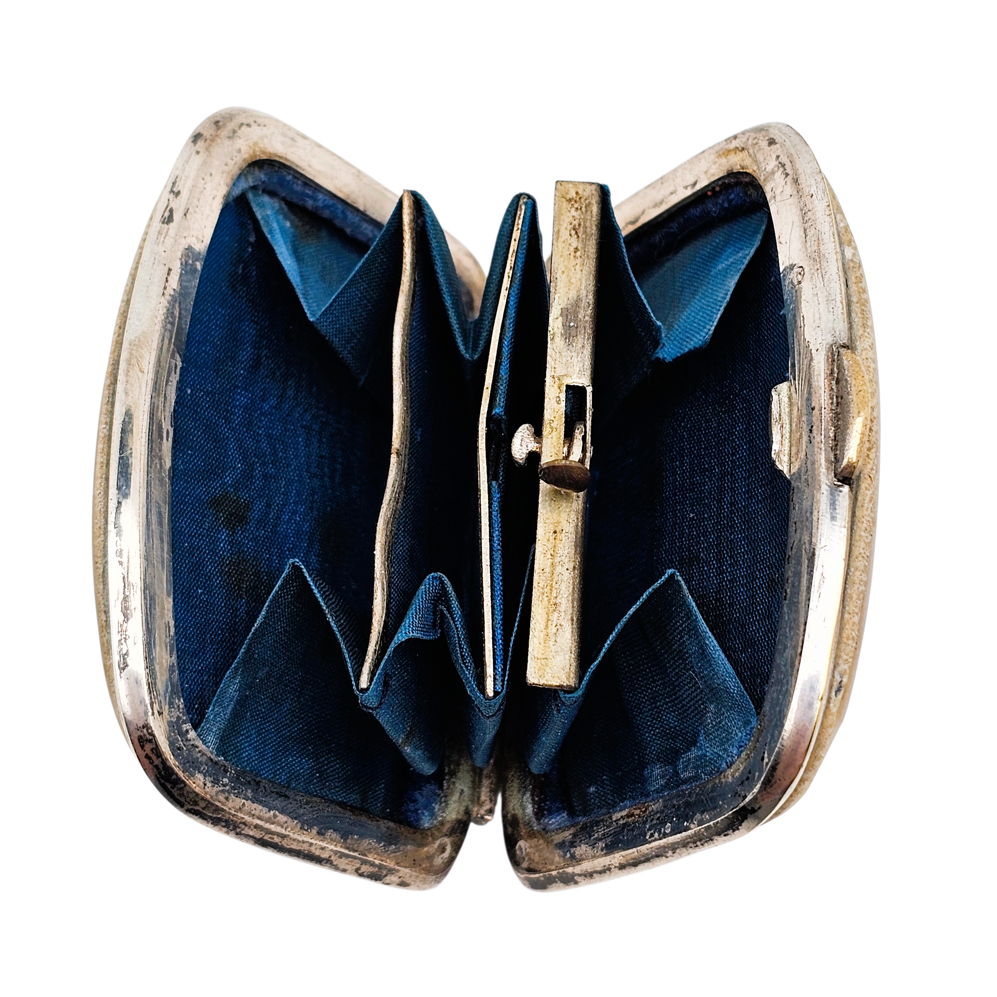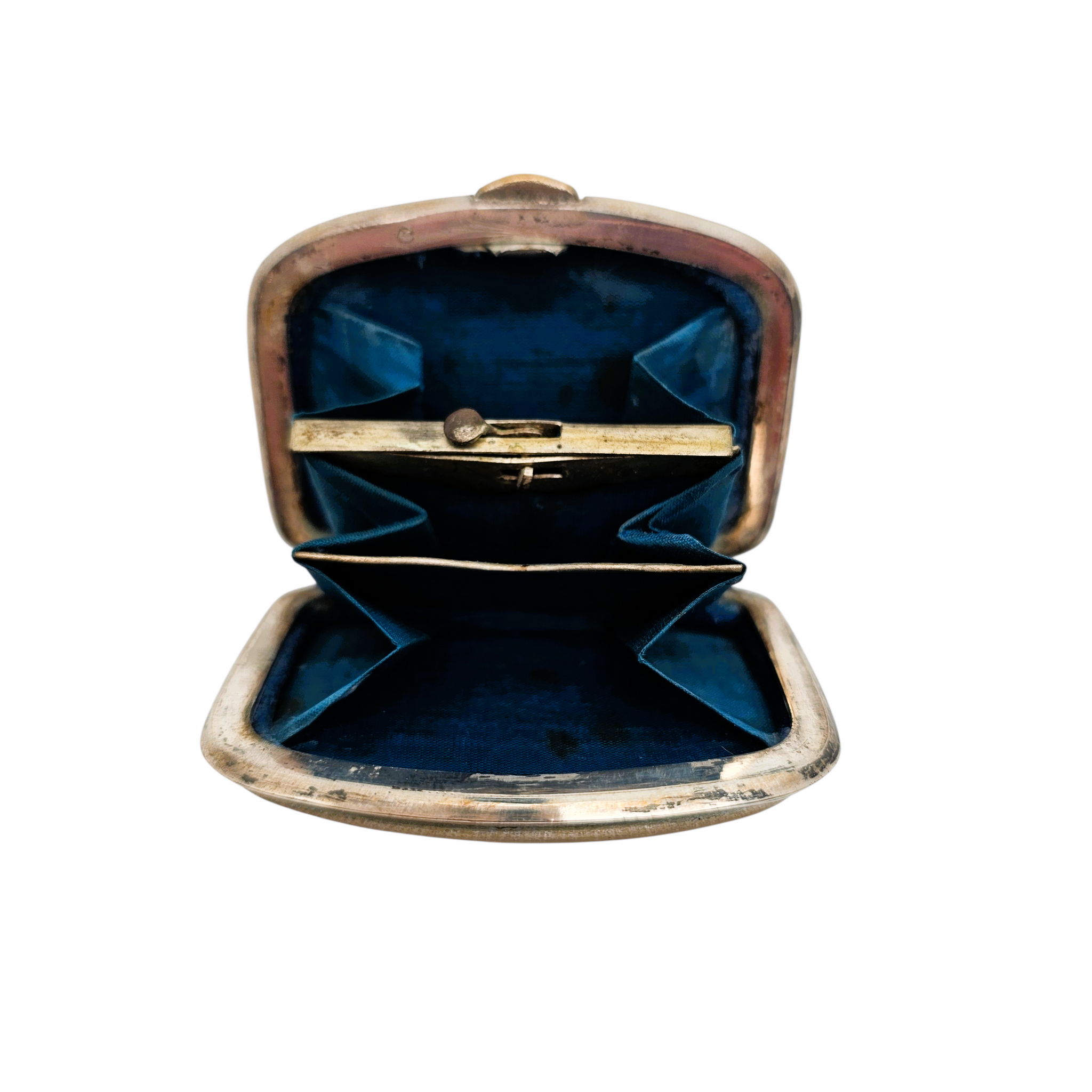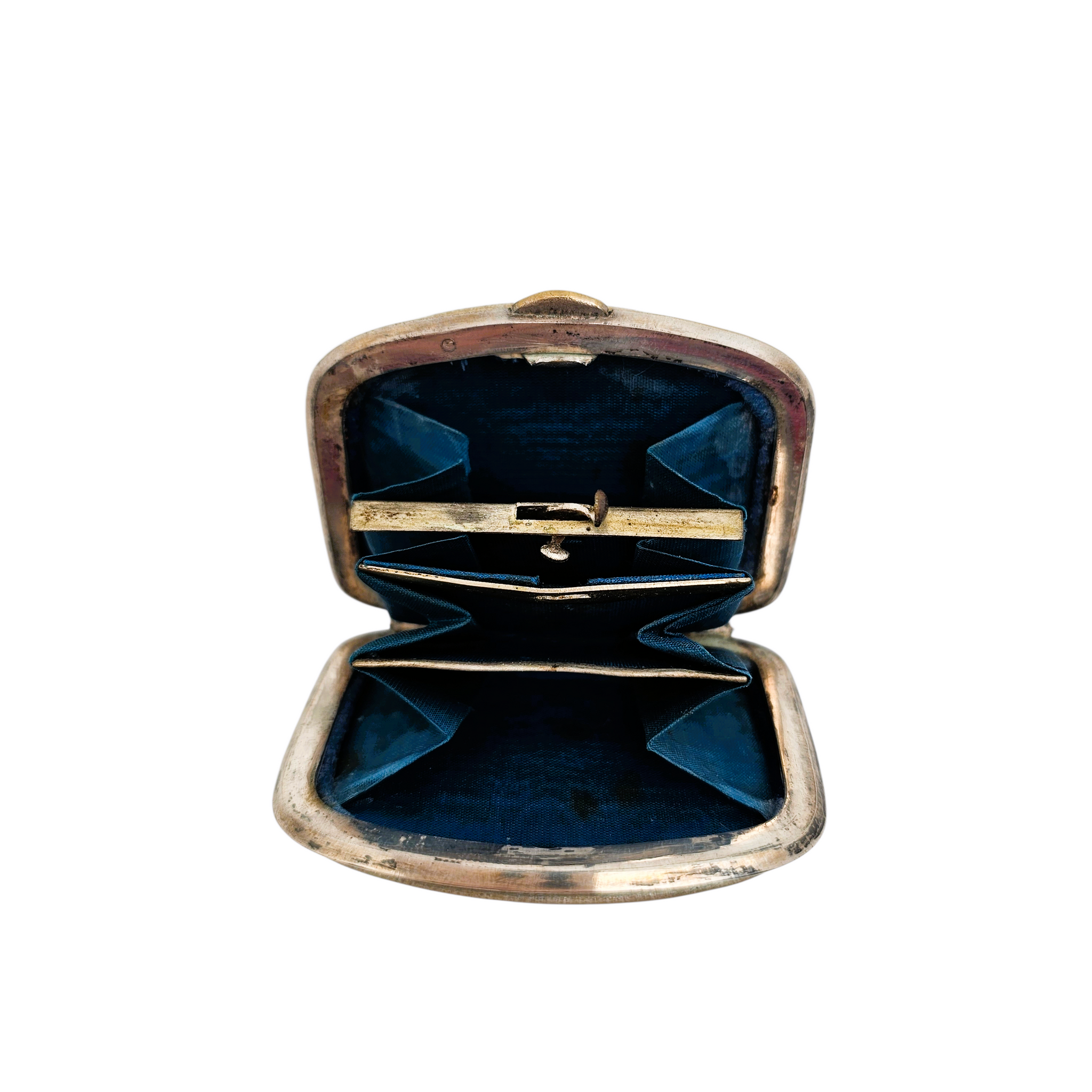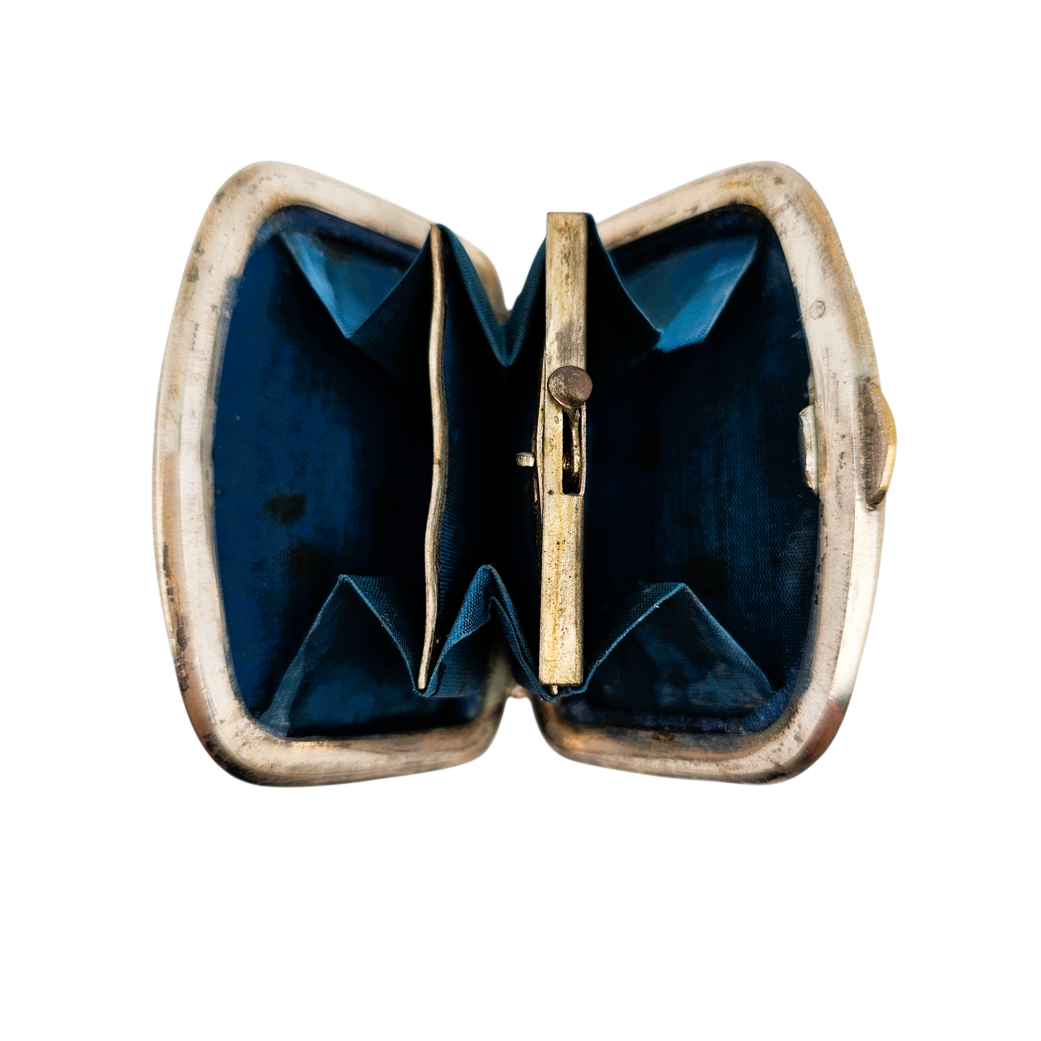 L’intérieur, habillé de soie moirée bleue (probable) joliment conservée, présente plusieurs soufflets bien structurés, ainsi qu’une poche supplémentaire dotée de son petit fermoir fonctionnel, détail pratique et recherché.