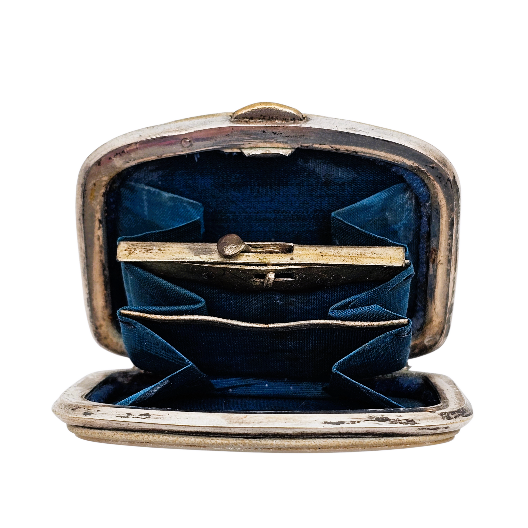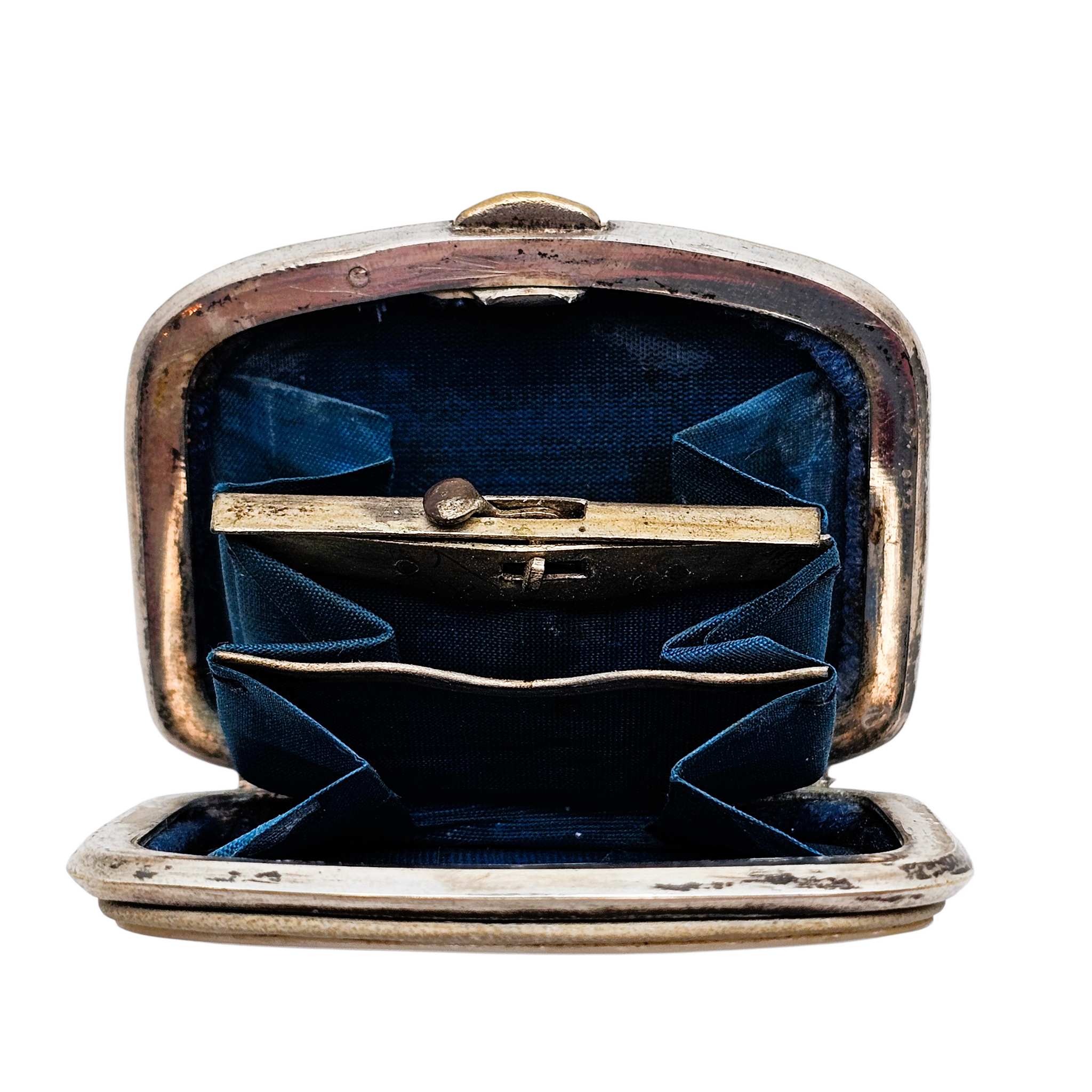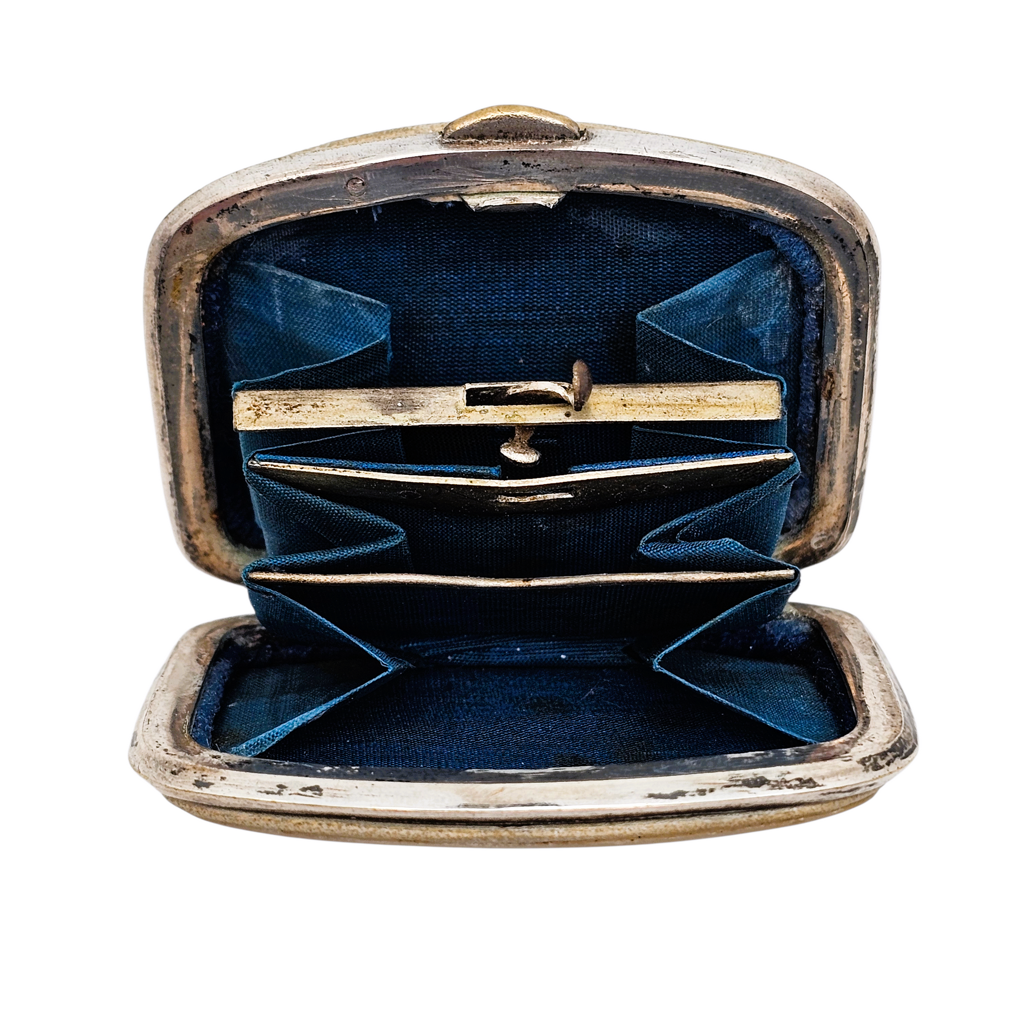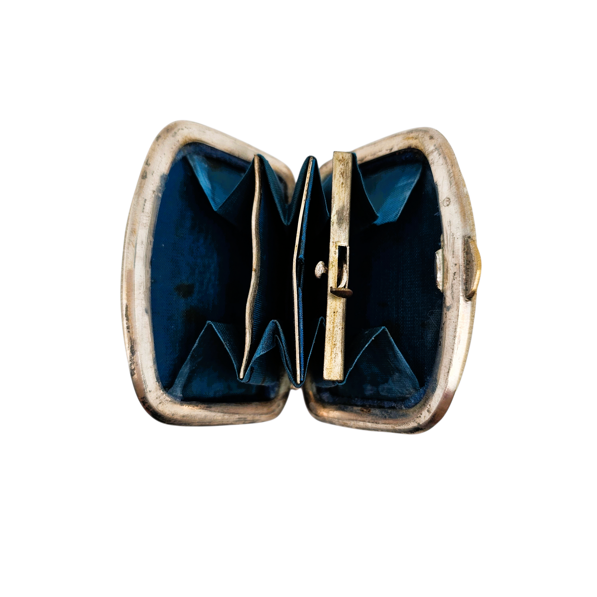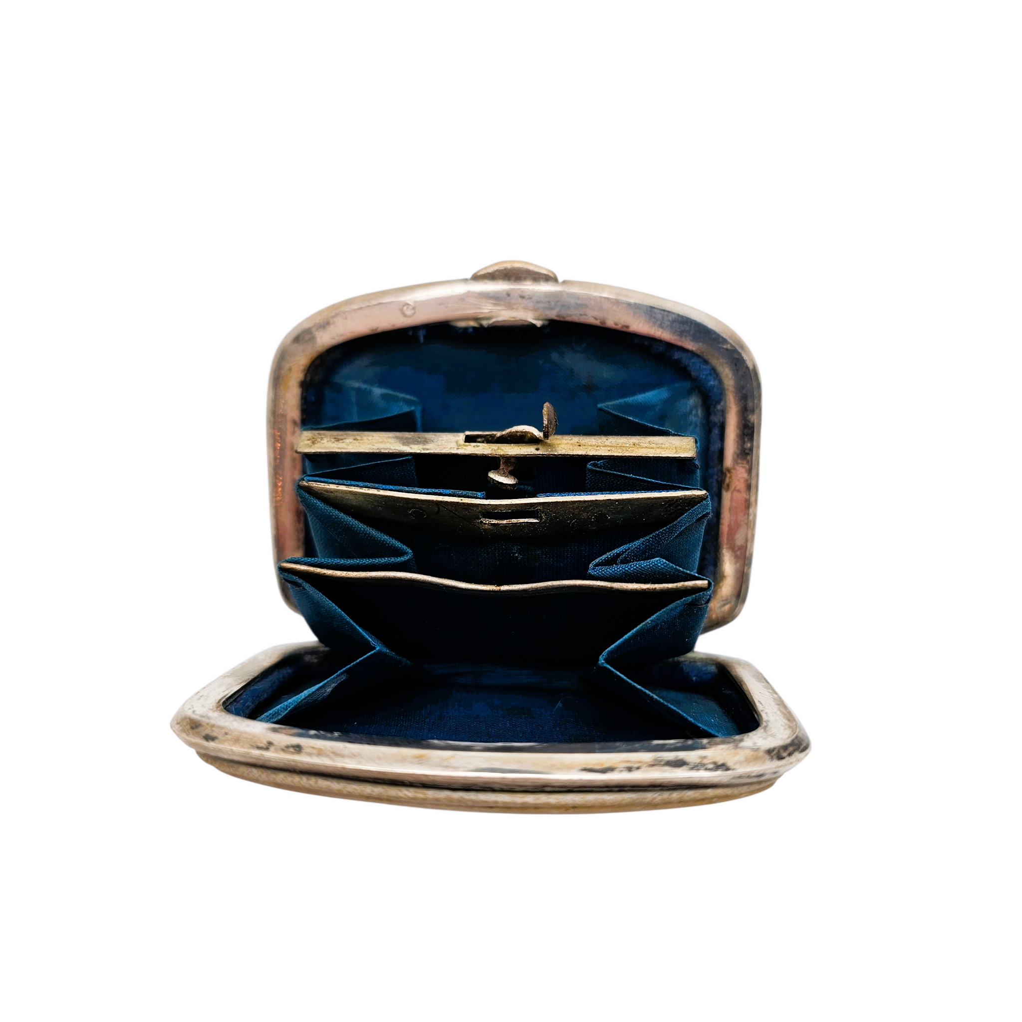 L’intérieur, habillé de soie moirée bleue (probable) joliment conservée, présente plusieurs soufflets bien structurés, ainsi qu’une poche supplémentaire dotée de son petit fermoir fonctionnel, détail pratique et recherché.