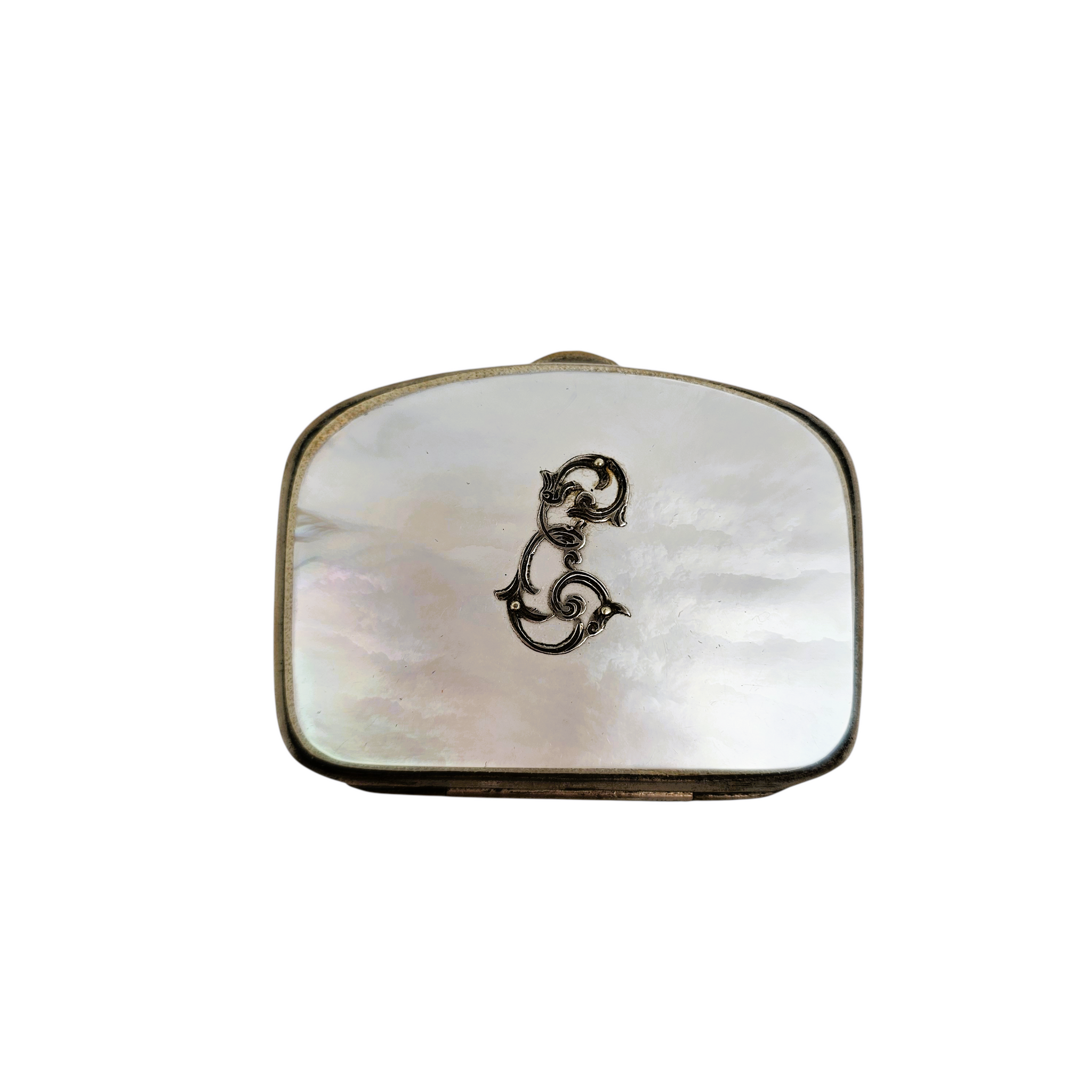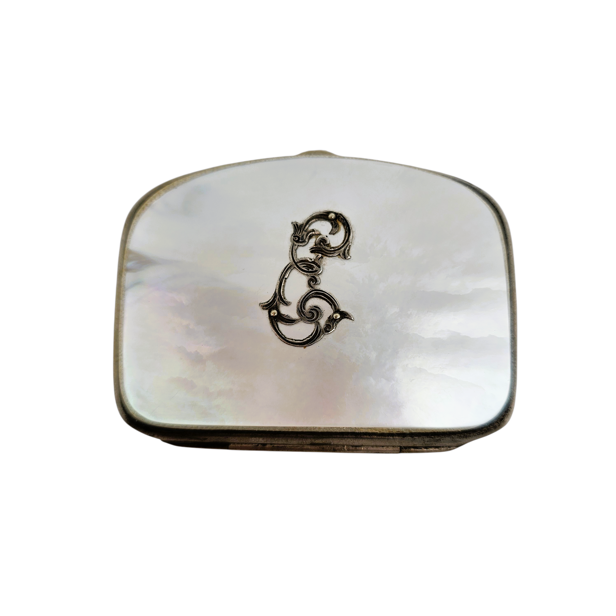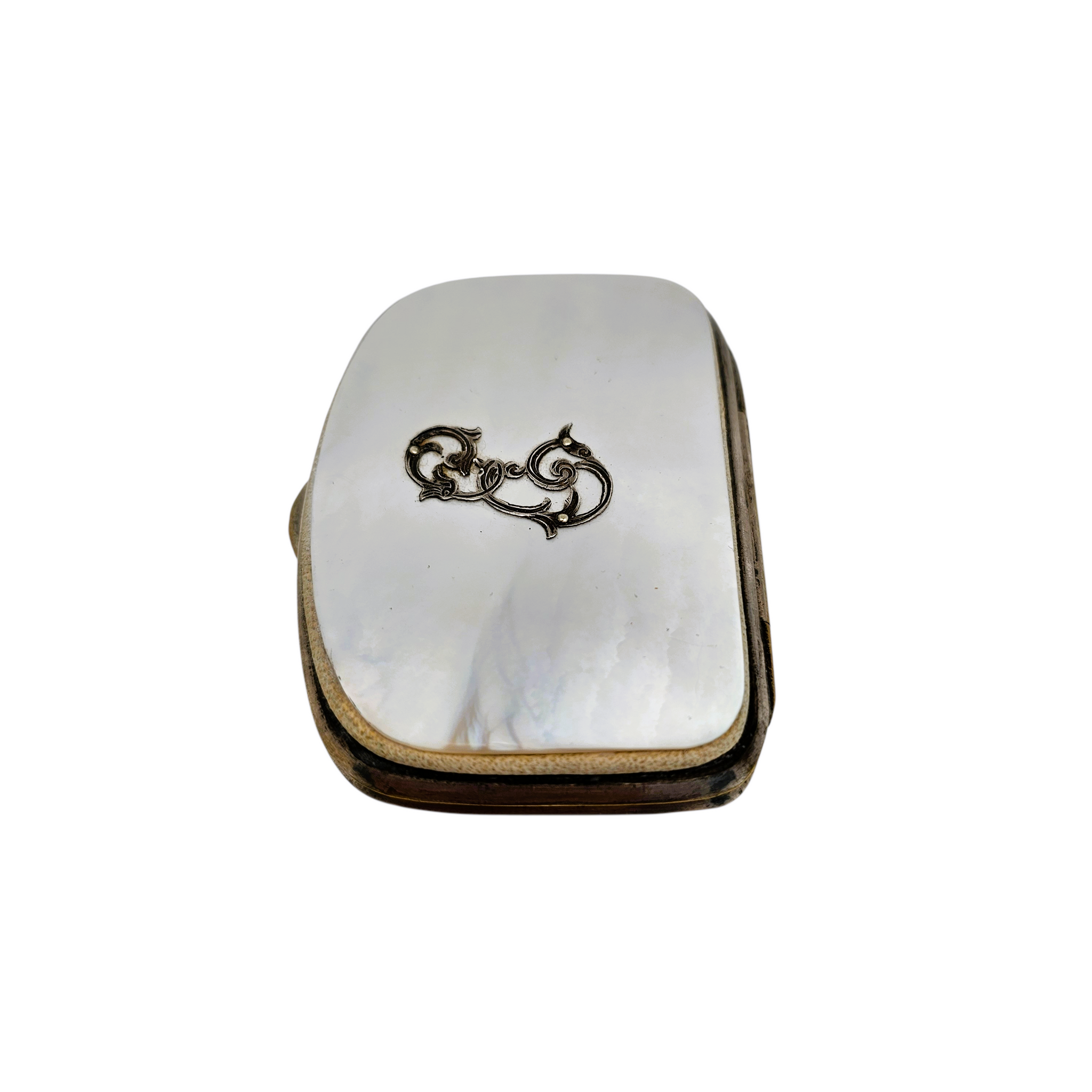 Délicat porte-monnaie ancien en nacre naturelle, monté en métal argenté, orné sur le couvercle d’un monogramme “E” finement travaillé aux lignes végétales, typiques de la fin du XIXᵉ siècle, entre Napoléon III tardif et Belle Époque naissante.