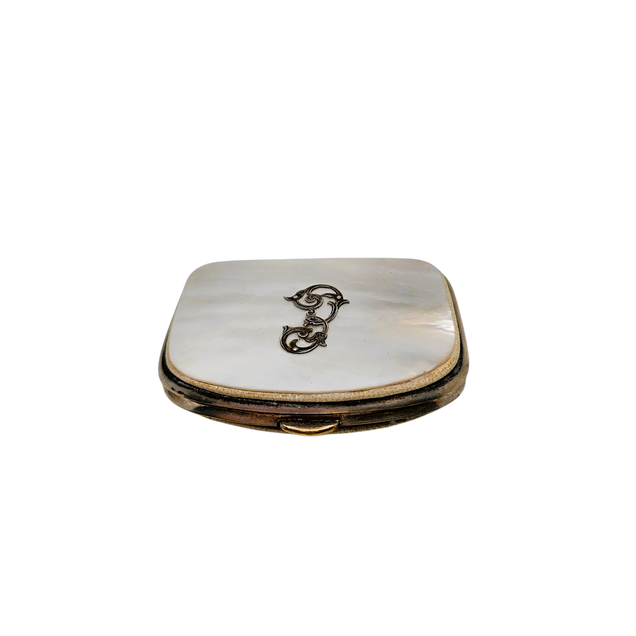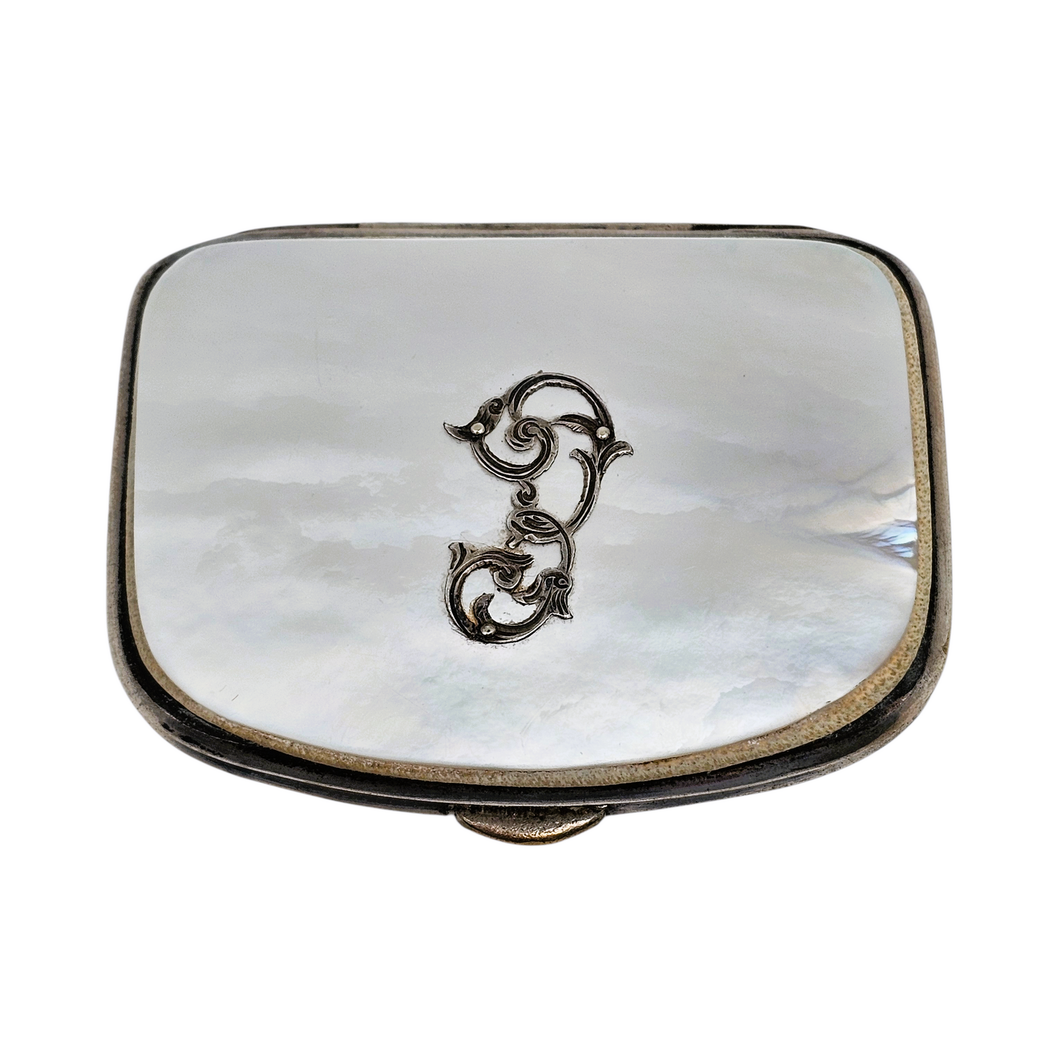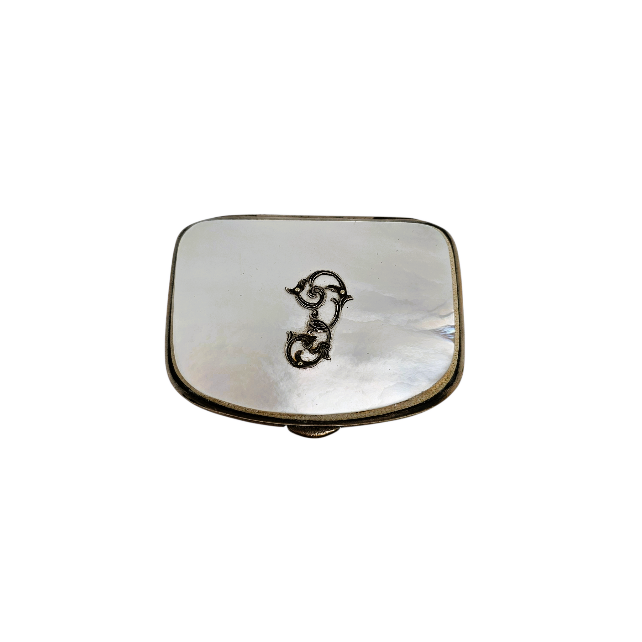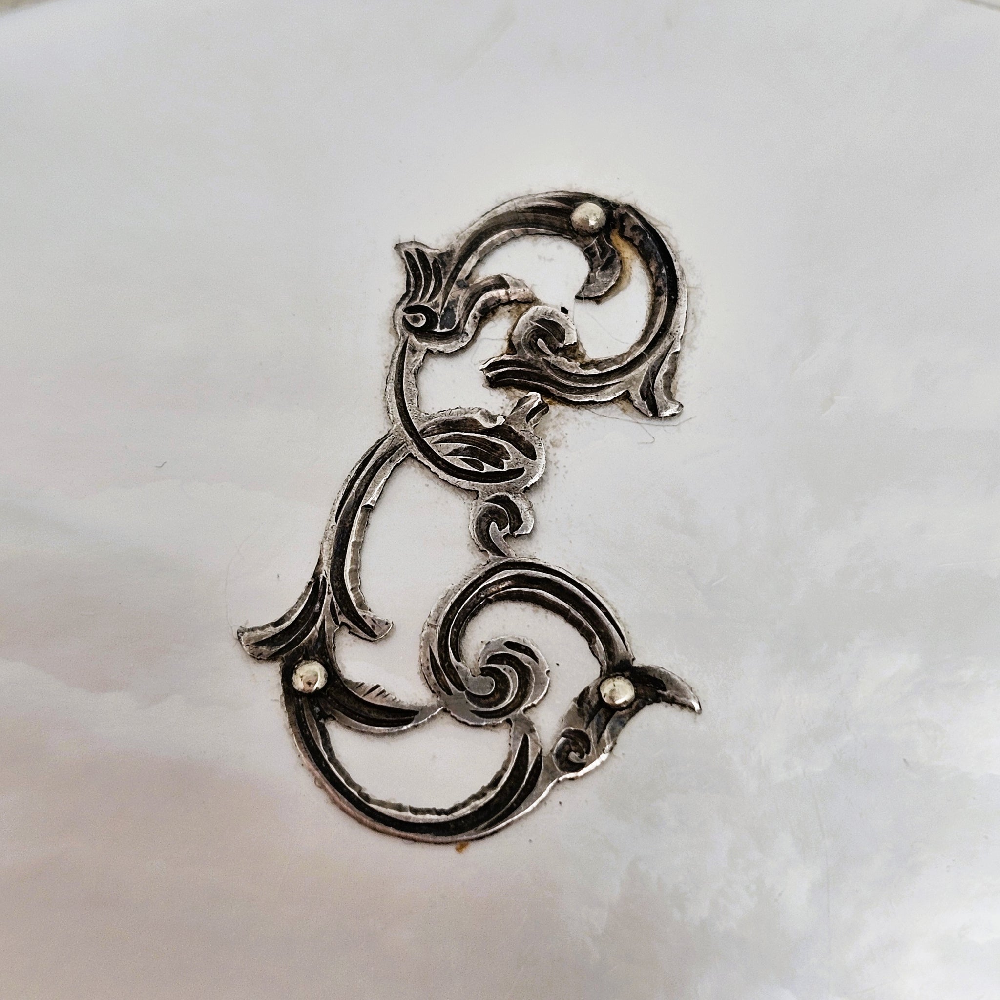 Délicat porte-monnaie ancien en nacre naturelle, monté en métal argenté, orné sur le couvercle d’un monogramme “E” finement travaillé aux lignes végétales, typiques de la fin du XIXᵉ siècle, entre Napoléon III tardif et Belle Époque naissante.