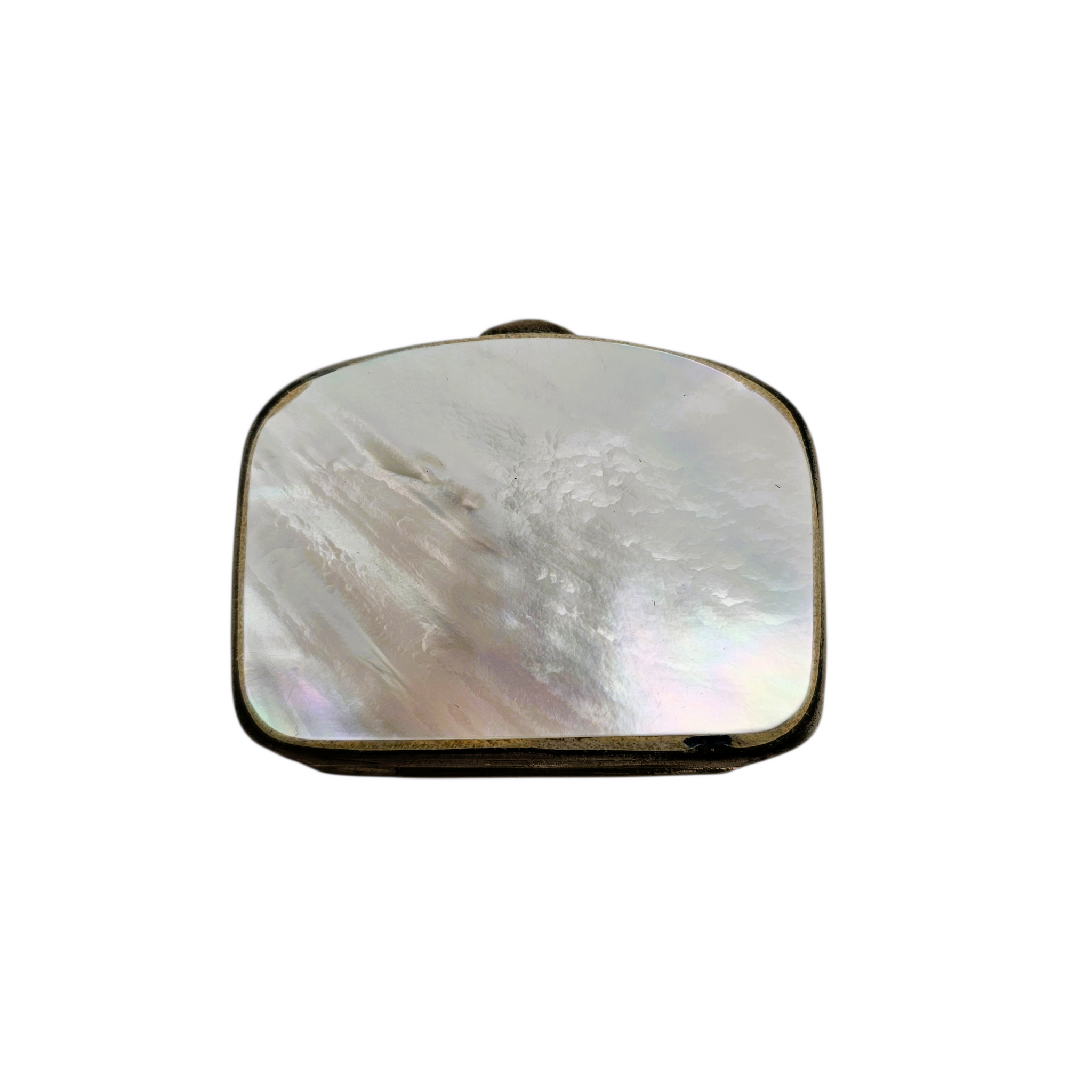Très bel état ancien. Nacre bien conservée, sans éclat. Métal argenté joliment patiné. Fermoirs fonctionnels. Intérieur propre et bien structuré.