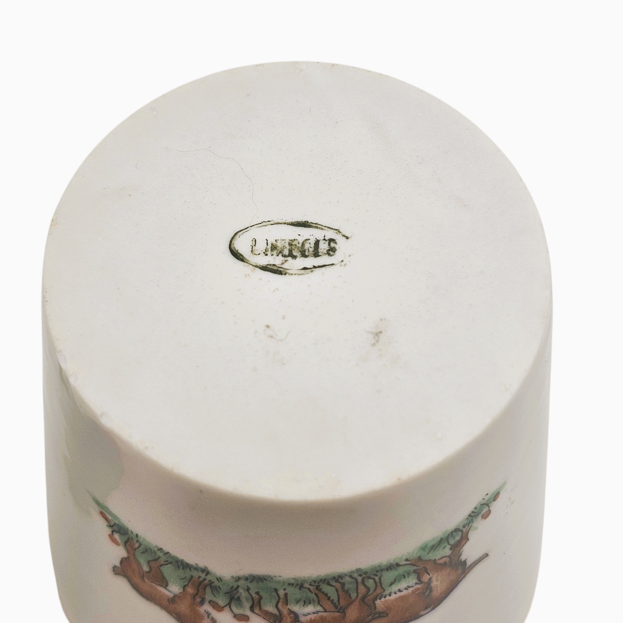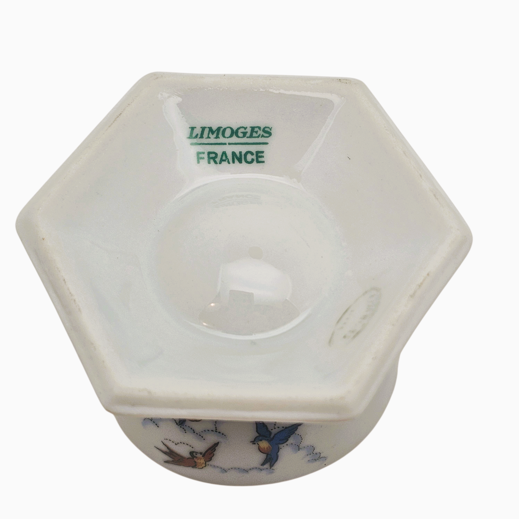 Délicat ensemble en porcelaine de Limoges composé d’un coquetier à base hexagonale et d’un petit gobelet, finement décorés de scènes pastorales représentant de tendres agneaux et de jeunes chevreaux dans un paysage printanier.