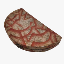Charmant nécessaire à écriture complet composé d'un étui en demi-lune muni de 2 petits fermoirs recouvert d'un papier aux motifs géométriques Art déco gris, brique et or sur le dessus, noir sur le dessous, et de 5 pièces d'écriture, à savoir :