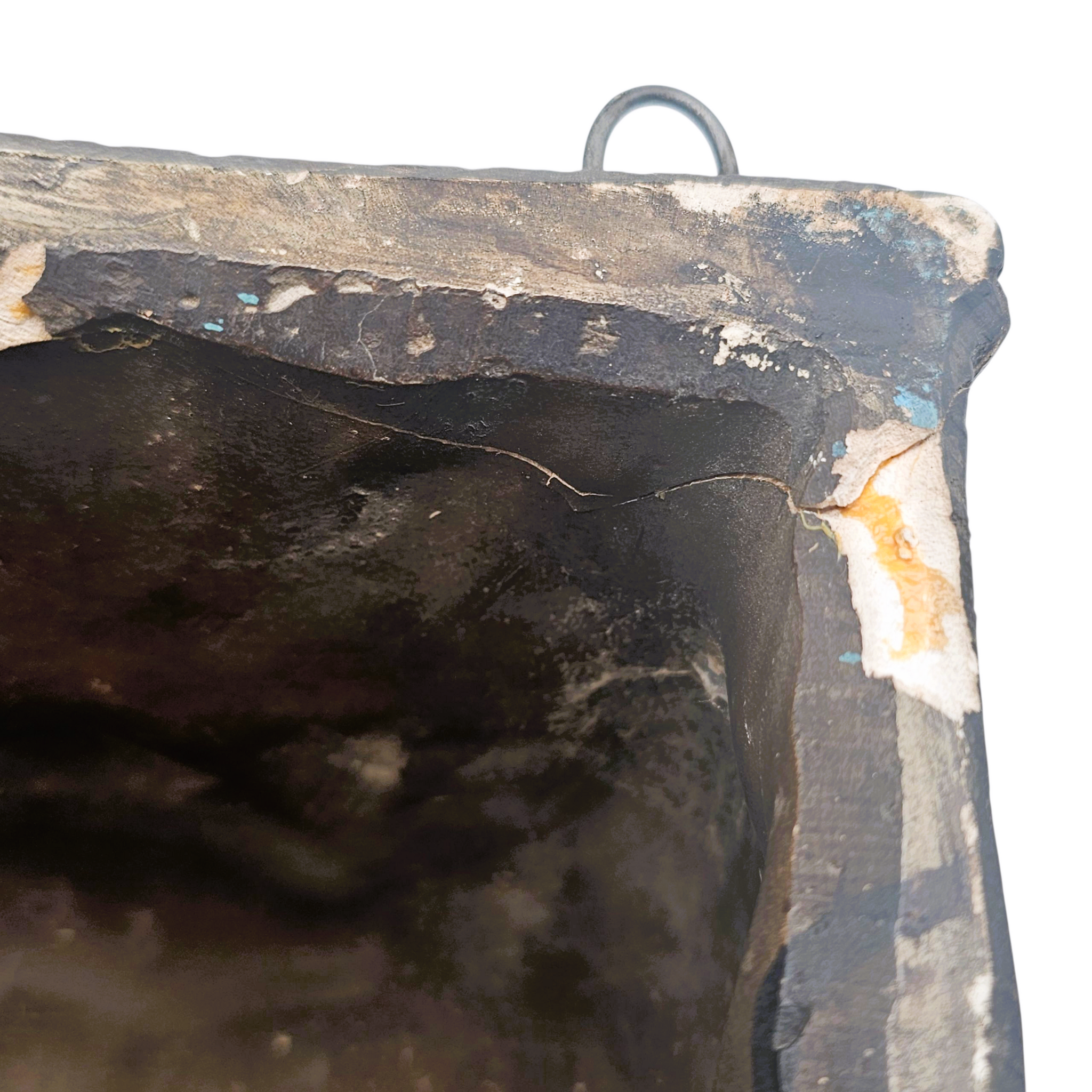 Elle présente une petite fissure et un léger manque sur un bord à l’arrière, non visibles une fois accrochée.
