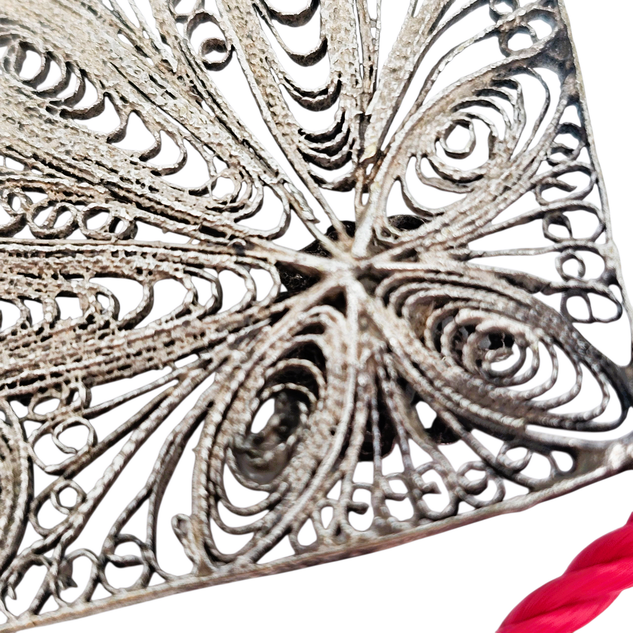 Un bijou chargé d’histoire et d’énergie, où le filigrane dessine la légèreté d’une fleur tandis que le fil rouge, symbole de protection, unit tradition et élégance.