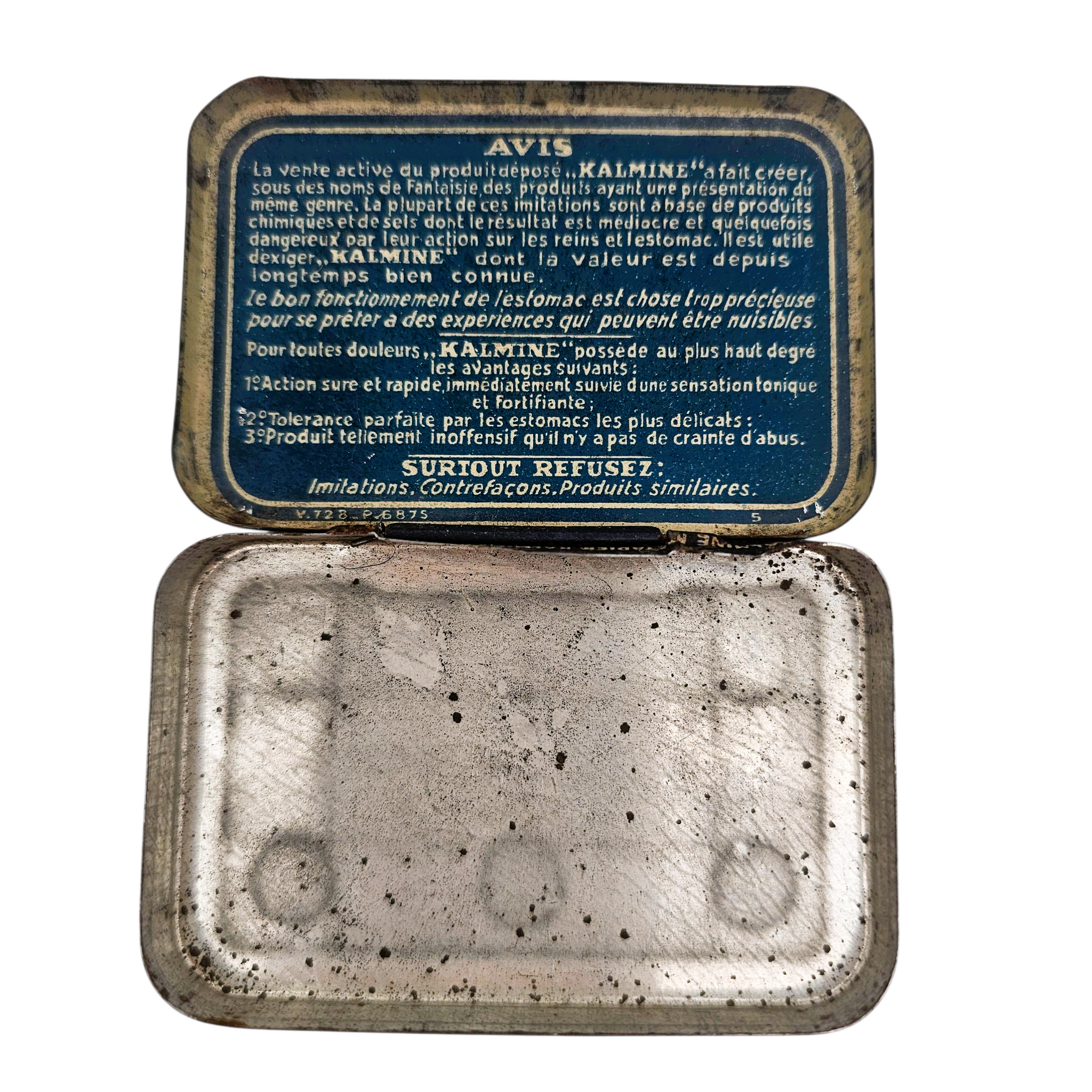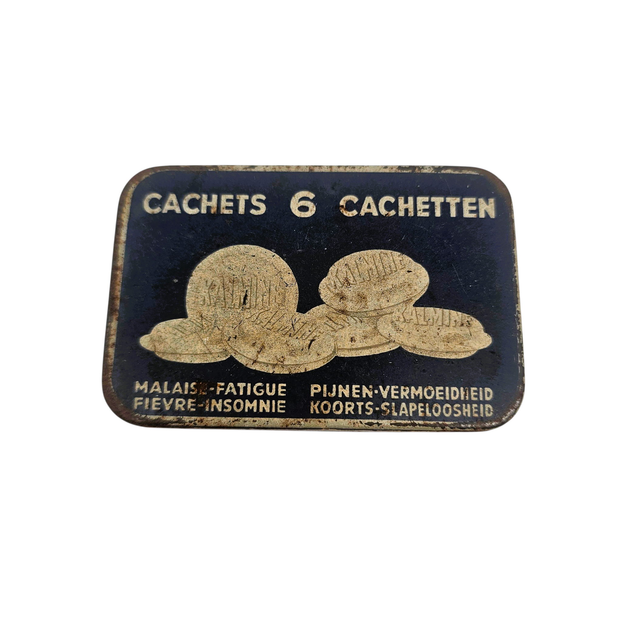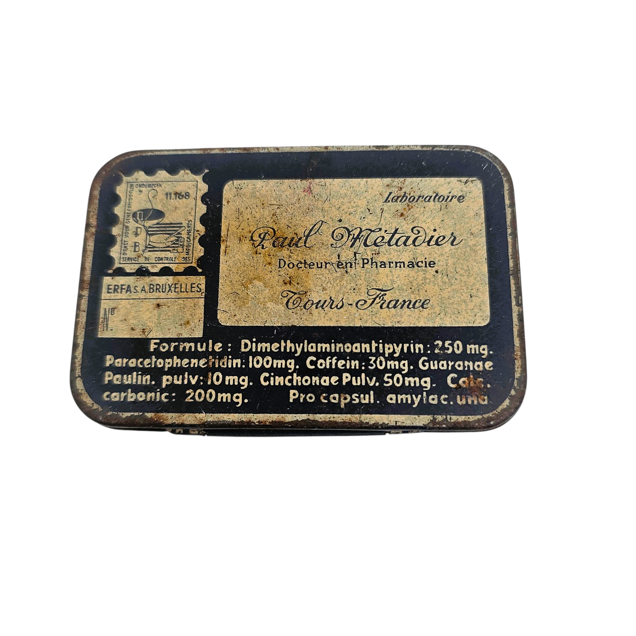 Boîte métallique “Paul Métadier – Tours, France”, années 1930-1940, bilingue français/néerlandais. Tonique contre la fatigue, la fièvre et l’insomnie — une relique du petit arsenal domestique d’avant-guerre.