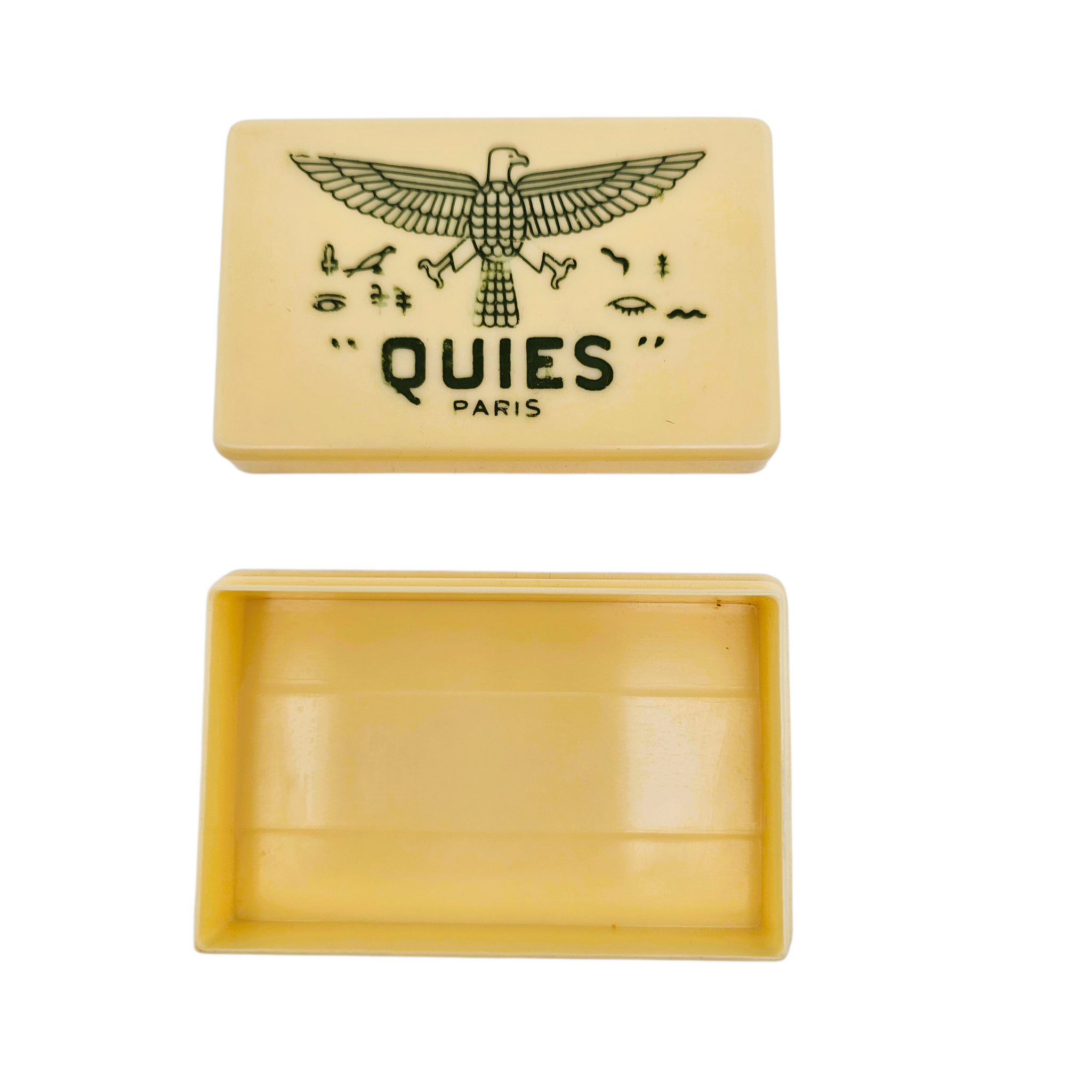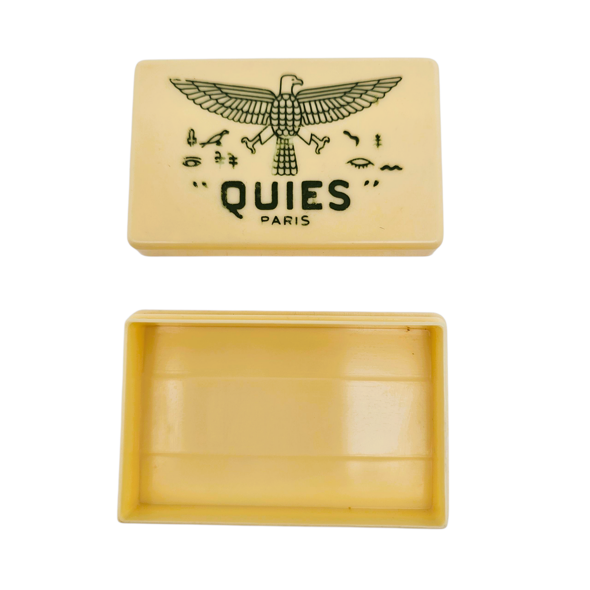 Boîte “Quies – Paris” en plastique ivoire à décor égyptisant noir, années 1950-1960. Boîte à boules Quies pour protéger les oreilles et retrouver le calme.