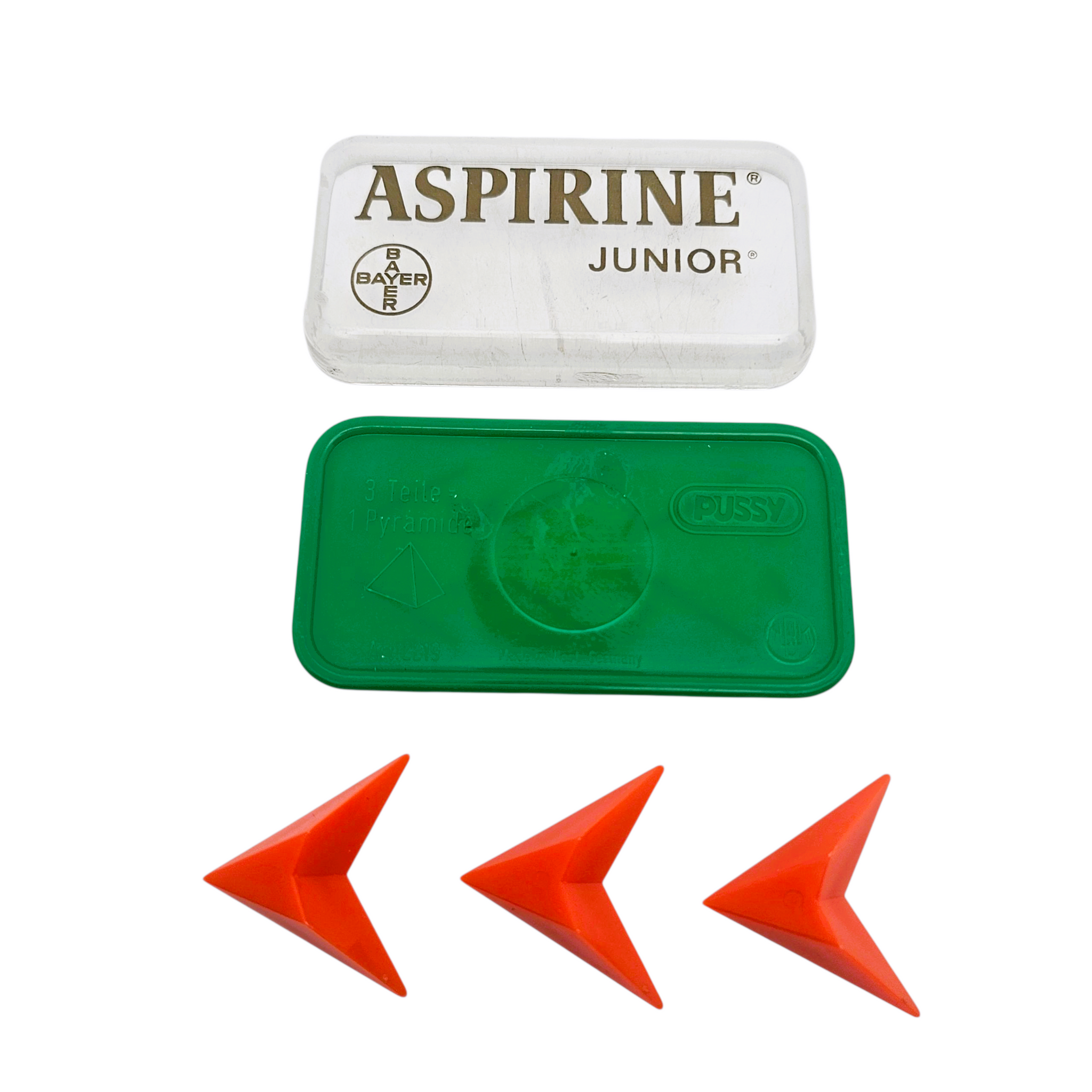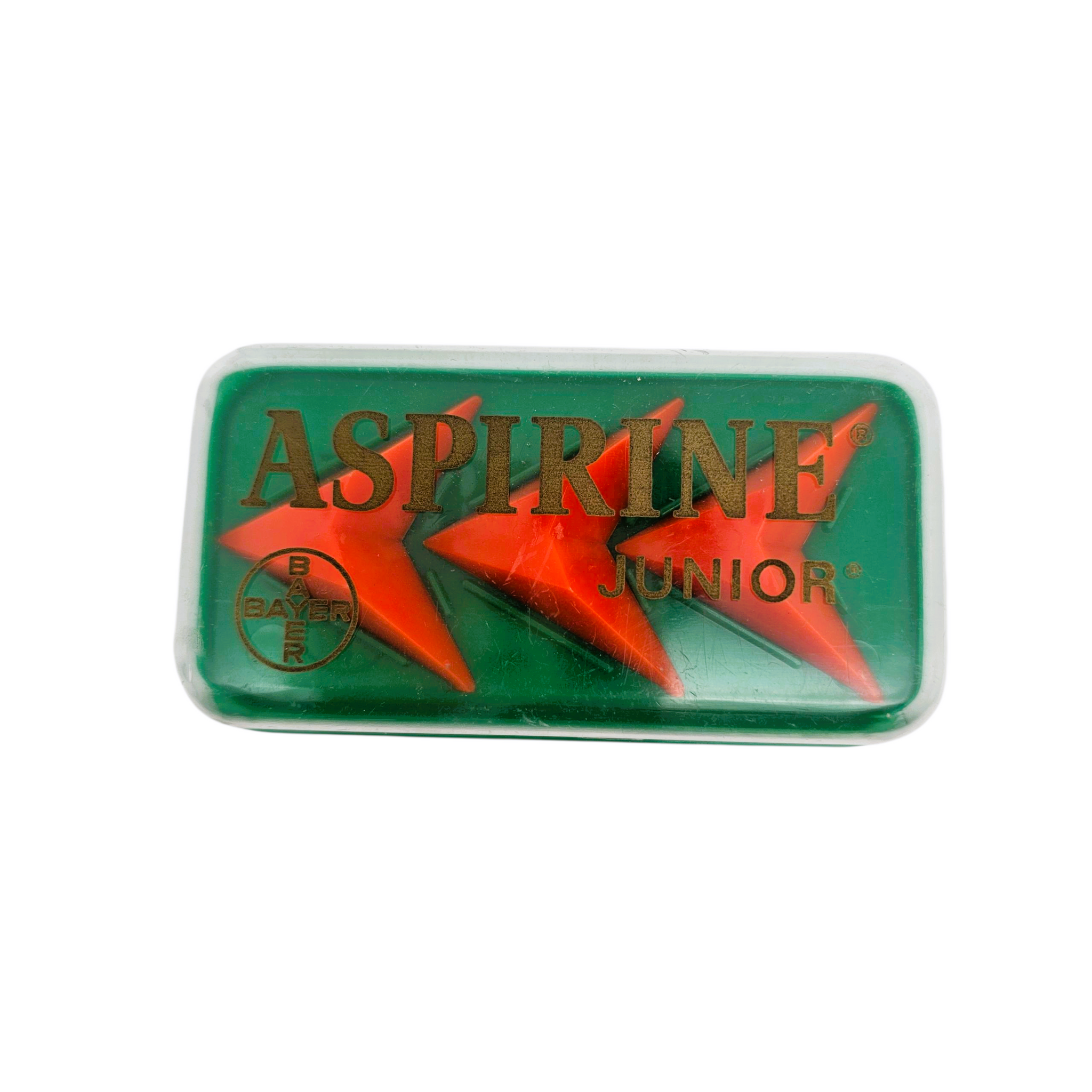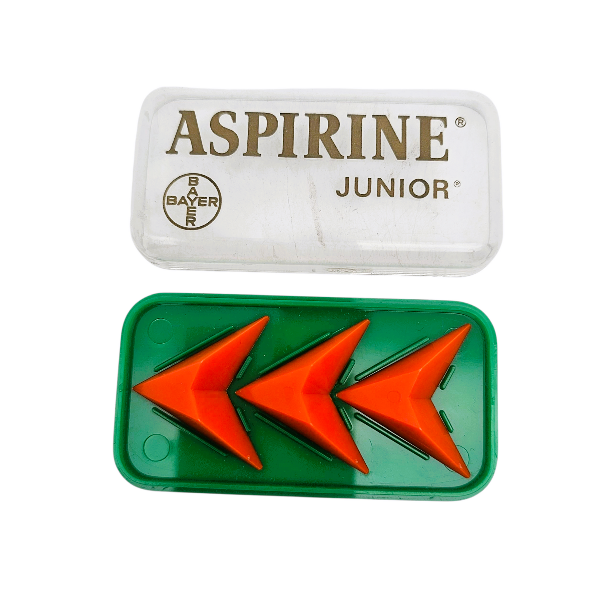 Boîte “Aspirine Junior – Bayer” en plastique vert et couvercle transparent, années 1960-1970. Contient encore ses trois supports rouges triangulaires pour comprimés.