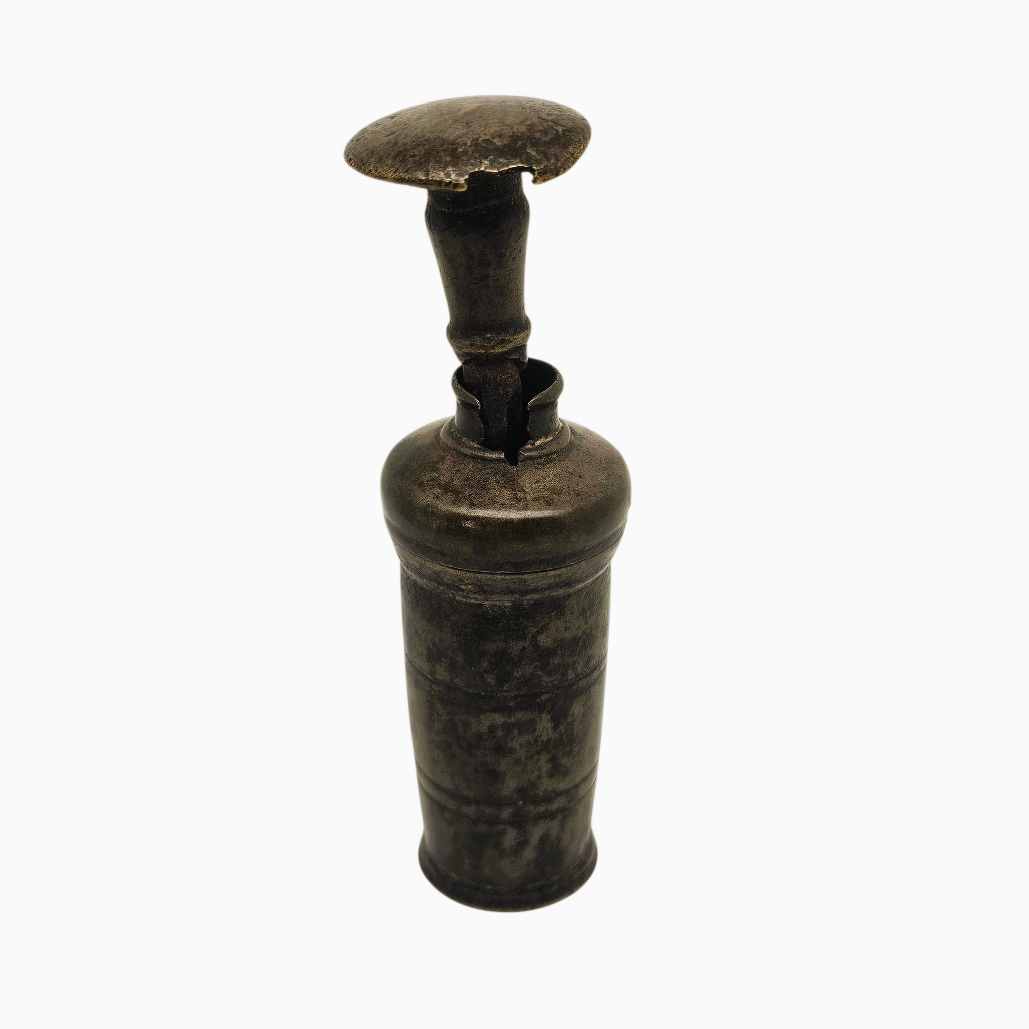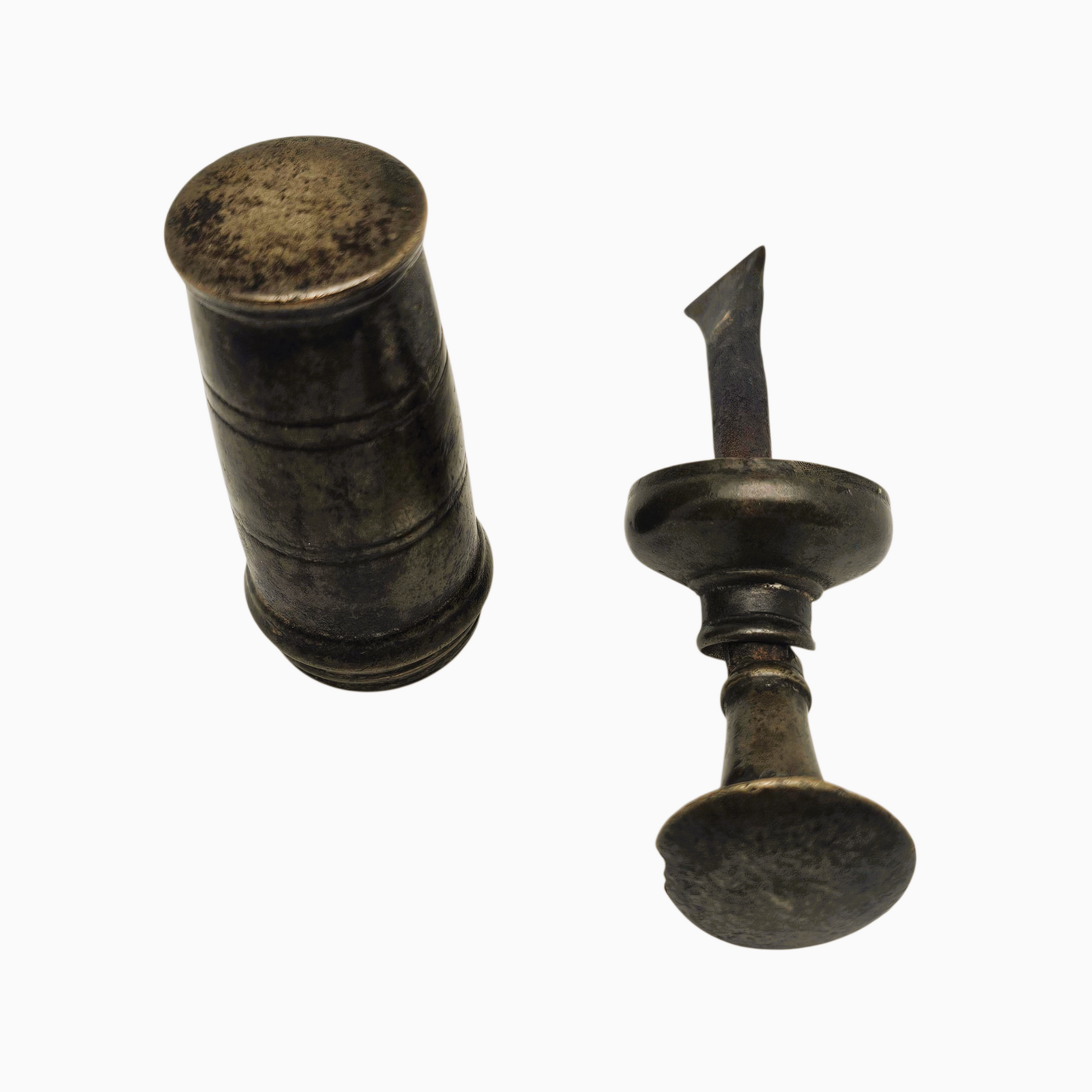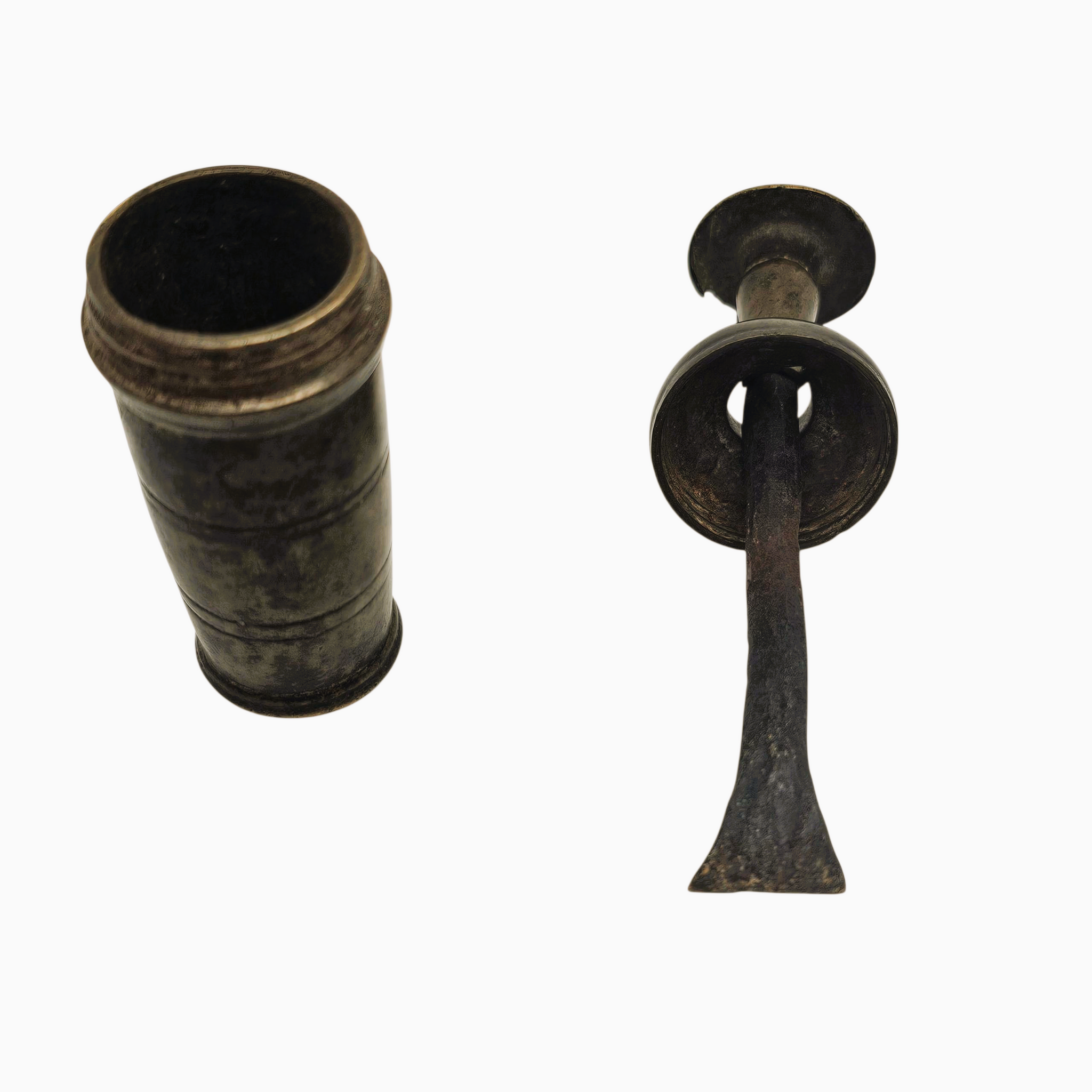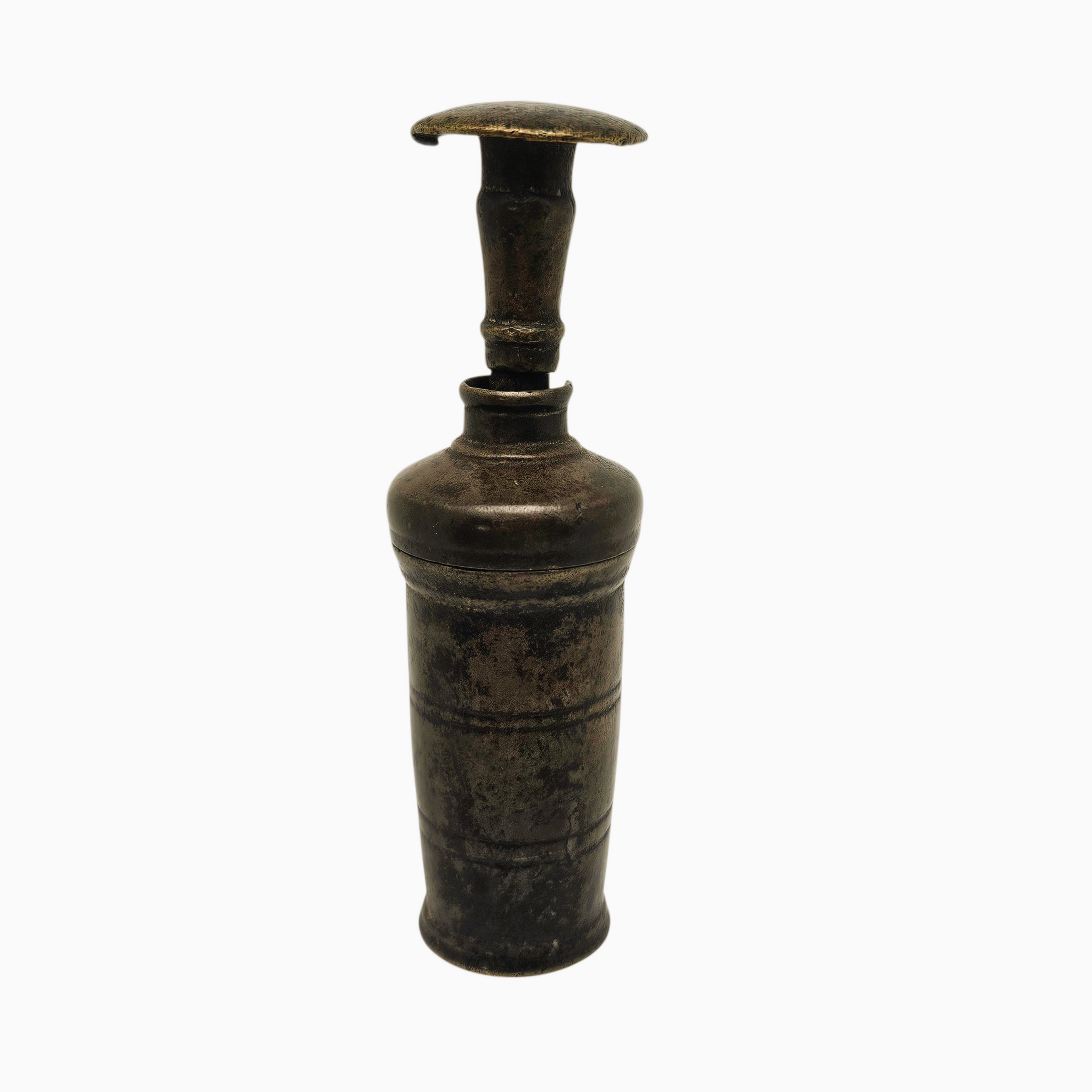Petit mortier à bétel ancien en bronze patiné, complet avec son pilon d’origine à manche bombé.
