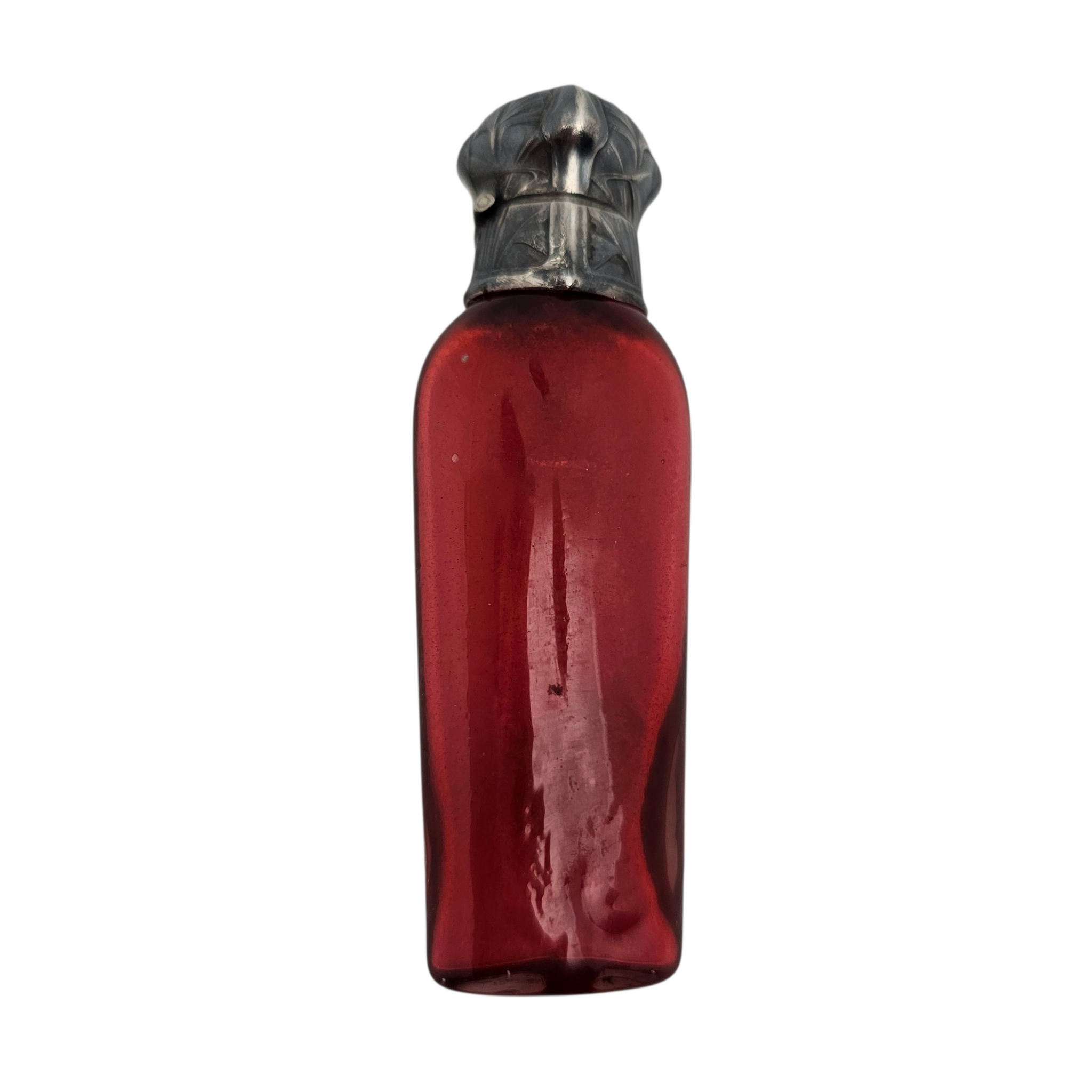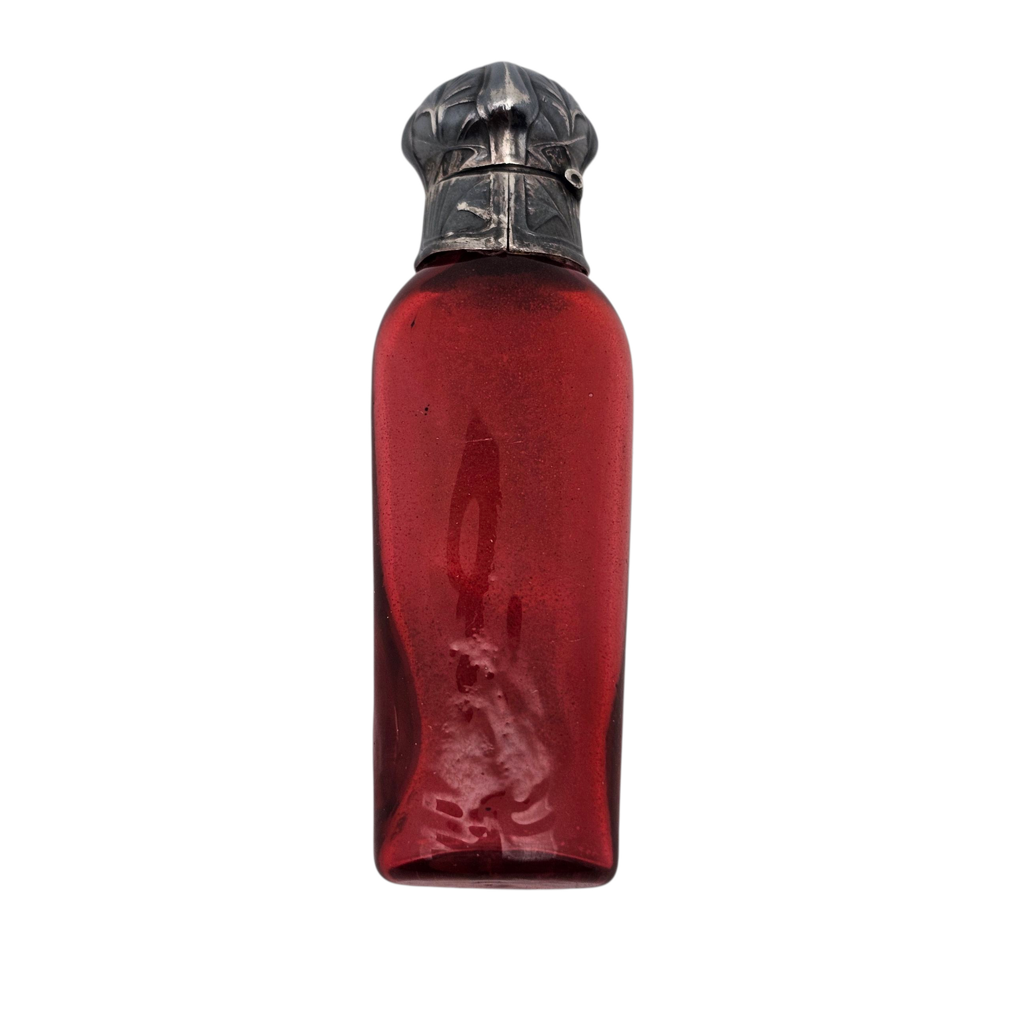 Matières : verre rouge rubis teinté dans la masse, monture en métal argenté à décor de feuillage Art nouveau