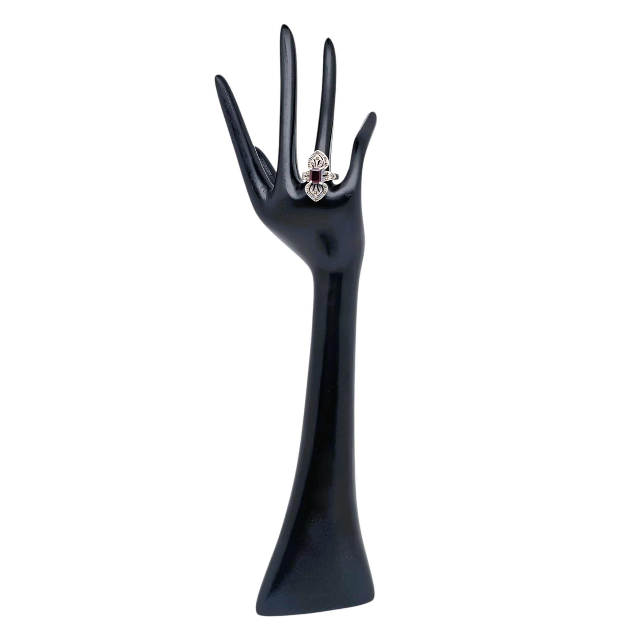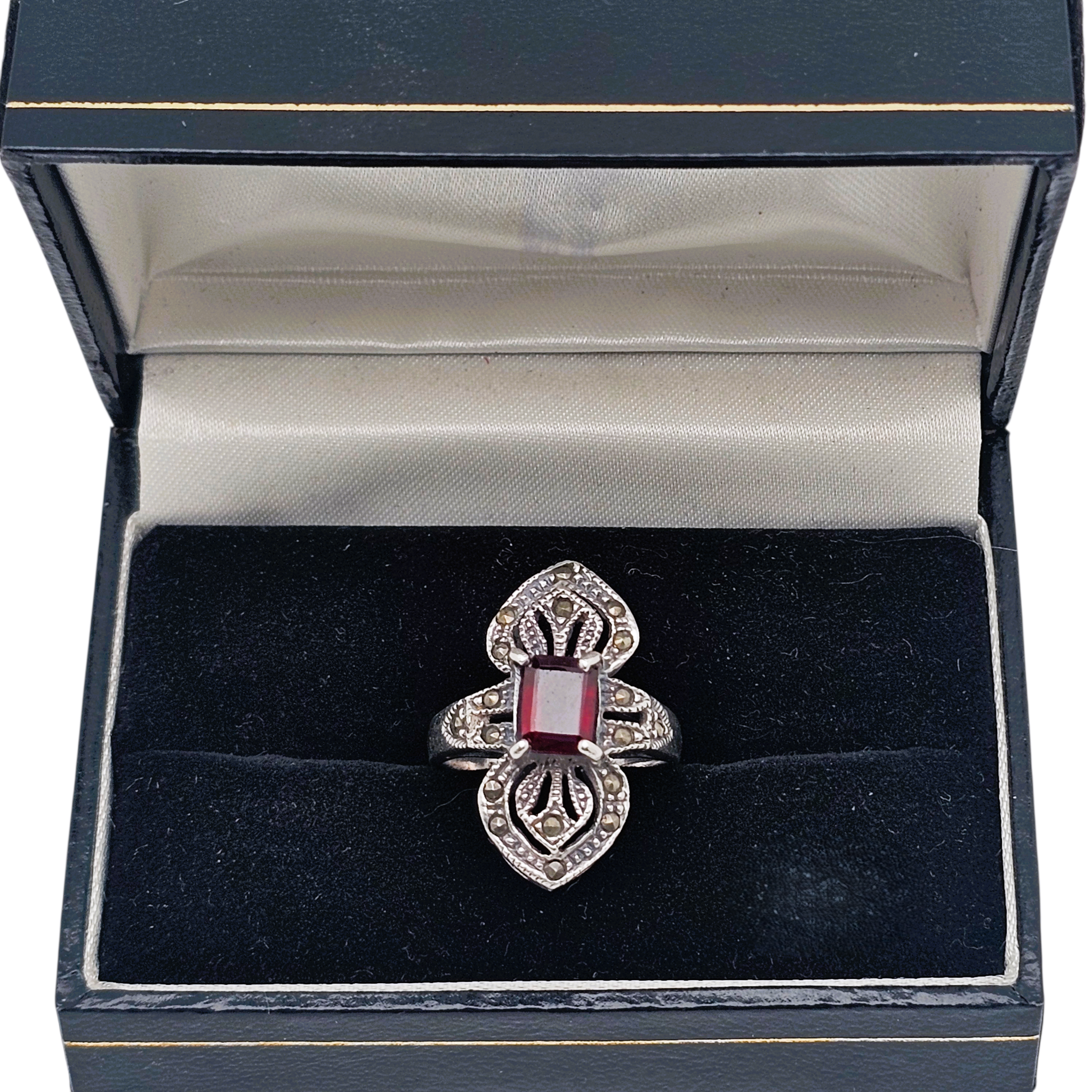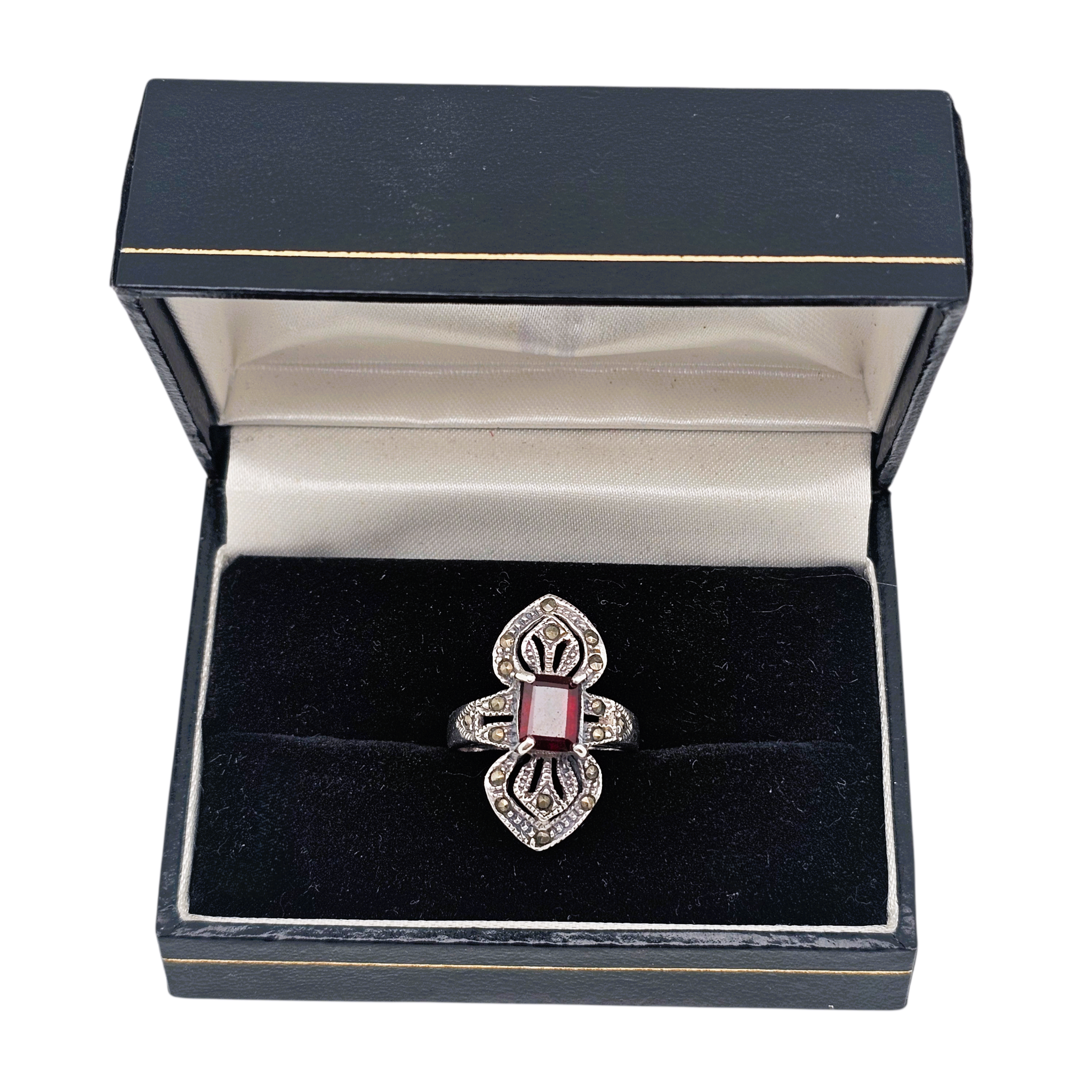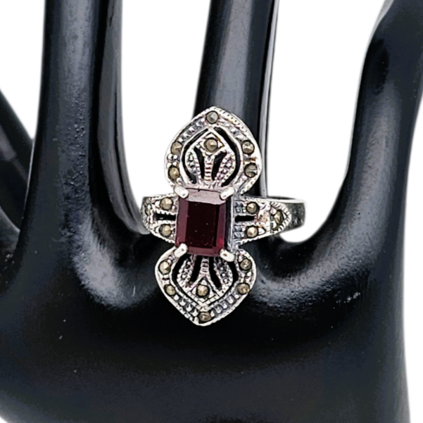 Élégante bague ancienne de style Art déco en argent, sertie d’un grenat facetté rectangulaire de taille émeraude, entouré de délicates marcassites scintillantes.