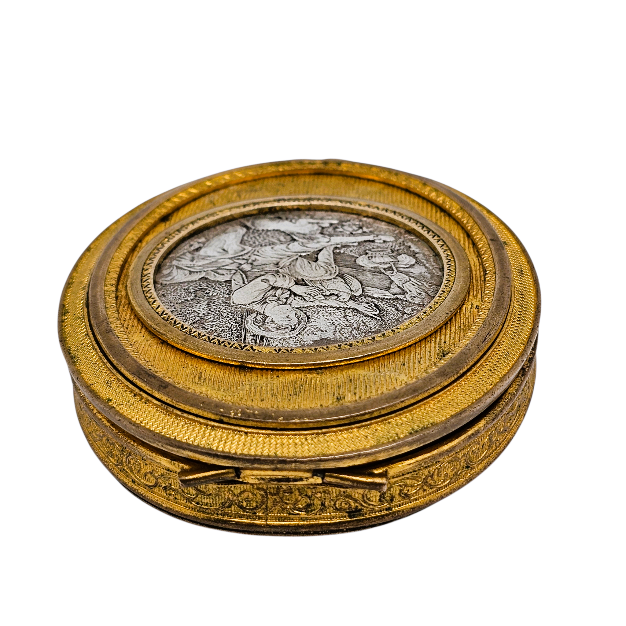 Boîte à poudre en métal doré, décor pastoral en métal argenté, circa 1820-1840