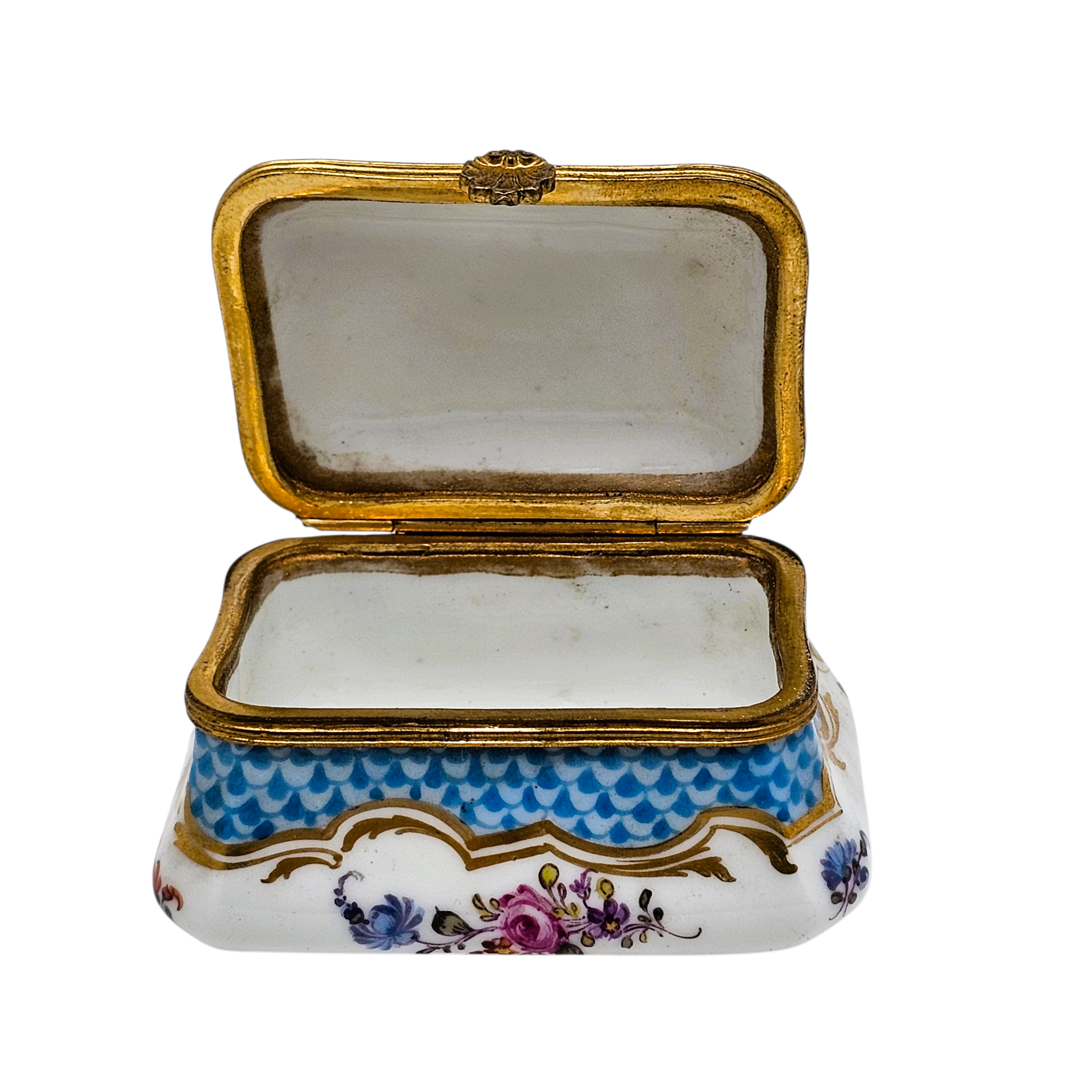 Petite boîte précieuse en porcelaine finement peinte à la main, de forme rectangulaire aux angles adoucis, reposant sur une base légèrement évasée.